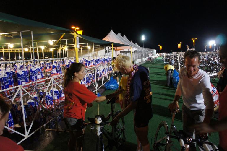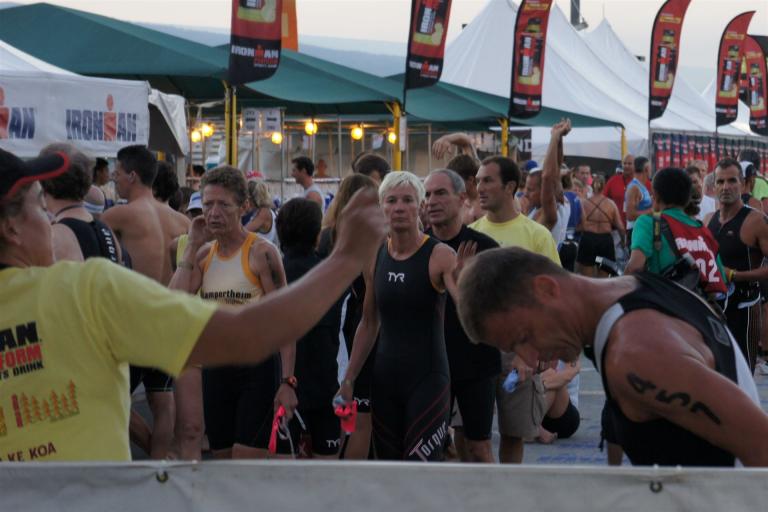 Zuerst geht es zum Bodypainting. Kaum, das man das Zelt betritt kommt schon jemand und kümmert sich. Die Oberarme werden gesäubert und dann kommt der Stempel zum Einsatz. Nach der Nummerierung wird noch der Chip geprüft dann geht es in Richtung Radwechselzone. Es laufen schon viele Athleten und Helfer geschäftig durch die Gegend. Ich gehe zu meinem Rad und Pumpe Luft auf, wenn man möchte hilft einem da auch noch jemand. Ich komme aber ganz gut alleine klar. Danach fülle ich noch die Flaschen und lege meinen Helm entsprechend hin, das war es dann.