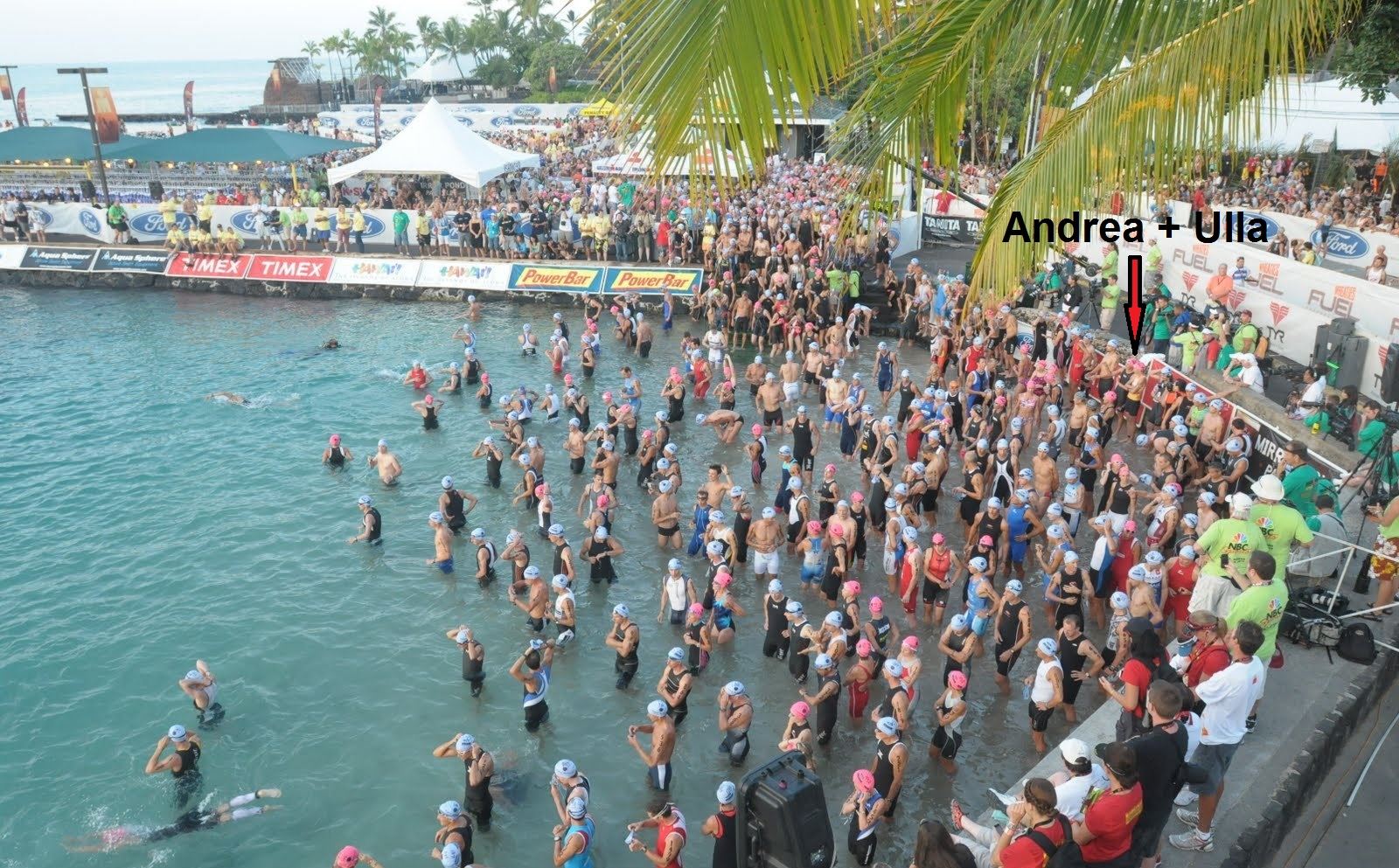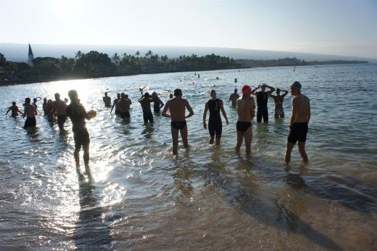Unsere innere Uhr tickt noch immer in Deutschland. Pünktlich um 3.oo Uhr haben Werner und ich ausgeschlafen. Wir liegen dann immer eine Weile wach bis wir langsam wieder einschlafen. Es ist schon beeindruckend, wenn man im Bett liegt und das Meer und die Wellen hört. Pünktlich um 6:00 Uhr klingelt der Wecker. Nach einem kurzen Frühstück packen wir unsere Schwimmsachen und dann geht es in Richtung Pier. Werner fährt mit dem Jeep und wir anderen Joggen an den Strand. Es ist Wahnsinn wie viele Leute bereits morgens in aller Frühe am Strand sind. Inzwischen gibt es auch von Ironman einen Stand an dem wir unsere Sachen abgeben können. Das ist ganz praktisch, da man keine Angst vor Diebstahl haben muss. Es gibt auch einige Triathleten, die mit dem Rad kommen.