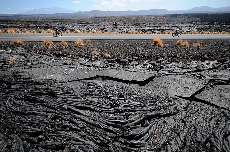 Heute machen wir uns noch einmal mit dem Jeep los. Wir wollen die alte Sattle-Road fahren. Das ist schon ein Erlebnis. Die Straße geht ständig hoch und runter. Ich fahre natürlich etwas schneller als erlaubt um das ganz noch etwas zu steigern. Man fährt die Straße entlang und es geht so steil hoch, dass man in Richtung Himmel schaut und man den weiteren Straßenverlauf nicht erkennen kann. Irgendwann ist man oben angekommen und schlagartig geht es abwärts. Das Gefühl ist ähnlich wie in einer Achterbahn. Der Magen geht ständig nach oben und unten. Werner muss ganz schön kämpfen. Ich denke, als Beifahrer ist das ganze noch schlimmer. Die Straße ist einfach nur Erlebnis pur. Wir fahren quer über die Insel auf die andere Seite Richtung Hilo. Dort gibt es noch einen schönen Weg der durch einen Dschungel verläuft. Die Pflanzen sind beeindruckend. Die Brücken in dieser Gegen sind sehr schmal, da kann immer nur ein Auto fahren. Ich bin froh, dass wir uns noch diese Gegend angeschaut haben. Die Pflanzen sind schon sehr beeindruckend. Dann schauen wir uns noch die Wasserfälle an. An den Bändchen kann man auch dort den ein- oder anderen Triathleten erkennen. Danach geht es wieder über die Sattle Road in Richtung Heimat. Unterwegs fahren wir noch ein Stück den Mauna Loa hoch. Der Berg ist über 4.000 Meter hoch.