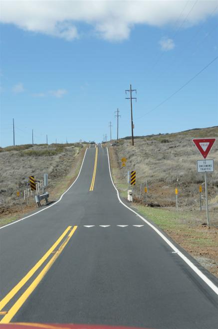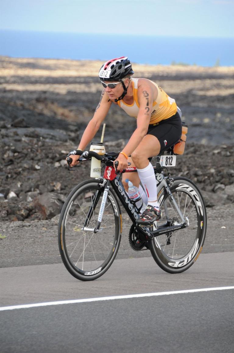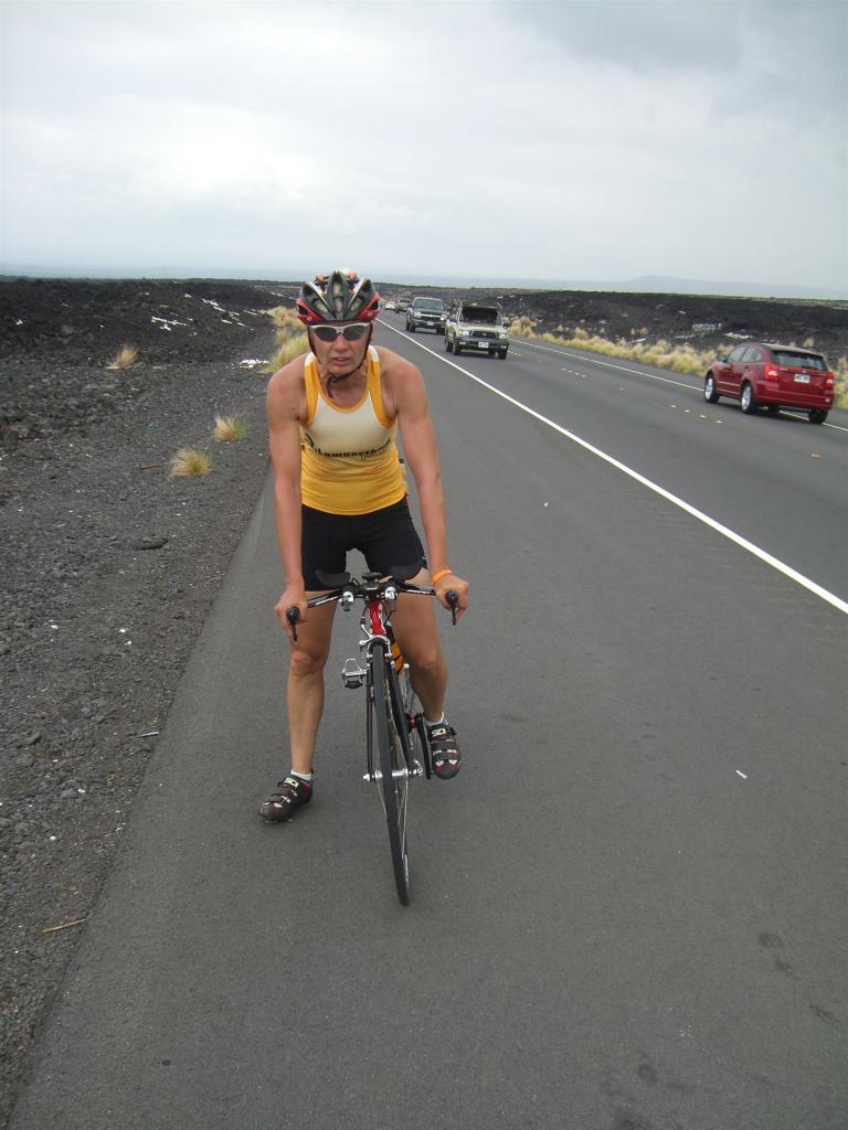 Jetzt heißt es tapfer weitertreten und den Lenker festhalten. Teilweise sind die Böen so stark, dass das Rad um einen Meter versetzt. Für mich geht es jedoch einigermaßen, da ich bereits Sonntags meine Erfahrung mit dem Wind gemacht habe. Ich kann relativ gut mit diesen Böen umgehen. Problematisch ist lediglich ab und an das Trinken bzw. Schalten. Je nach dem, wie stark die Böen gerade sind lasse ich beides ausfallen. Es ist jedoch beruhigend, dass Männer wie Frauen mit dem Wind kämpfen. Dann kommt der Wendepunkt und man weiß genau, dass dieser besch… Wind wieder kommt. Man fährt jetzt mehr abwärts und daher auch schneller, der Wind ist jedoch derselbe. Ich motiviere mich indem ich mir sage weitertreten und Lenker festhalten. Und siehe da, es funktioniert. Nach dem wir wieder rechts in Richtung Kona abbiegen ist der furchtbare Seitenwind vorüber. Jetzt bläst er lediglich von vorne. Ich schaue ab und an auf meinen Tacho und bin bestürzt, dass ich keine Geschwindigkeit bekommen. Aber es ist beruhigend, dass es den anderen ebenso geht. Man soll es nicht glauben, aber dieser Gegenwind bleibt die ganze Strecke über. Teilweise gibt es noch ein paar Anstiege, die man sich hoch kämpft.