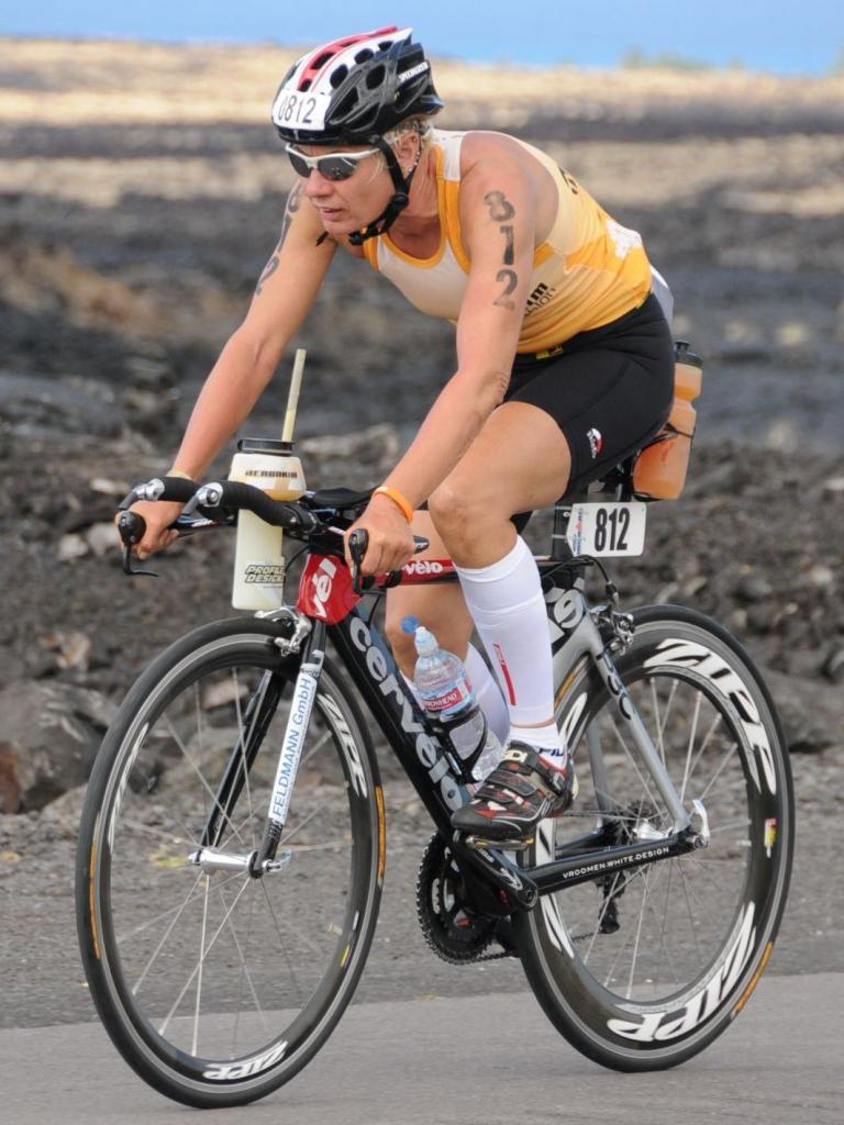 ich schwimme einfach so vor mich in. Langsam höre ich Geräusche vom Land. Das Publikum feuert die Athleten an, das kann man vom Wasser aus hören. Es dauert aber noch eine ganze Weile bis wir endlich an Land kommen. An der Treppe stehen einige Helfer, die einem aus dem Wasser helfen. Dann schnell unter die Dusche, den Anzug ausziehen und abduschen. Wobei hier Dusche zu viel gesagt ist, es hängen einfach einige Schläuche runter, von denen man sich einen greifen kann und dann abduschen. Inzwischen kann ich hören, wie meine Start-Nr. 812 gerufen wird. Ich laufe in Richtung Säcke, da wird mir bereits mein Beutel gereicht. Die Frauen dirigieren mich in Richtung Umkleidezelt. Dort nimmt mich eine Frau in Empfang und schiebt mich auf einen Stuhl und schüttet meinen Sack aus. Sie hilft mir beim anziehen der Socken, stellt meine Schuhe hin und bindet mir die Start-Nr. um. Dann setzt Sie mir die Brille auf und dirigiert mich in Richtung Sonnencreme. Aber irgendwie ist dann etwas schief gelaufen. Ich will noch meinen Schwimmanzug in den Beutel tun, aber die Dame und der Beutel sind verschwunden. Es gibt keinen Wettkampf an dem mir nicht irgend etwas passiert. Ich schaue mich hilfesuchend um, kann jedoch meinen Beutel nicht finden. Gott sei Dank kommt eine Helferin und fragt nach meinem Bad. Ich antworte „I don’t know“. Ich gebe ihr meinen Schwimmanzug sowie Brille und Bademütze und nenne ihr meine Startnummer danach laufe ich einfach los, in der Hoffnung, dass diese Frau alles regeln wird. Schnell noch etwas Sonnencreme auf den Rücken und dann nichts wie los. Die Strecke zwischen Umkleidezelt und Rad ist relativ lange. Ich muss aufpassen, dass ich mit meinen Radschuhen nicht hinfalle. Am Ausgang steige ich aufs Rad, Walter Seelinger kommt zeitgleich mit mir aufs Rad. Dann geht es auf den Radkurs. Erst wird eine Runde durch die Stadt gefahren, bevor es auf den Highway geht. Die Lampertheimer Fangemeinde hat sich an der Radstrecke postiert und jubelt uns zu. Nach der Stadtrunde geht es auf den Highway. Die Fans am Rand nehmen ab und die Landschaft wird eintöniger. Im Abstand von 10 Meilen gibt es regelmäßig Verpflegungsstellen. Die Leute an der Verpflegung geben sich große Mühe. Sie laufen ggf. ein ganzes Stück mit damit man die Flaschen greifen kann. Ich versuche immer eine Flasche Powerbar zum trinken und eine Flasche Wasser zum kühlen zu greifen. Ich hätte nicht gedacht, dass man doch so viel kühlt. Am Anfang habe ich etwas Rückenprobleme auf dem Rad, keine Ahnung woher die kommen. Ich versuche die Schmerzen zu ignorieren und irgendwann hört das ganze auch auf. Auf dem Highway ist es doch relativ warm, der Asphalt strahlt auch noch die Hitze ab. Die ersten 75 km laufen relativ gut. Es ist schon toll, dass die Verpflegung relativ dicht ist. Man kann sich wirklich super versorgen. Dann kommen uns bereits die ersten Profis entgegen. Leider kann ich nicht erkennen, wer als erster vorne fährt. Ich erkenne Marino und Timo. Hellriegel habe ich auch gesehen. Bei den Frauen ist Chrissie Wellington nicht vorne. Später erfahre ich, dass sie gar nicht gestartet ist. Dann kommen die letzten 15 km in Richtung Harwe zum Wendepunkt. Wie bereits vermutet kommt jetzt der hinterhältige Wind.