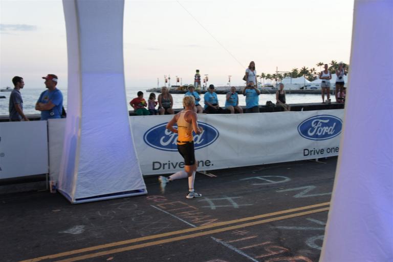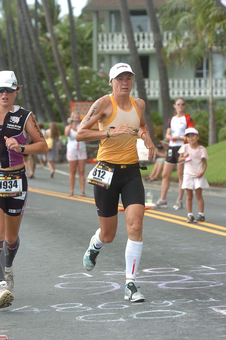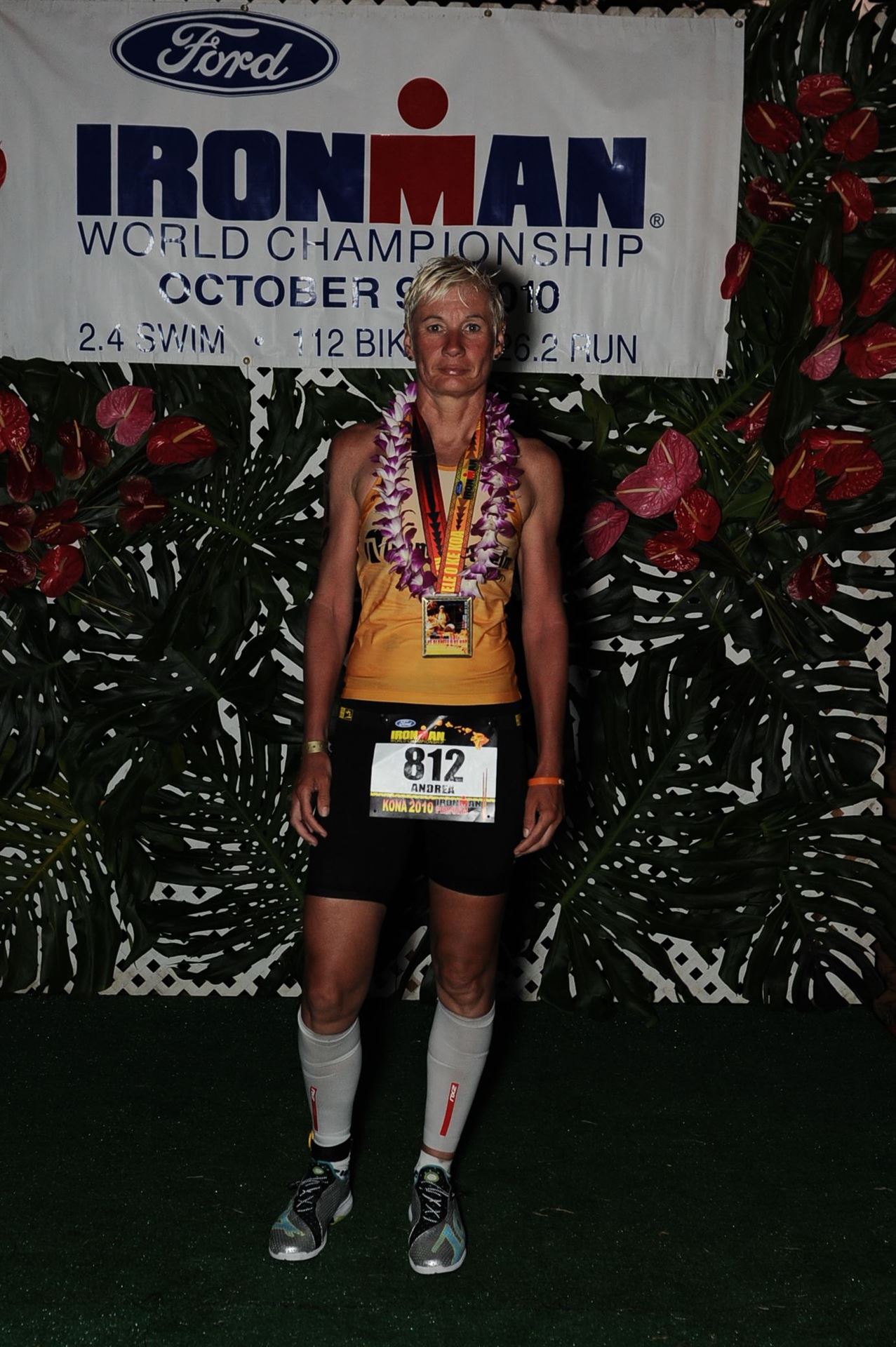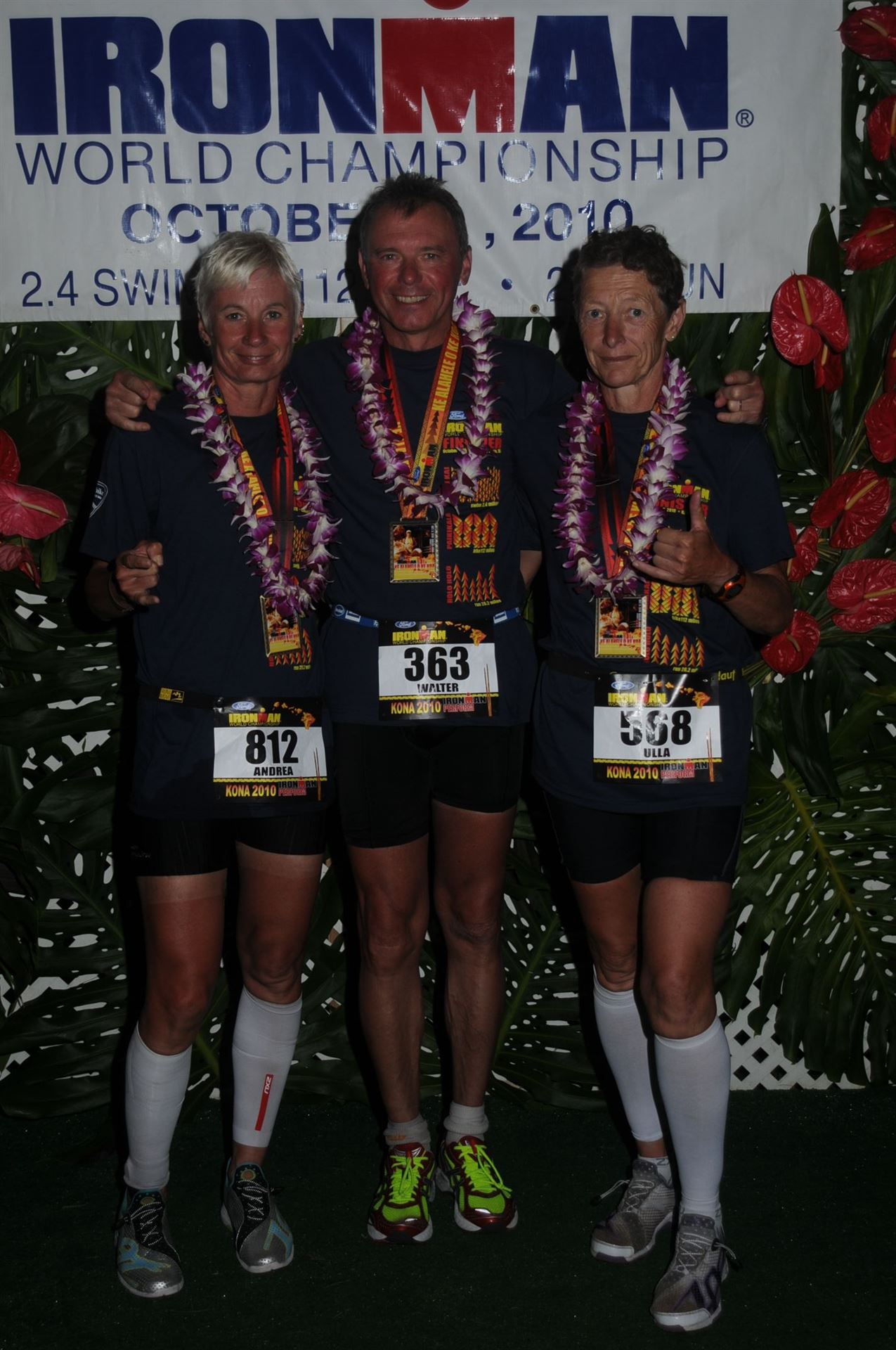 Aufgrund der Wärme, die Sonne strahlt unbarmherzig beschließe ich, nicht am Limit zu laufen. Da ich nicht weiß, wie mein Körper das Klima verkraftet, gehe ich lieber auf Nummer sicher. Ich wähle ein für mich angenehmes Tempo und laufe nun von Verpflegungsstelle zu Verpflegungsstelle. An jeder Verpflegung halte ich an und trinke etwas, ich denke das ist sehr wichtig für den Körper. Ansonsten nehme ich alle greifbaren Schwämme und fülle mir Eiswürfel unter die Mütze. Diese leichte Abkühlung ist eine Wohltat. Irgendwann komme ich auf die Idee und schütte die Eiswürfel ebenfalls in mein Trikot. Bei jedem Schritt macht das Eis lustige Geräusche. Auf der Laufstrecke in Kona sind relativ viele Leute am Straßenrand. Viele rufen die Startnummer und feuern mich an. Ich kann jeden Meter dieses Laufes genießen. Ich fühle mich vom ersten Meter an gut und bin auch zuversichtlich, dass ich ins Ziel komme. Dann geht es auf den Highway. Hier gibt es keinerlei Schatten mehr, der Asphalt strahlt die Hitze ab. Jetzt muss ich „nur“ noch bis zum Energy Lab und wieder zurücklaufen. Das sind nur noch ca. 17 Meilen. Aber es stört mich in keinster Weise. Ich freue mich, winke den Zuschauern zu und versuche möglichst viele Leute zu überholen. Mein Magen fängt leider an etwas zu rebellieren, daher trinke ist vorerst fast nichts und kühle nur von außen. Ich hoffe, das geht vorüber. Während ich raus laufe kommen mir auch viele Leute entgegen. Einige gehen, sie können nicht mehr laufen. Manche Athleten, die ich überhole, rufen mir zu „good job“ das finde ich super nett. Unterwegs steht auch Hannes mit seinen Leuten und machen Party. Da läuft man gleich wieder viel leichter. Dann kommt die Abbiegung zum Energy Lab. Hier ist auch eine tolle Stimmung. Es ist jedoch noch ein langes Stück zum Meer und dann geht es noch einmal rechts ab. Am Wendepunkt stehen 3-4 Männer und feuern die Leute an. Ich tanze etwas mit ihnen und jubel ihnen zu, die freuen sich total. So, jetzt heißt es nur noch zurücklaufen. Nur noch, es sind sicherlich noch 12-13 km. Aber was ist das schon. Mir geht es gut ich fühl mich sauwohl. Wieder auf dem Highway angelangt läuft mir Walter entgegen. Es geht ihm ebenfalls gut er winkt und ruft mir zu. Jetzt habe ich das Gefühl ich bin auf dem Heimweg. Bei den Verpflegungsstellen stehen sie inzwischen mit großen kalten Wasserflaschen da und fragen, ob sie einem Wasser über den Kopf schütten sollen. Ich bin dankbar für jede Abkühlung und sage nicht nein. Vor mir läuft ein junger Mann, auf einmal bleibt er stehen, die Beine ganz starr. Er hat einen furchtbaren Krampf. Ich frage ihn, ob ich ihm helfen kann, er winkt jedoch nur ab und sagt, ich soll weiterlaufen. Die Strecke zurück zieht sich dann doch noch. Ich halte noch immer an jeder Verpflegungsstelle an, ich gehe auf Nummer sicher. Unterwegs hatte mal mein rechter Oberschenkel etwas weh getan, aber das ging irgendwie wieder weg. Ein Radfahrer fährt ein Stück auf dem Highway neben mir her und ruft Lampertheim Go. Es ist ein Deutscher der mich anfeuert. Er meinte ich wäre sicherlich ein Daylight Finisher. Ich rufe ihm zu, dass ich keine Ahnung habe, da ich keine Uhr dabei habe. Er meinte nur, du bist sicherlich noch bei Tageslicht im Ziel. Auf dem letzten Stück habe ich eine Frau ca. in meinem Alter überholt. Sie hat mir zugerufen „good job“ und sich an mich drangehängt. Wir sind dann eine ganz Zeit zusammen gelaufen. Das fand ich sehr angenehm. Irgendwann hat sie abreißen lassen, ich hab dann etwas langsam gemacht und gesagt, sie solle doch mit weiterlaufen. Sie meinte dann, nein sie kann nicht mehr so schnell und dann bedankte sie sich noch, dass ich sie mitgezogen habe. Dann kommt lediglich noch ein Anstieg auf dem Highway, wobei man inzwischen jeden Höhenmeter in den Knochen merkt. Wieder in Kona angekommen geht es nur noch die Palani Road runter. Abwärts laufen ist inzwischen auch nicht mehr so angenehm. Jetzt noch ein Quadrat laufen. Hier überhole ich noch einige. Es sitzen noch immer viele Zuschauer am Straßenrand und rufen einem zu, dass man gleich im Ziel ist. Auf dem Ali Drive nehme ich Tempo raus und genieße jeden Meter. Ganz viele Leute jubeln mit zu, rufen meine Startnummer oder meinen Namen und klatschen mich ab. Das Gefühl ist unbeschreiblich. Inzwischen kann ich hören, wie der Sprecher bereits meinen Namen, Nation…..und ähnliches ruft. Jetzt sind es nur noch ein paar Meter und ich bin im Ziel. Es geht mir super gut und ich weiß schon jetzt, dass wenn ich die Möglichkeit habe, wieder nach Hawaii kommen werde. Im Ziel bekommt man Blumen und ein Handtuch umgehängt. Eine Betreuerin kümmert sich um mich und führt mich nach hinten. Ich sage ihr, dass es mir gut geht und ich nach meinem Mann suche. Sie fragt mich noch mehrmals ob alles in Ordnung ist bevor sie mich alleine lässt. In der Menge erkenne ich dann auch schon Werner. Er ist super stolz auf mich. Erstaunlicherweise habe ich sofort Lust auf Cola und Pizza. Was ich dann auch in mich rein stopfe. Ich hole noch mein Finisher Shirt und meine Urkunde ab. Zum Nachtisch esse ich noch Vanille-Eis. Das einzige was mir weh tut sind die Füße. Durch die nassen Schuhe und Strümpfe (es war ja alles klatsch nass, da ich ja ständig Wasser über mich geschüttet habe) habe ich mir einige Blasen sogar auf den Fußsohlen gelaufen. Ich lasse noch ein Foto mit der Medaille machen und ein Foto noch zusammen mit Werner. Nach und nach kommen Walter und Ulla ins Ziel. Es geht beiden auch sehr gut. Wir lassen noch ein Foto von uns dreien machen. Dann holen wir unsere Sachen und fahren mit den Rädern zurück ins Hotel. Es war ein unvergesslicher Tag.