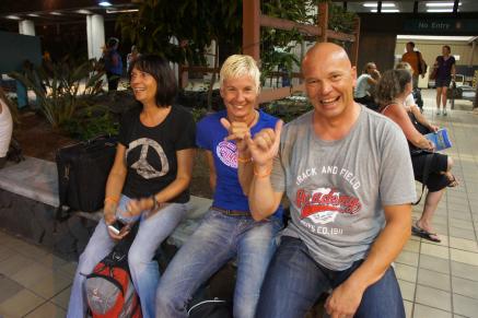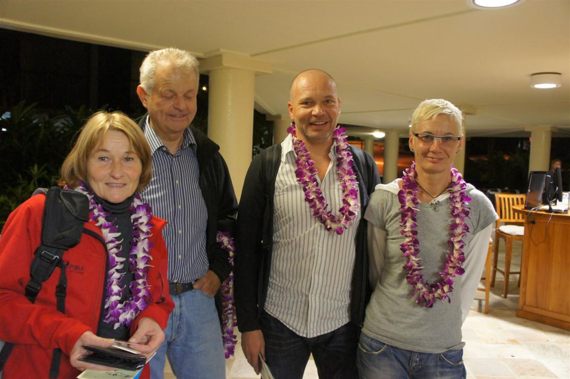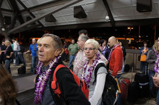 Hannes war bereits vor Ort und hat alle Leute begrüßt. Jeder bekam eine Hawaiiblumenkette und die Reiseunterlagen. Jetzt nur noch hoffen, dass alle Gepäckstücke angekommen sind. Wir hatten Glück, es war alles da.
