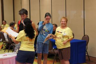 Die Nacht war wie immer zweigeteilt. Pünktlich um 3.00 Uhr wachen wir beide auf. Jedoch ist es jetzt nicht mehr ganz so schlimm, da wir inzwischen relativ schnell wieder einschlafen. Um 6:oo Uhr ist wieder aufstehen angesagt. Nach einem kurzen Frühstück cruisen wir ganz cool mit dem Jeep zum Pier. Inzwischen ist alles voll, es sind hunderte von Leuten am Wasser. Es geht wieder rein ins Wasser und einmal bis zur letzten Boje und wieder zurück. Nach dem schwimmen kurz abduschen und anziehen. Ab 9:00 Uhr kann man sich registrieren. Es ist bereits eine Schlange vor der Registrierung. Werner darf nicht mit in den Saal, es ist lediglich für die Athleten erlaubt. Da unser deutscher Startpass für USA nicht gilt müssen wir eine Tageslizenz für US Dollar 10,- kaufen. Die machen wirklich mit allem Geld. Die Registrierung läuft sehr geordnet ab.