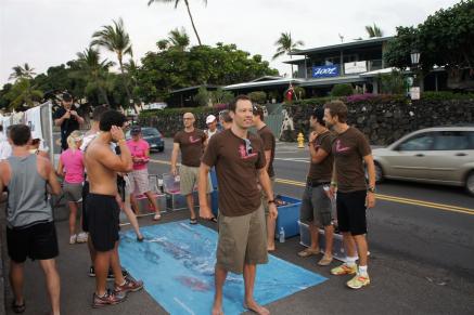 Werner schaut sich zum x-ten mal alle möglichen Fahrräder an. Am Cervelostand bekommt jeder, der ein Bild von sich und seinem Cervelo-Rad hat ein T-Shirt. Wie schön, ich habe ein Bild von mir. Werner schafft es auch ein Shirt zu bekommen. Ich glaube das ist inzwischen das 5. T-Shirt, das ich erhalten habe. Nach eine kleiner Runde schlendern fahren wir wieder zurück zum Hotel. Jetzt werden die Beutel für das Einchecken morgen gepackt und das Rad fertiggemacht. Die Nummer muss gut sichtbar angebracht werden. Es gibt auch noch einen schicken Ironman Aufkleber fürs Rad, der wird jetzt wahrscheinlich lebenslang auf dem Rad bleiben. Werner macht sich wie immer viele Gedanken wie er was an mein Rad anbringt. Ich bin da ziemlich relaxt und mache mir nicht so einen Kopf. Aber egal, dafür habe ich Werner, der kümmert sich um solche Dinge. Ich merke auch, dass er langsam nervös wird. Gott sei Dank bin ich total ruhig, sonst würde das mit uns beiden nicht funktionieren. Um 18.00 Uhr gibt es dann die Nudelparty. Es gibt 3 verschiedene Eingänge. VIP’s, Athleten und Sonstige. Bereits um 17.30 Uhr gibt es schon eine riesige Schlange. Als dann endlich der Eingang öffnet geht es relativ schnell. Die Nudelparty findet unter freiem Himmel statt. Das Essen ist ganz lecker. Danach gibt es typische Hawaianische Aufführungen. Die Renndirektion stellt sich vor und der jüngste und älteste weibliche und männliche Teilnehmer werden vorgestellt. Um 20:00 Uhr ist das ganze Spektakel vorbei und es geht zurück ins Hotel. Gegen 21.00 Uhr zieht es uns schon wieder ins Bett.
