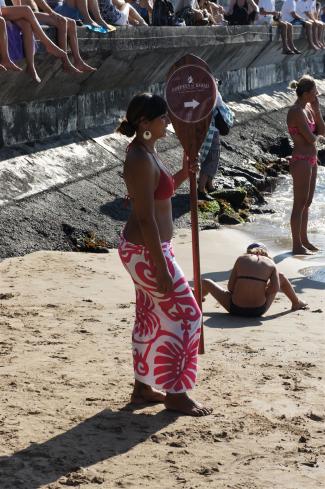 Heute sind wir wegen einem T-Shirt von Biestmilch tatsächlich noch etwas früher aufgestanden. Ich denke, normal ist anders. Wir sind bereits sehr früh zum Pier gefahren, da man mit einem Biestmilch Tattoo ein T-Shirt von Biestmilch erhalten hat. Ob man dieses T-Shirt unbedingt braucht sei dahingestellt. Heute ist es noch voller. Da ich heute Ruhetag habe möchte ich lediglich mit Werner zum Kaffeeschiff schwimmen. Es ist noch sehr früh, das Schiff ist noch nicht da. Ich schwimme schon mal eine kleine Runde alleine. Während ich so locker vor mich herschwimme sehe ich unter mir tatsächlich 2 Fische, der eine ca. 80 cm und der andere sicherlich 1 Meter groß. Ich halte extra noch einmal an und schaue mir die zwei noch einmal genau an. Die haben Ähnlichkeit mit Haifischen, keine Ahnung was das für Fische sind. Es bereitet mir auch keine Sorgen. Inzwischen ist das Kaffeeschiff vor Anker gegangen und Werner und ich machen uns auf den Weg zu einem Kaffee im Wasser. Ich finde, das sollte jeder der auf Hawaii ist auch mal mitmachen. Ich musste Werner ganz schön bearbeiten, bis er bereit war zum Schiff zu schwimmen. Natürlich macht es einen Unterschied ob man in einem See schwimmt oder im Meer. Ich versichere ihm, dass ich bei ihm bleibe und notfalls auch retten werde (keine Ahnung ob ich das könnte). Wir schwimmen also gemütlich zum Schiff und lassen uns einen Kaffee geben. Danach muss man schauen, das kein Wasser in den Kaffee schwappt und wie man den Kaffee am besten genießen kann. Ich bin mir nicht sicher, ob Werner diesen Kaffee tatsächlich genießen kann. Ich finde es einfach nur gut. Da ich bereits mehrmals am Kaffeeschiff war, bin ich auch etwas geübter. Ansonsten gab es wieder einen schönen Wellengang. Nach dem Schwimmen haben wir uns noch die Unterwäscheparade angeschaut. Da sind schon schräge Gestalten dabei. Danach geht es zurück zum Apartment zum Frühstück. Gegen Mittag, wie sollte es auch anders ein fahren wir noch einmal auf die Ausstellung.