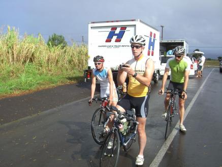 Noch immer werden wir nachts um 3.00 Uhr wach, wir haben uns noch nicht an die neue Zeit gewöhnt. Um 5:30 klingelt heute der Wecker, da wir eine Radausfahrt mit Hannes Hawaii Tours machen wollen. Wir treffend uns um 7:00 Uhr bei Hannes. Dort werden die Fahrräder in LKW’s geladen. Uns ist nicht ganz mulmig, als wir mein Rad im LKW sehen. Aber was solls, die machen das nicht zum ersten Mal. Die Leute werden auf 2 Busse verteilt und dann geht es ab in Richtung Mahukona, zum Radwendepunkt. Bereits auf der Hinfahrt können wir sehen, dass der Wind relativ stark ist. Als wir am Wendepunkt ankommen sind dunkle Wolken da und es fängt stark an zu regnen. Nach ein paar Minuten ist der Schauer vorbei und es werden die Räder ausgeladen