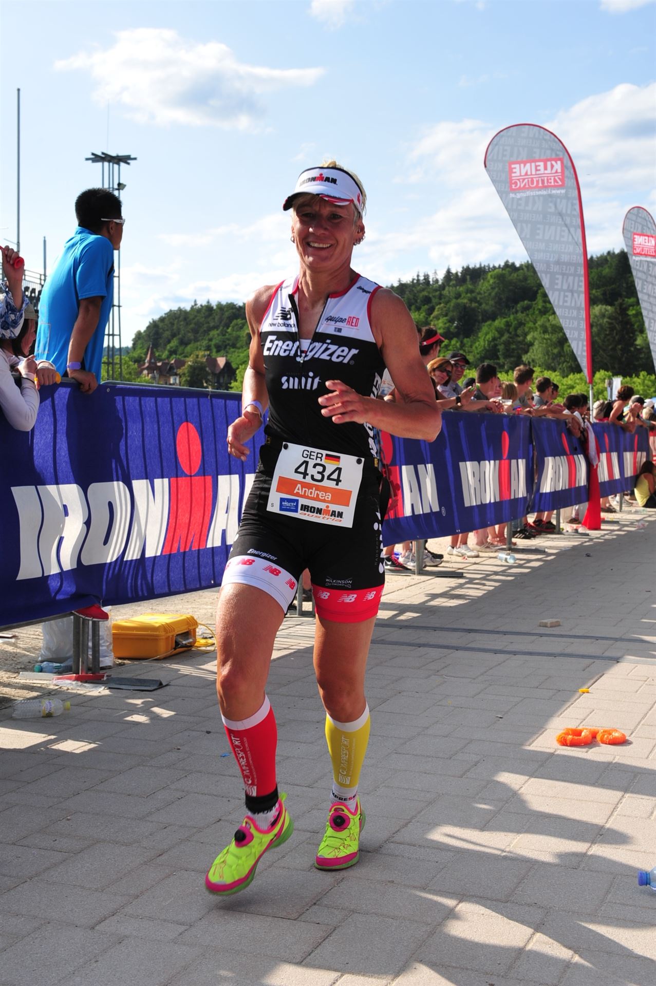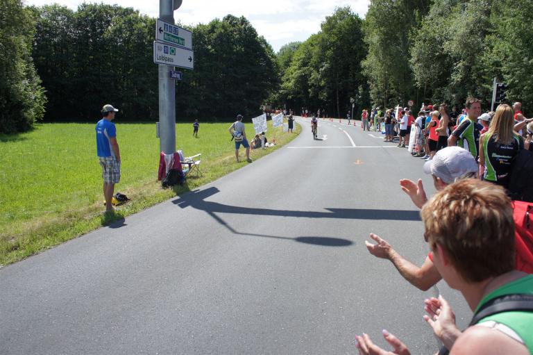 Auch hier gibt es viele Fans an der Strecke. Der DJ feuert mich mit der Bemerkung "Ironlady" an, ich kurble den Berg hoch.