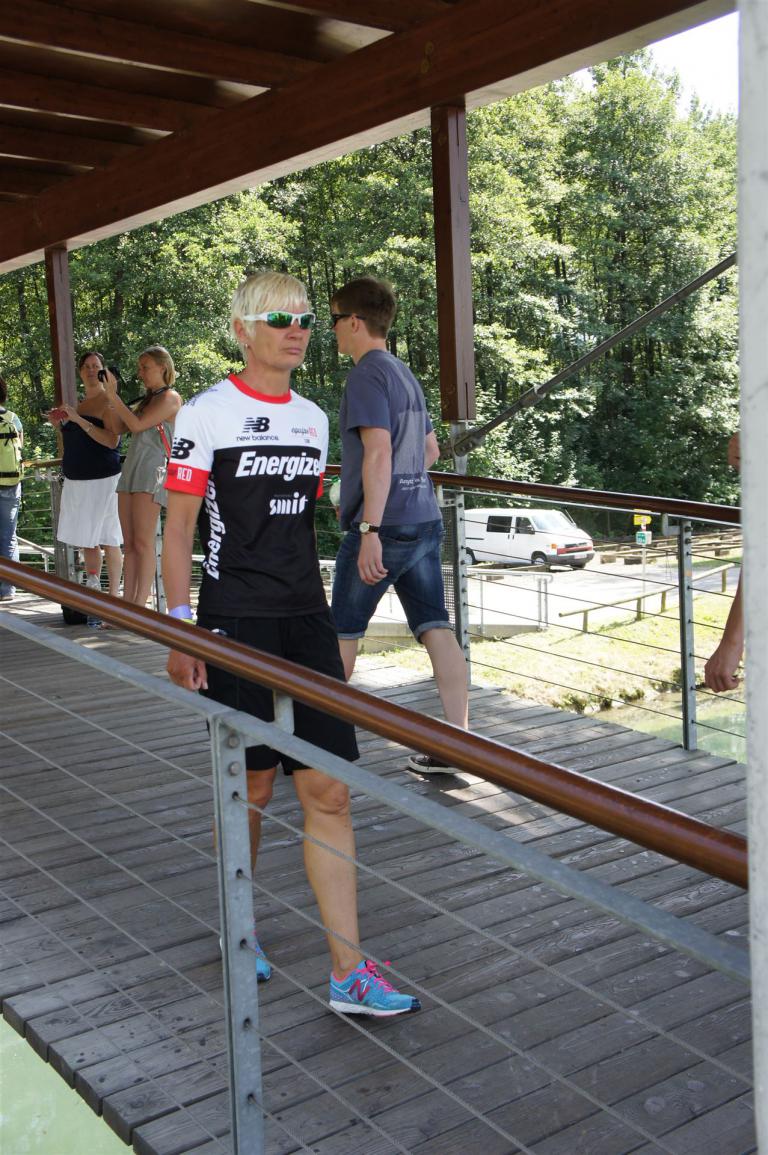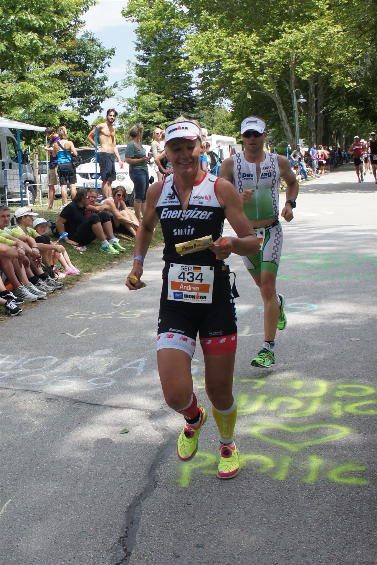 Das Wetter ist prima, die Temperatur liegt bei ca. 26 Grad im Schatten. Es werden 2 Runde á 21 km gelaufen. Von der Wechselzone geht es am Anfang entlang der Lende in Richtung Krumpendorf. In Krumpendorf läuft man eine kurze Strecke durchs Schwimmbad. Es ist schon etwas ungewöhnlich die Badegäste auf den Grünanlagen liegen zu sehen. Danach geht es entlang der Lende nach Klagenfurt Stadtmitte. Einmal um das Wahrzeichen, den Lindwurm herum und wieder zurück in Richtung Ziel. Die Strecke ist sehr abwechslungsreich, es stehen viele Freunde, Familie und Zuschauer an der Strecke. Aufgrund des Gegenverkehrs der anderen Läufer hat man immer etwas zu schauen. Das Anfeuern durch die Zuschauer puscht jeden Athleten. Die Schmerzen sind alle vergessen, man genießt die tolle Stimmung. Auf der 2. Runde habe ich leichte Probleme mit den Oberschenkeln und den Waden. Ich lasse mich davon jedoch nicht beirren, einfach nur weiterlaufen. Die Unterführung nach Klagenfurt sowie die Bordsteinkanten in der Stadtmitte bereiten mir etwas Probleme, aber egal, da macht man einfach etwas langsam.