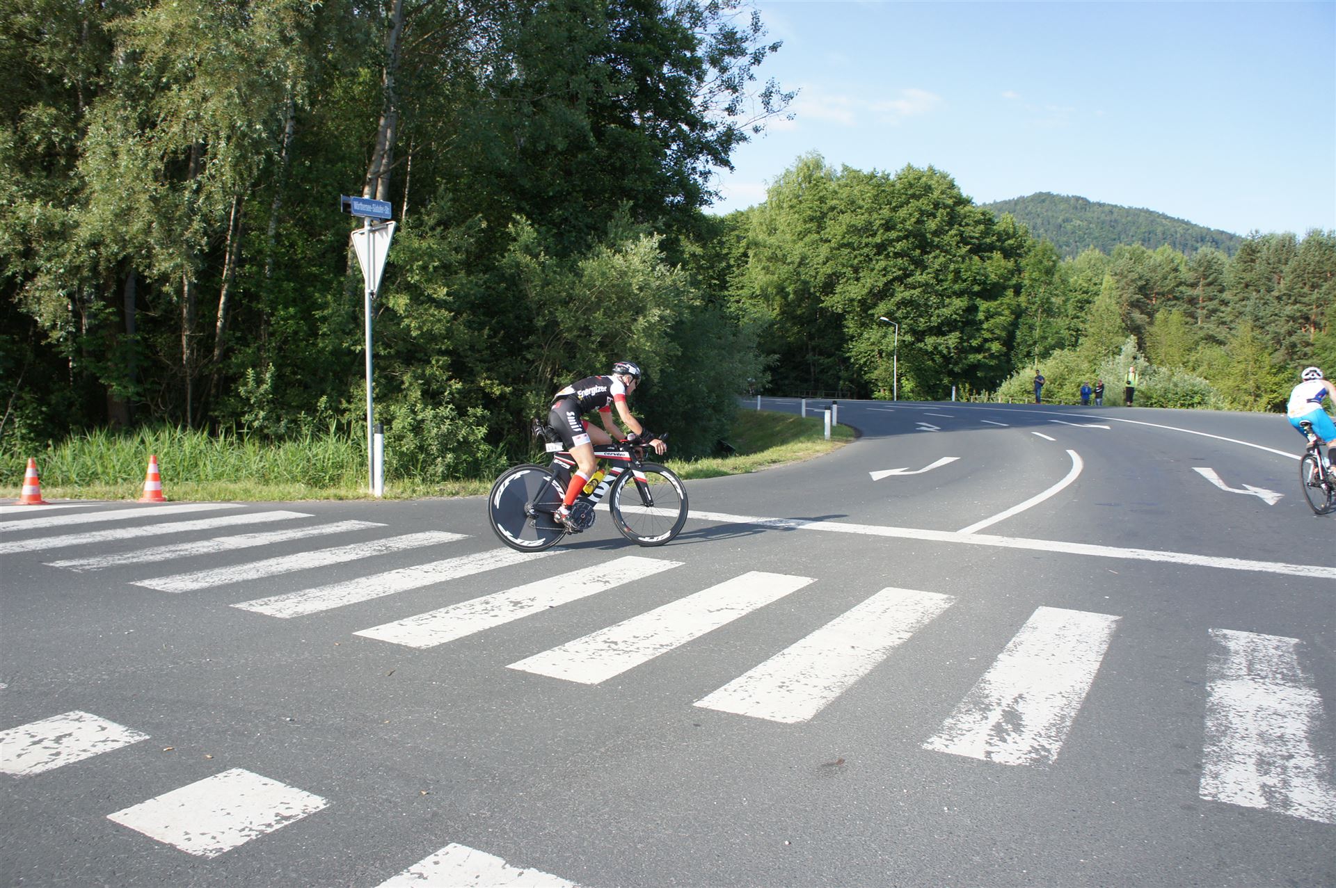 Auf der ersten Runde sind relativ viele Triathleten unterwegs. Es ist mitunter nicht so einfach, keinen Windschatten des Vordermannes zu nutzen. In der 2. Runde hat sich das Feld etwas auseinander gezogen, so dass man etwas entspannter fahren kann.