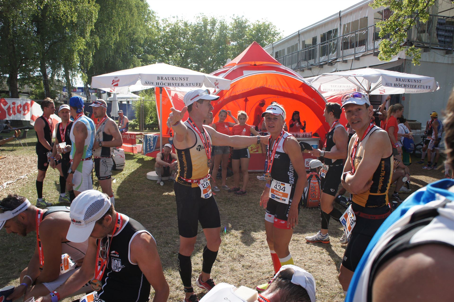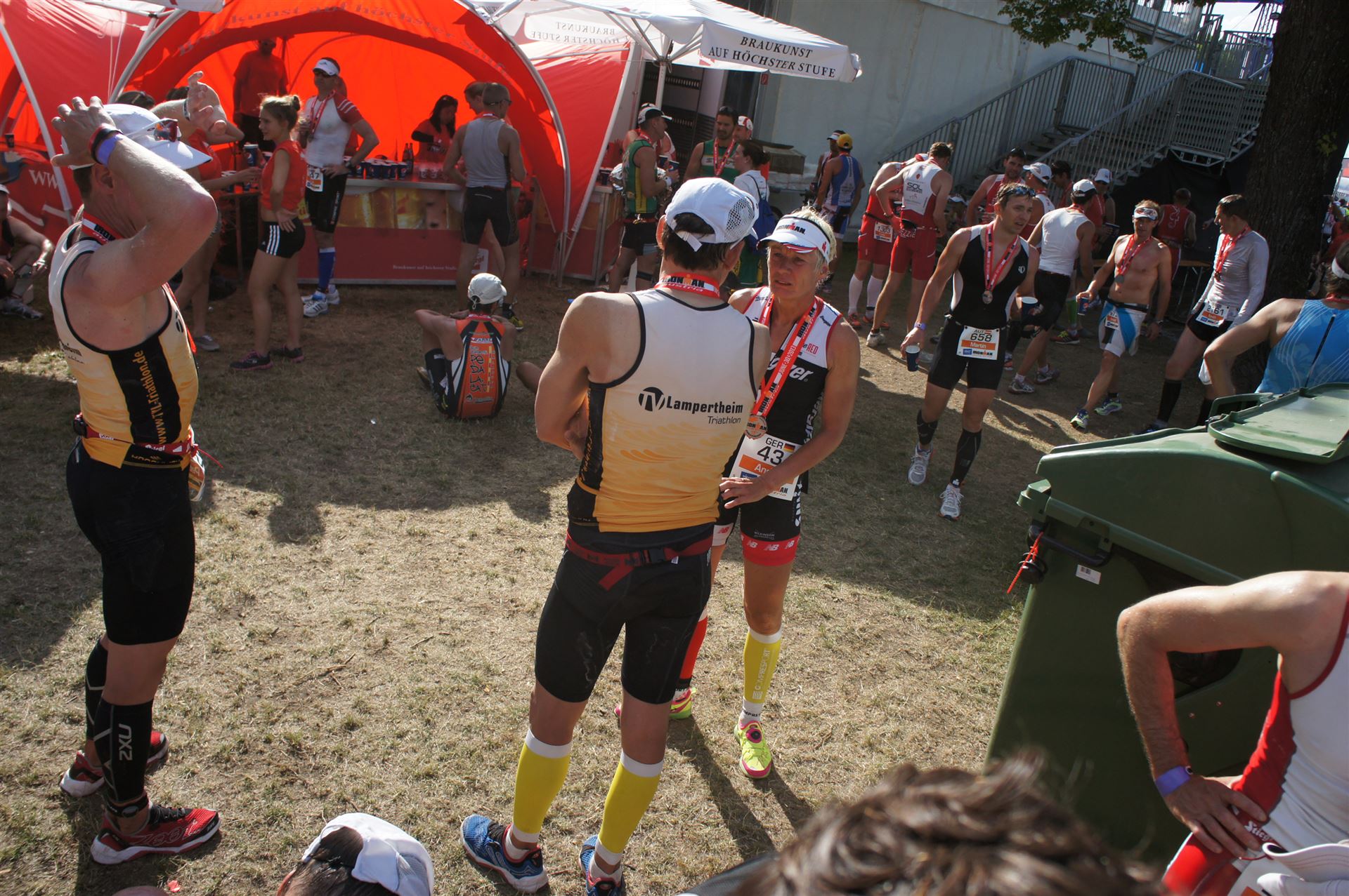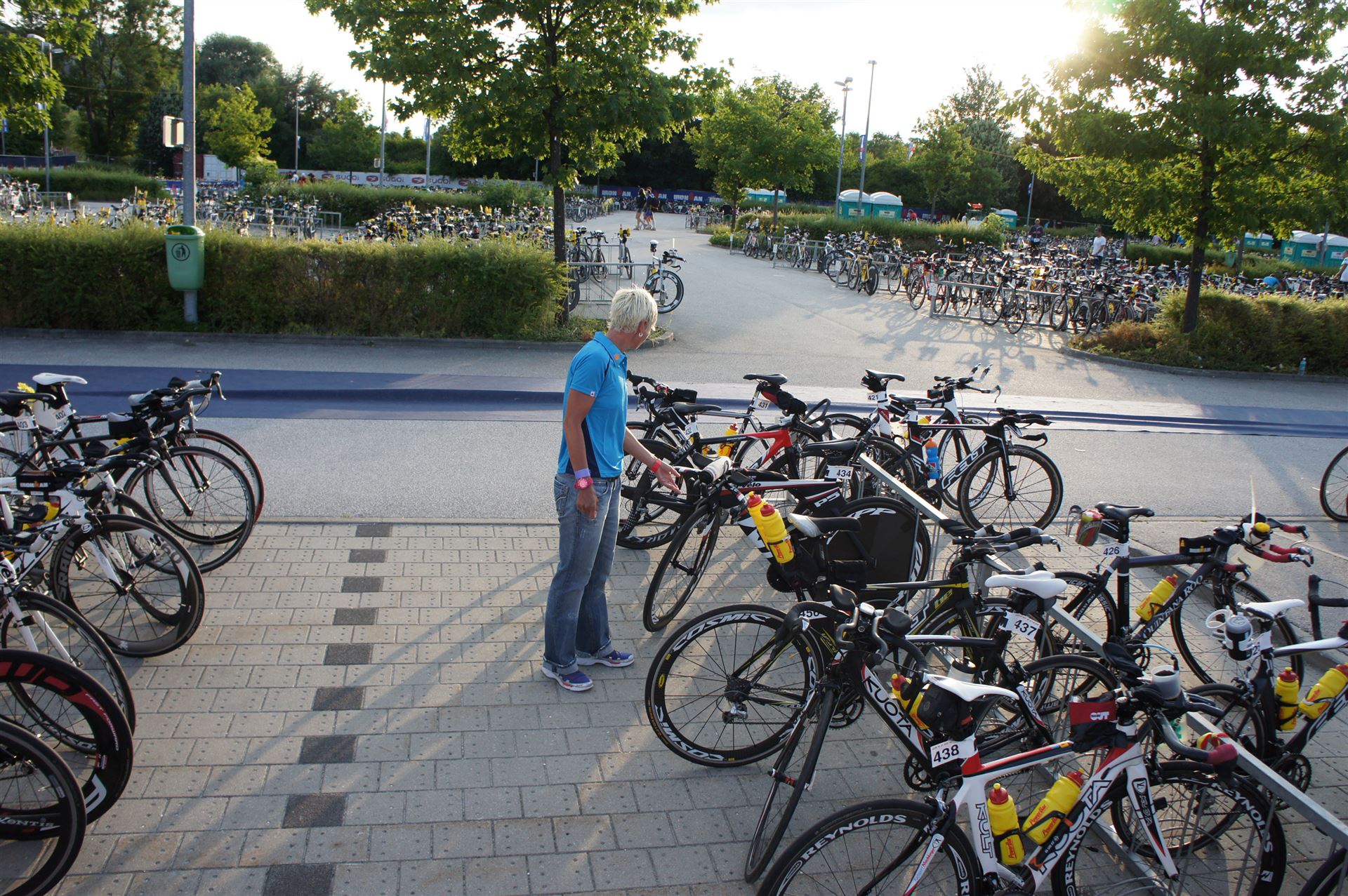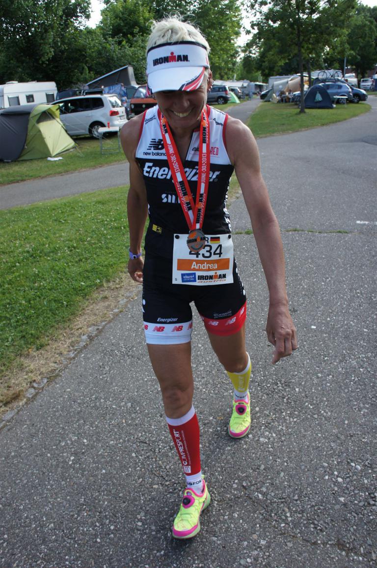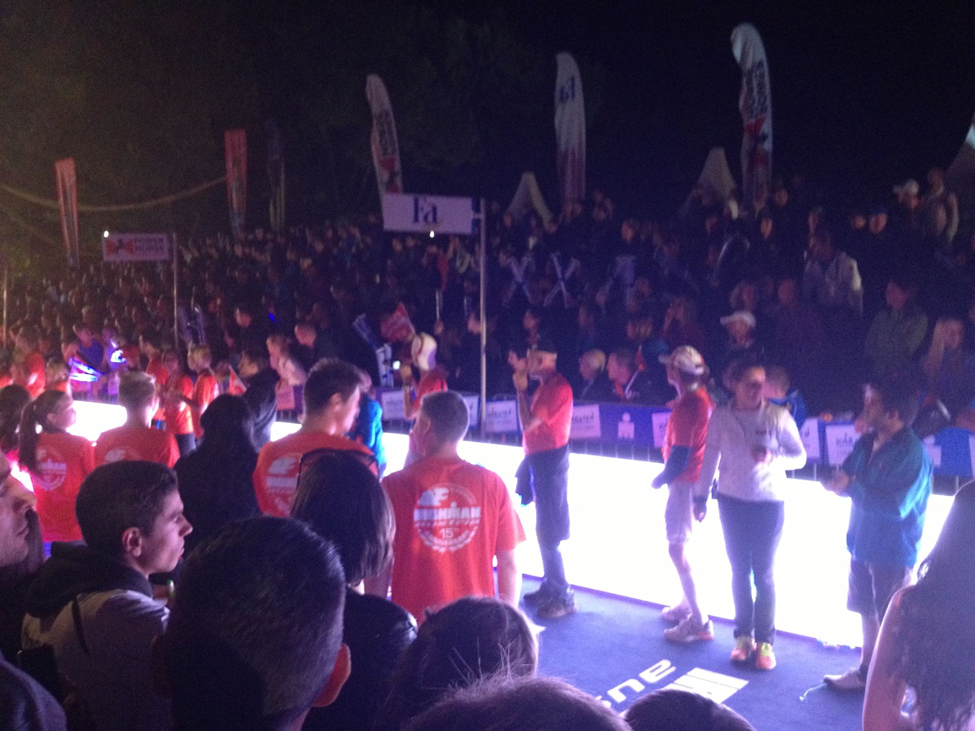 Ich bin geduscht, etwas essen kann ich an diesem Tag nichts mehr. Mein Rad sowie meine übrige Kleidung habe ich bereits aus der Wechselzone geholt. Es geht wieder zurück an die Finisherline. Die Stimmung ist gigantisch. Jeder einzelne Athlet wird von den Moderatoren und vom Publikum begrüßt. Der Zieleinlauf ist bis 00:00 Uhr geöffnet, danach gibt es noch ein Feuerwerk.