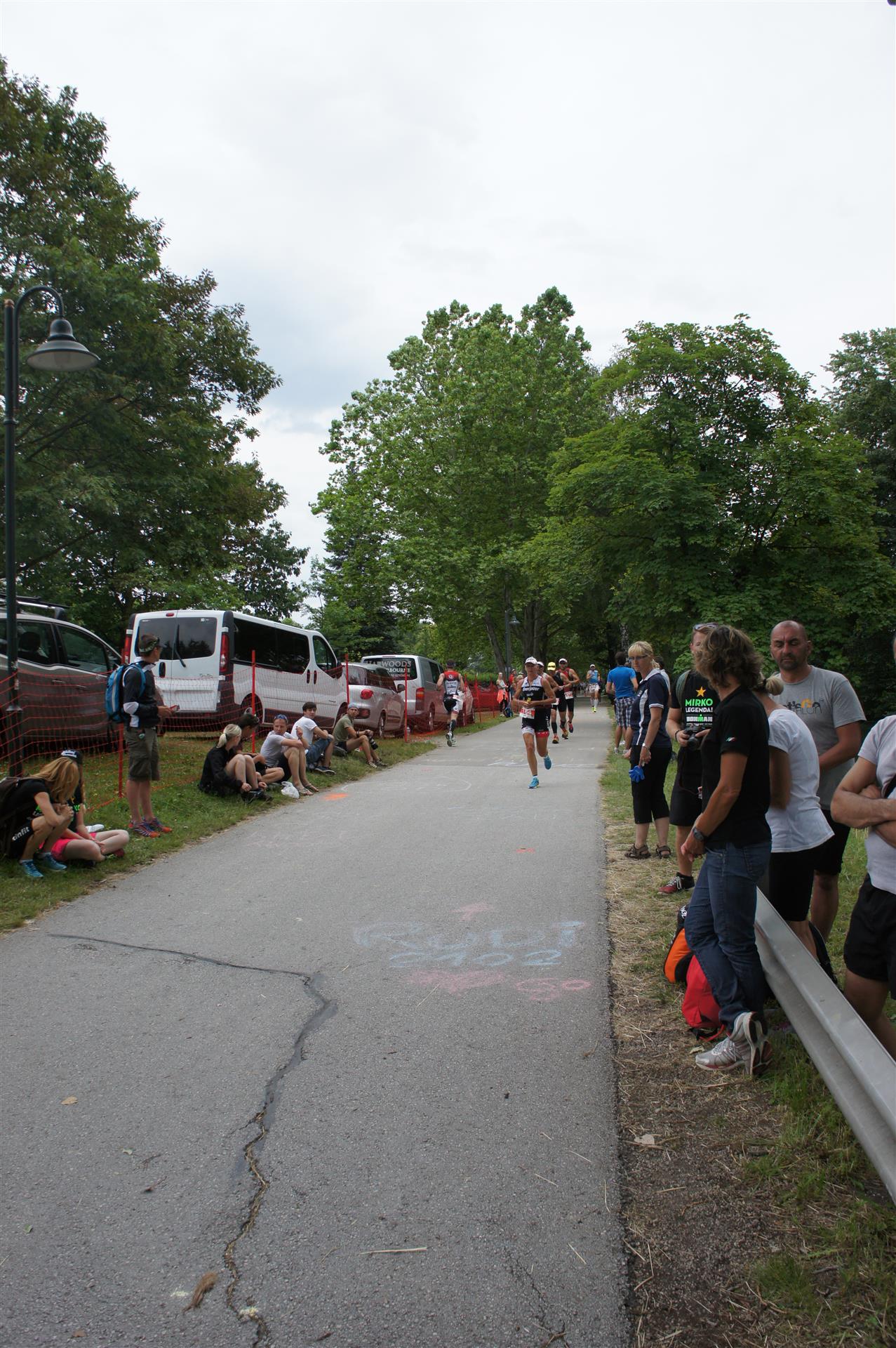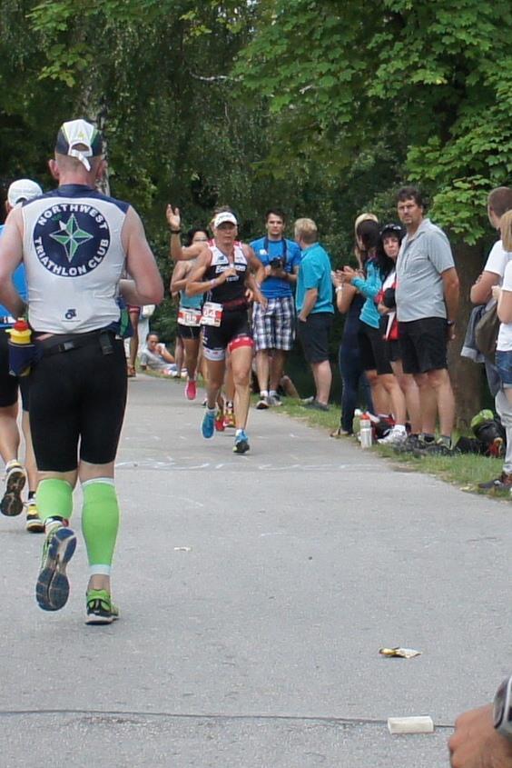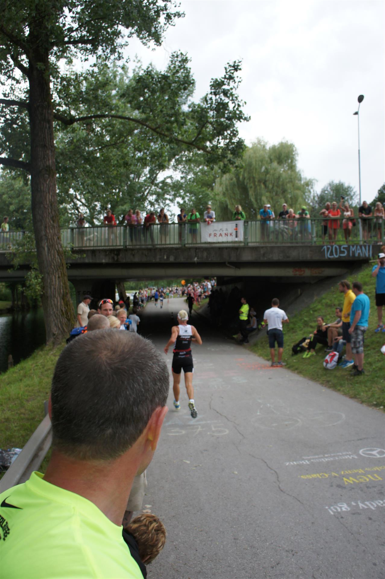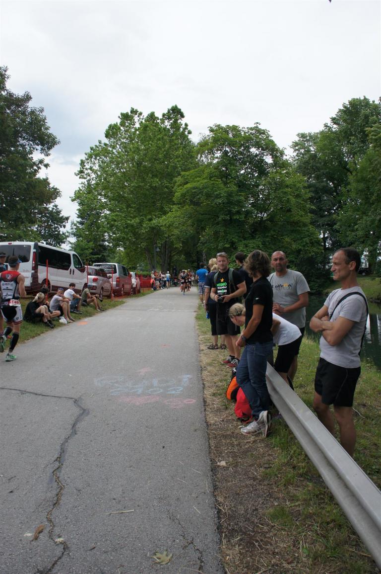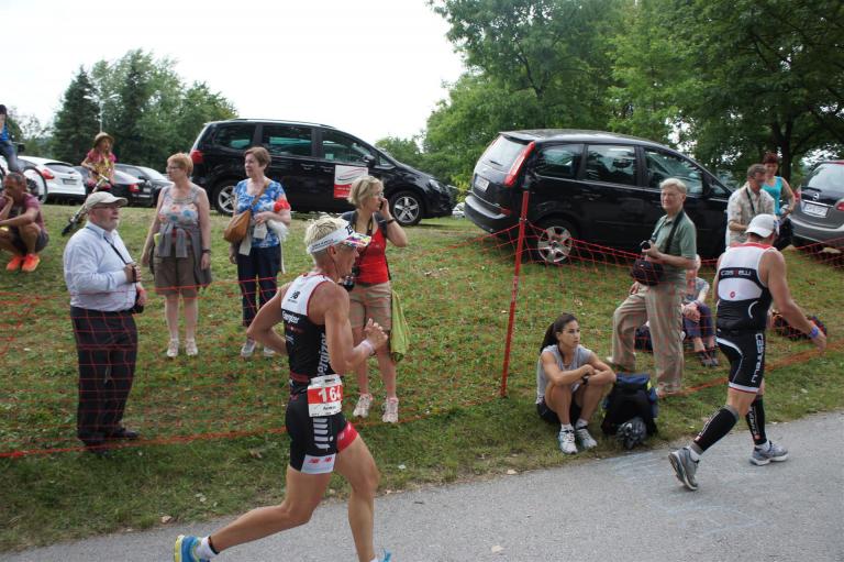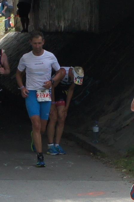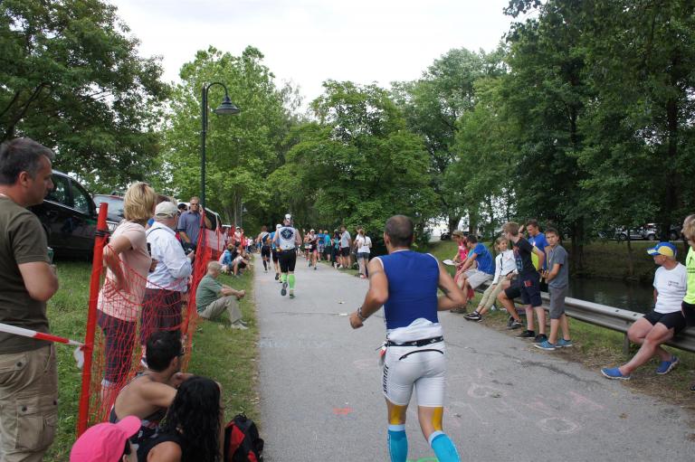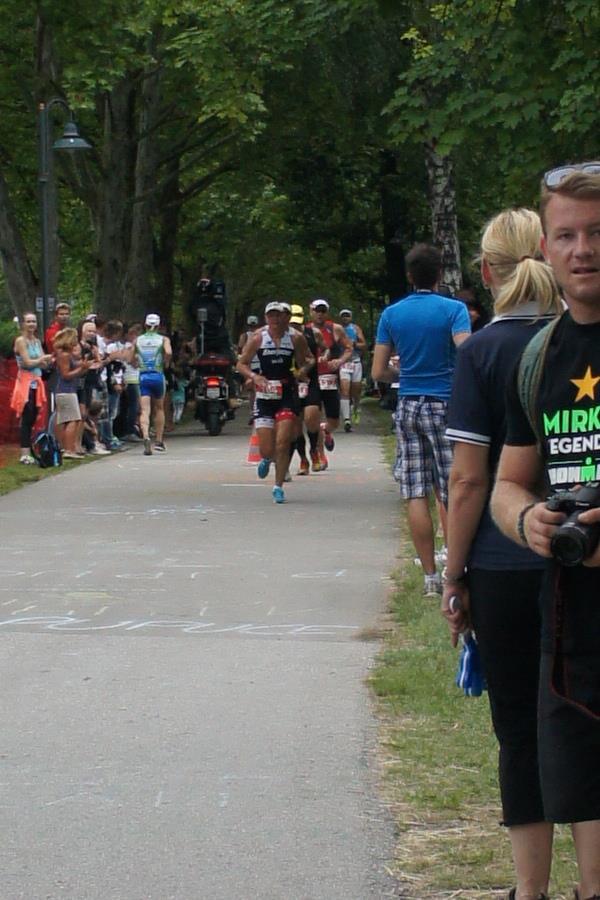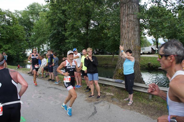 Als nächste Etappe steht dann der Anstieg zum Rupertiberg an. Der Anstieg ist etwas 2.400 Meter lang bei einer Steigung von bis zu 16 %. Auch hier haben sich sehr viele Zuschauer versammelt, das Anfeuern spornt die Athleten zu Höchstleistung an. Die letzten Kilometer der ersten Runde geht es dann überwiegend nur noch nach unten. Auf der zweiten Radrunde regnet es leider etwas, aber egal, da fährt man einfach etwas vorsichtiger. Nach 5:50 Stunden steige ich vom Rad und ziehe meine Laufschuhe an.