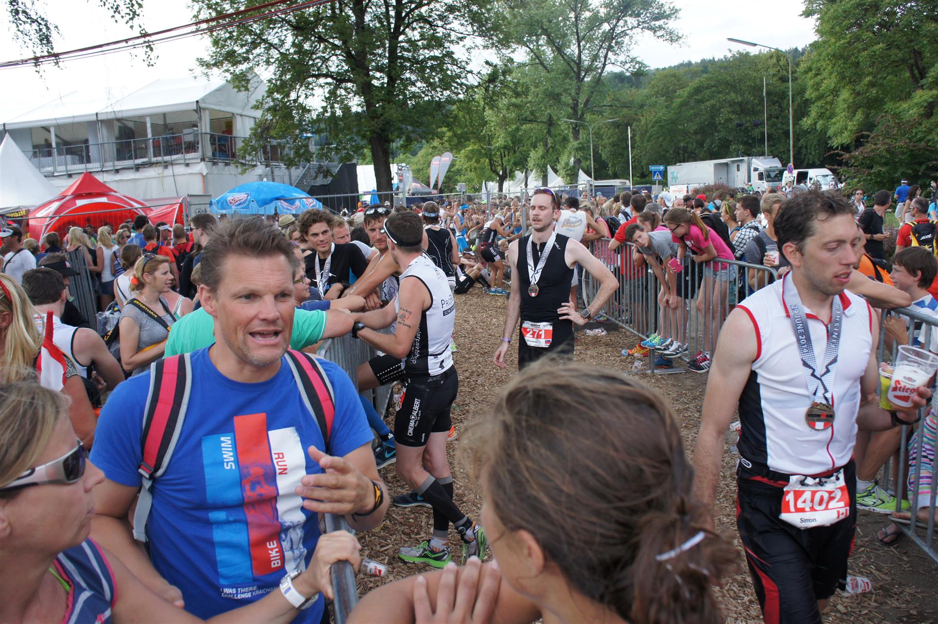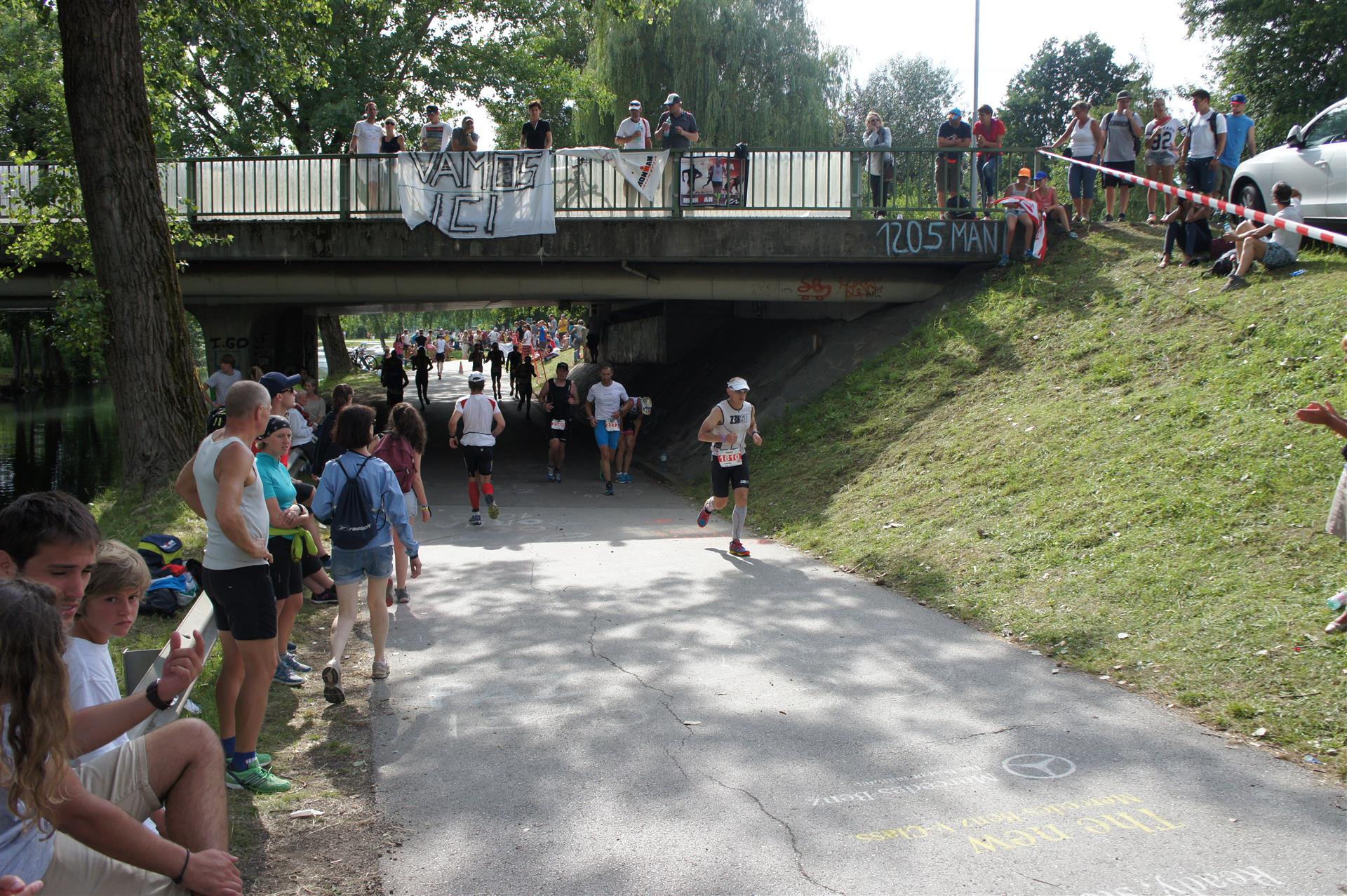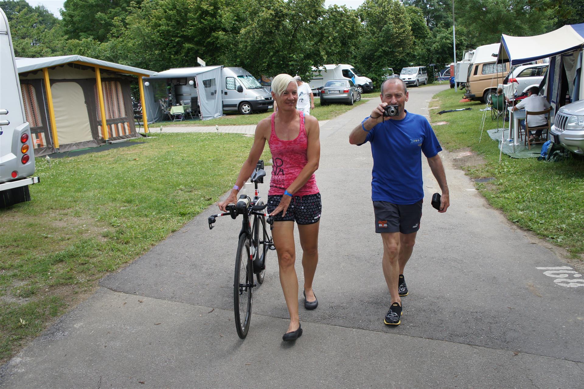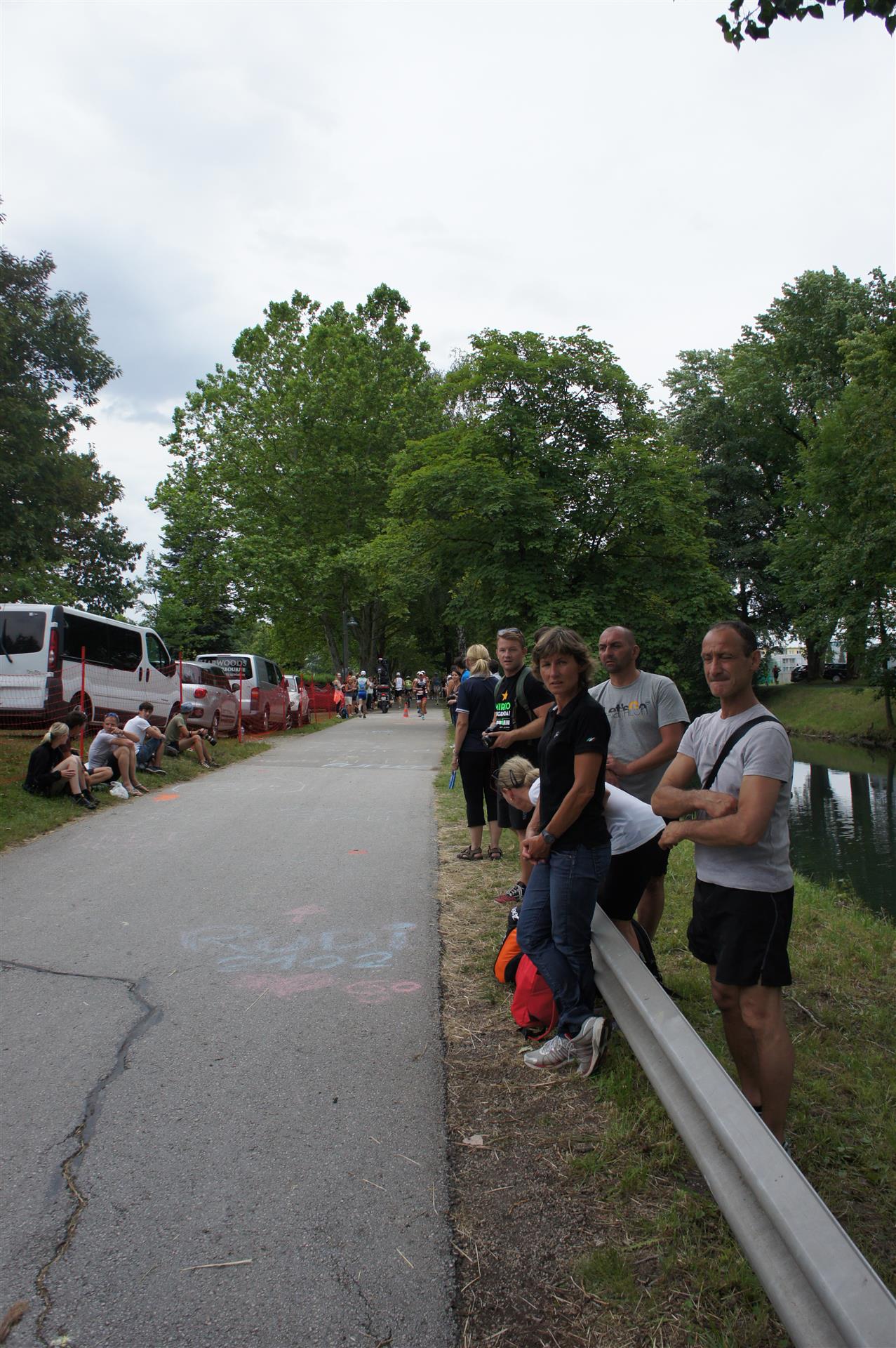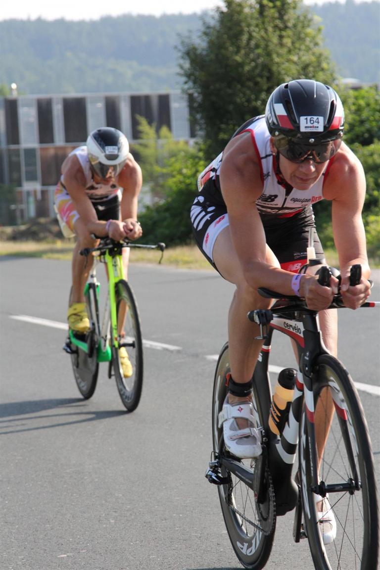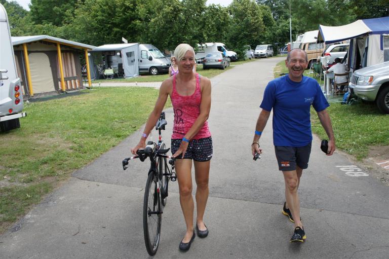 Als nächste Etappe steht dann der Anstieg zum Rupertiberg an. Der Anstieg ist etwas 2.400 Meter lang bei einer Steigung von bis zu 16 %. Auch hier haben sich sehr viele Zuschauer versammelt, das Anfeuern spornt die Athleten zu Höchstleistung an. Die letzten Kilometer der ersten Runde geht es dann überwiegend nur noch nach unten. Auf der zweiten Radrunde regnet es leider etwas, aber egal, da fährt man einfach etwas vorsichtiger. Nach 5:50 Stunden steige ich vom Rad und ziehe meine Laufschuhe an.