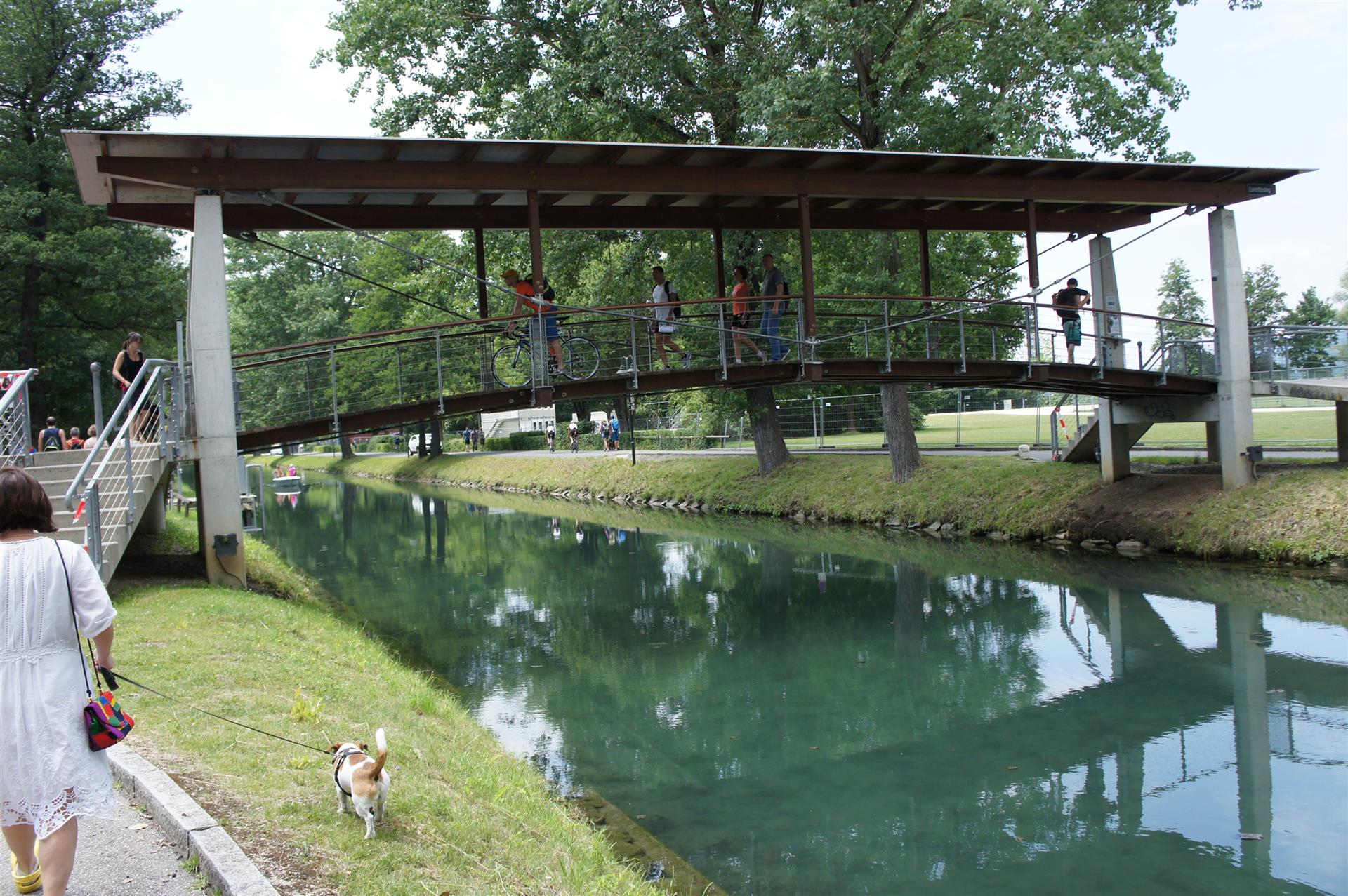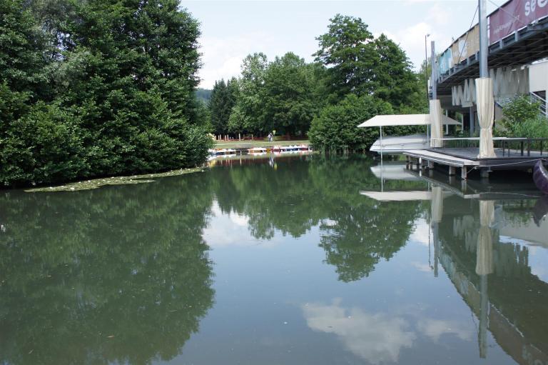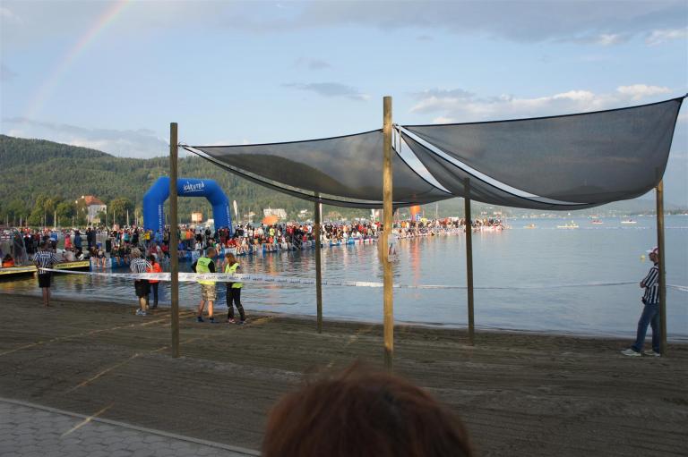 Obwohl ich lediglich eine mittelmäßige Schwimmerin bin macht mir das Schwimmen Spaß. Ich versuche meinen Rhythmus zu finden und gehe möglichst allen Konfrontationen aus dem Weg. Das Schwimmen im Wörthersee ist schon eine tolle Sache. Das Wasser ist super klar, die Strecke gut gekennzeichnet. Lediglich die letzten 1.000 Meter im Lendkanal sind etwas stressig. Wenn sich der ganze Pulk in den lediglich 10-12 Meter breiten Kanal zwängt. Da gibt es auf den ersten Metern ein ganz schönes Gedränge. Man wird jedoch durch die vielen Zuschauer am Rande des Kanals entschädigt. Die Stimmung ist gewaltig, der Krach ohrenbetäubend.