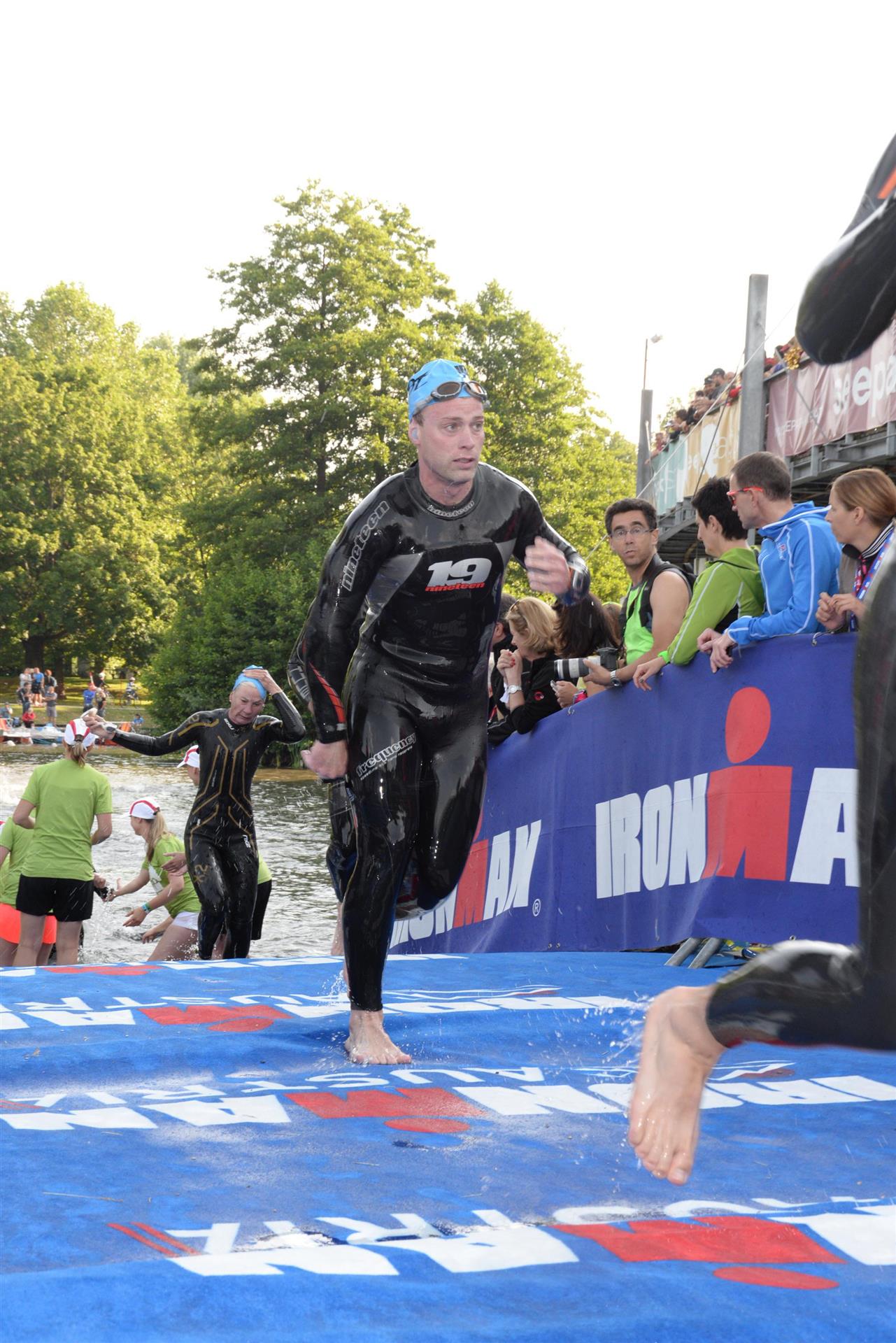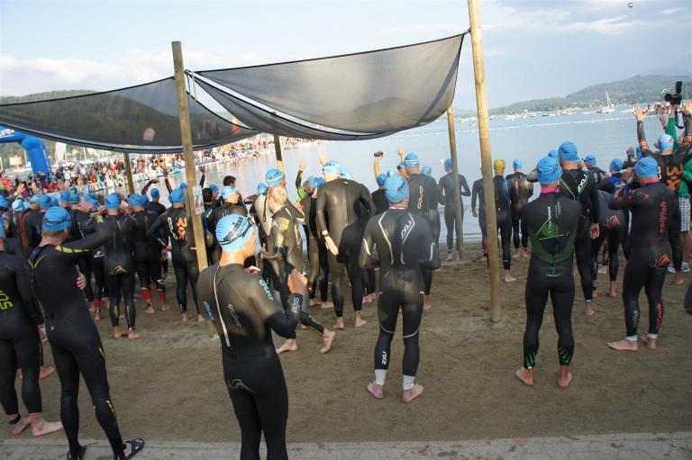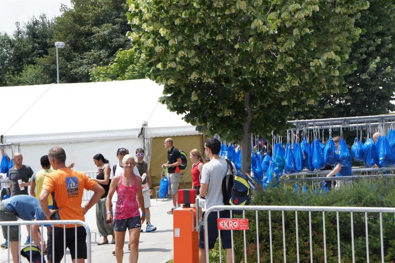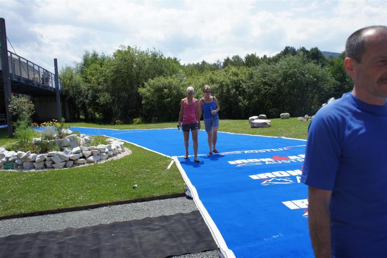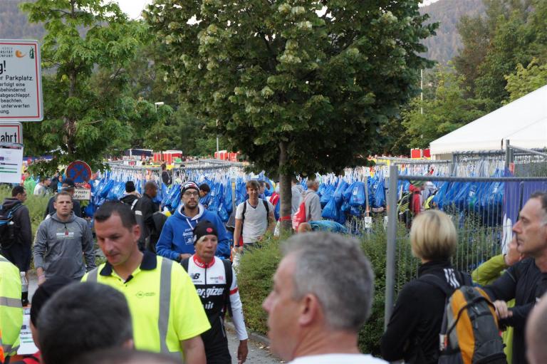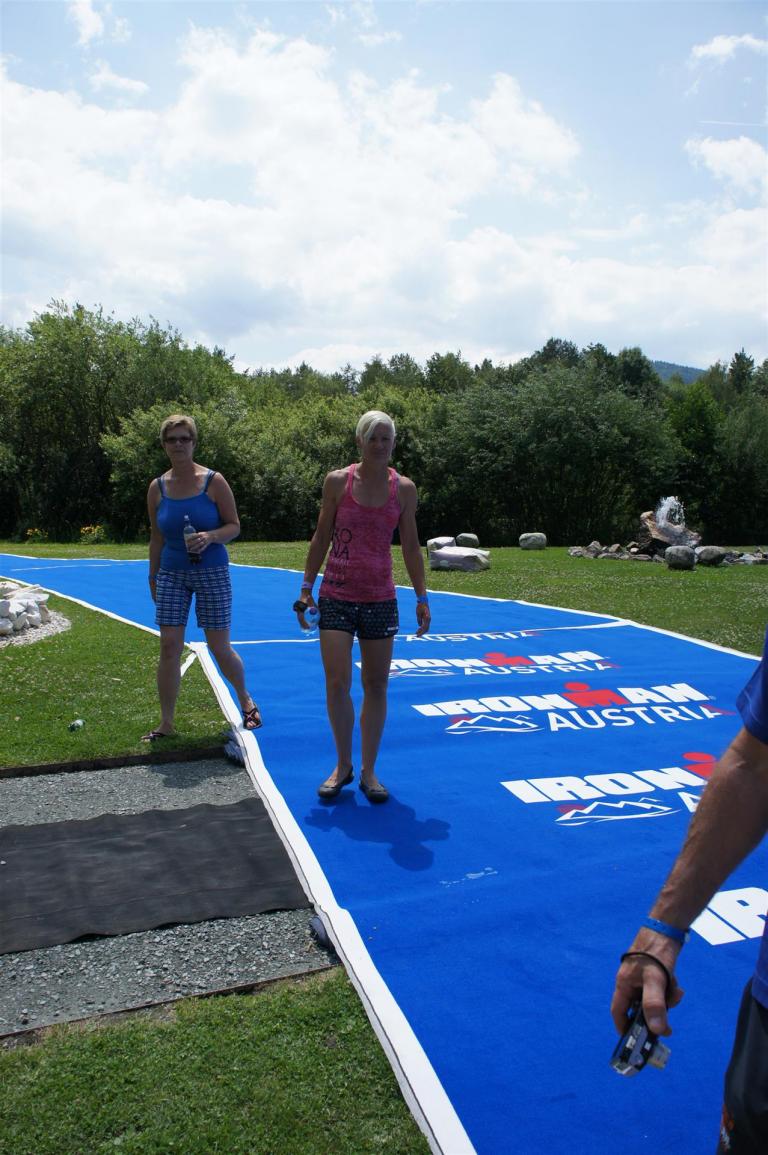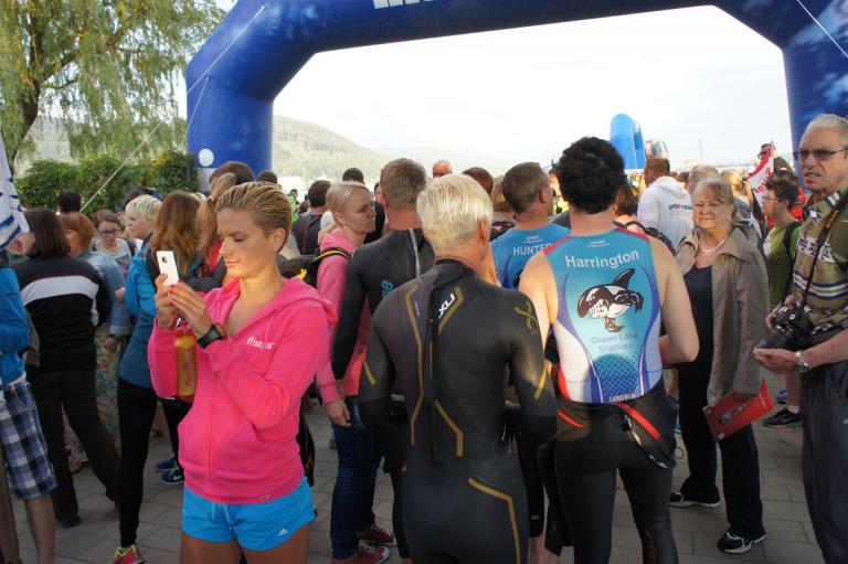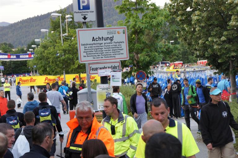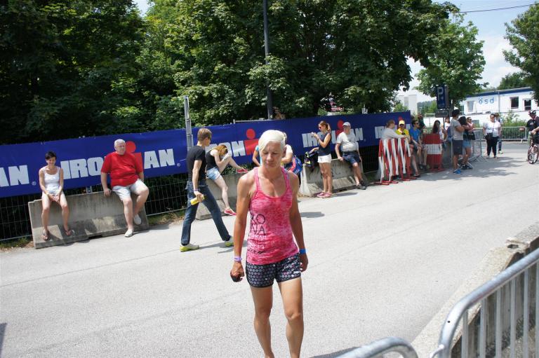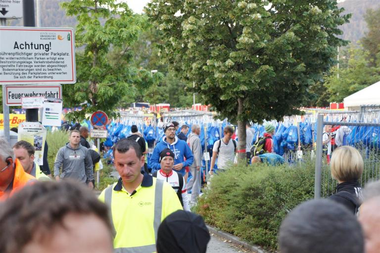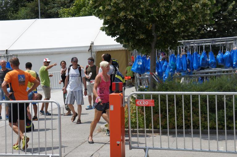 Nach einer Schwimmzeit von 1 Stunde und 11 Minuten verlasse ich das Wasser. Ich bin zufrieden mit meiner Zeit. Der Weg vom Schwimmausstieg bis in die Wechselzone ist relativ lange. Man hat ausreichend Zeit den Neoprenanzug etwas auszuziehen.