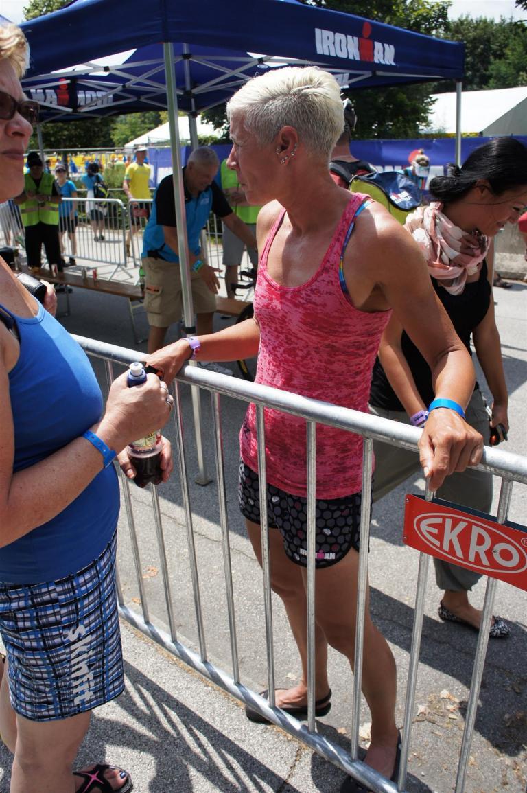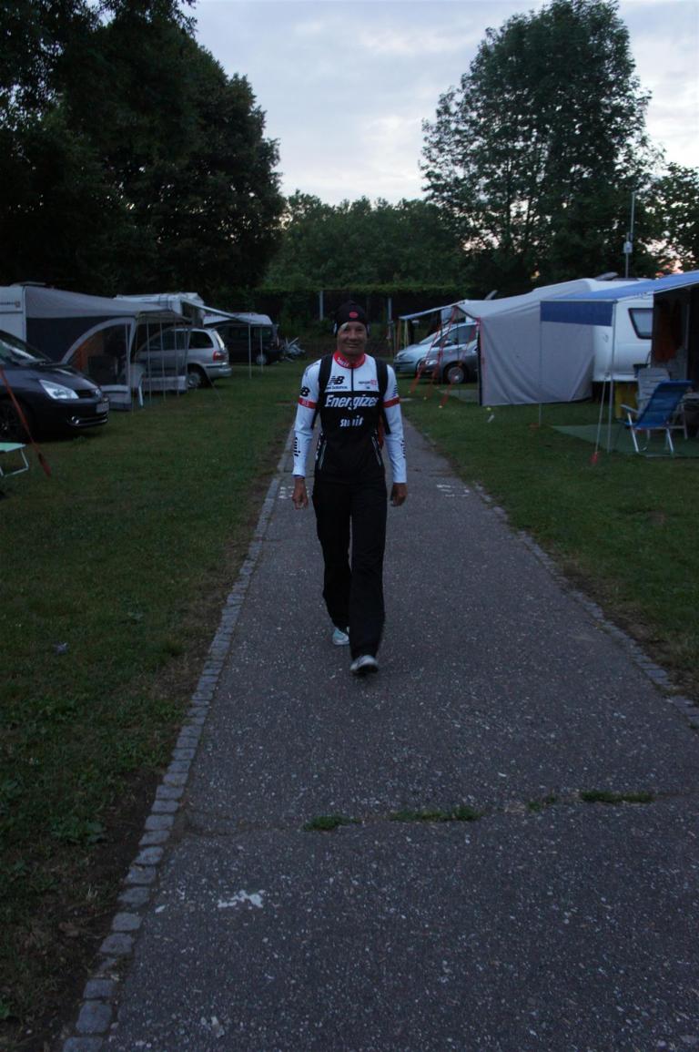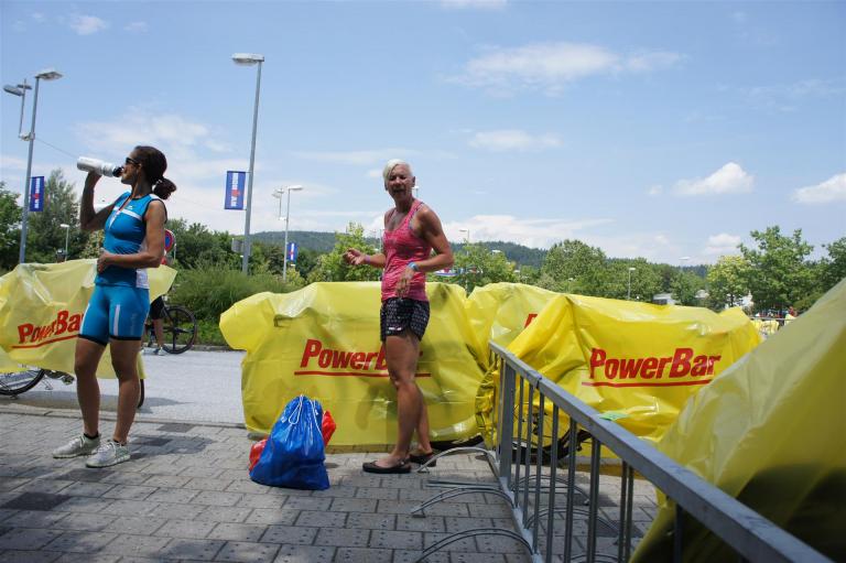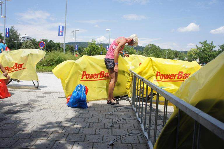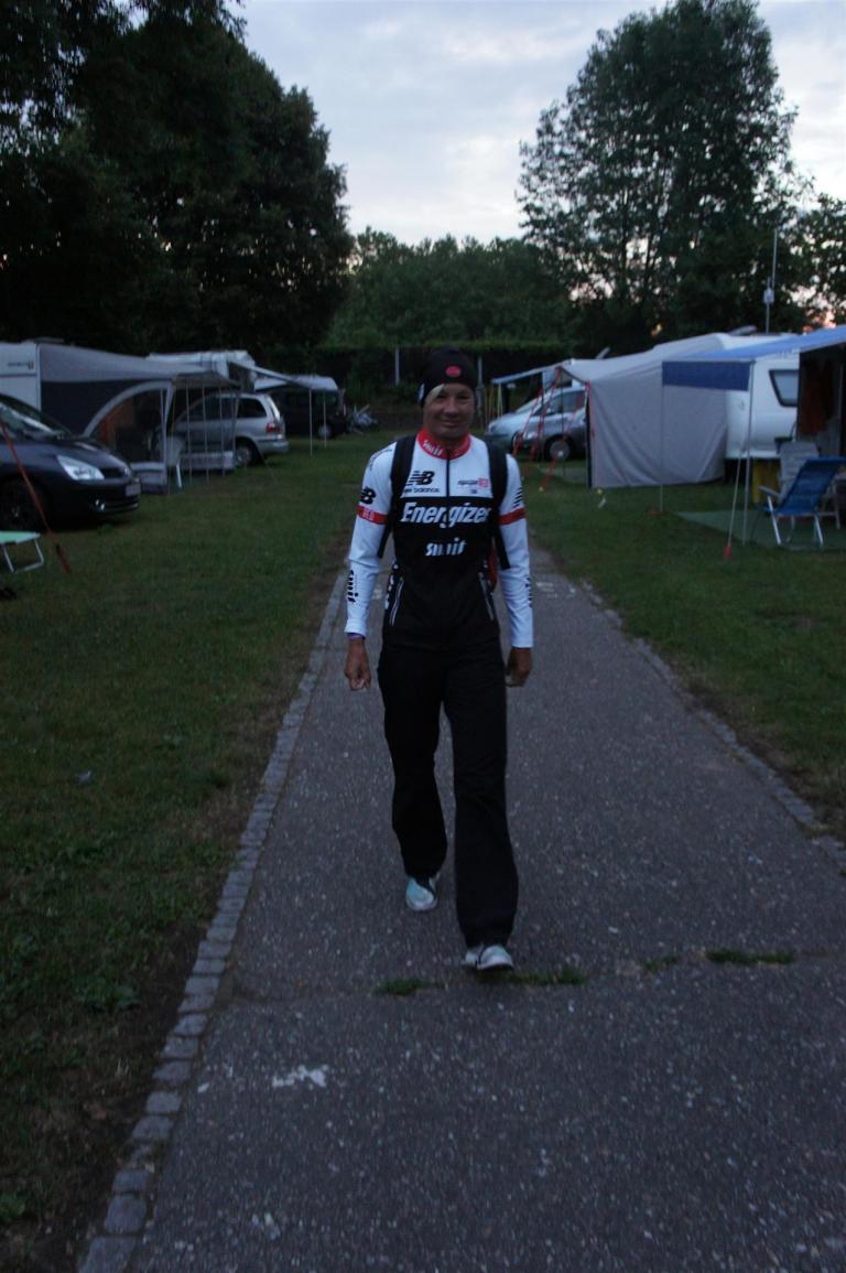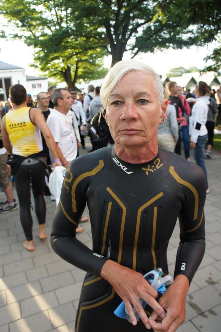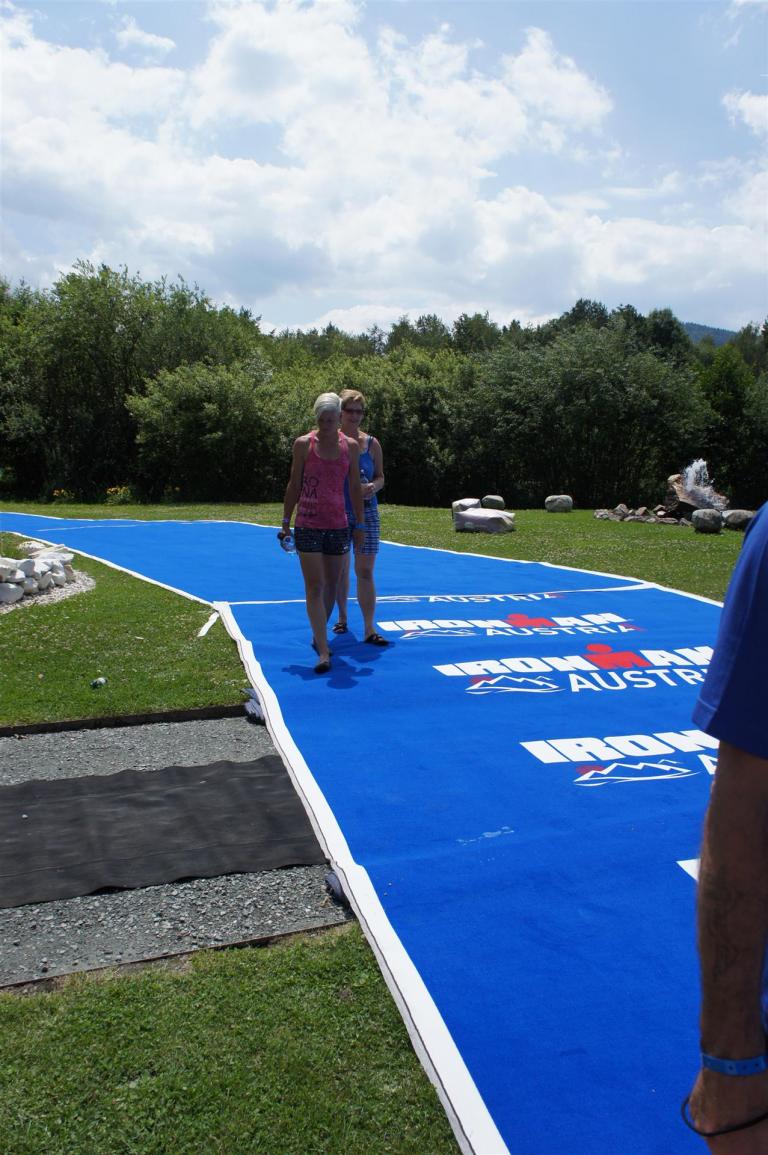 Nach einer Schwimmzeit von 1 Stunde und 11 Minuten verlasse ich das Wasser. Ich bin zufrieden mit meiner Zeit. Der Weg vom Schwimmausstieg bis in die Wechselzone ist relativ lange. Man hat ausreichend Zeit den Neoprenanzug etwas auszuziehen.