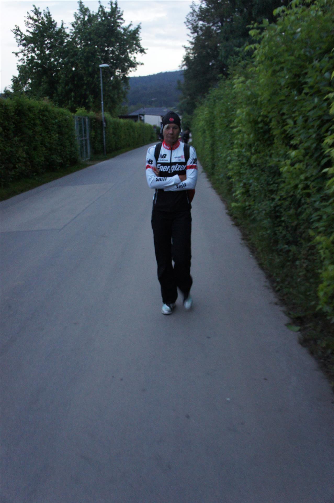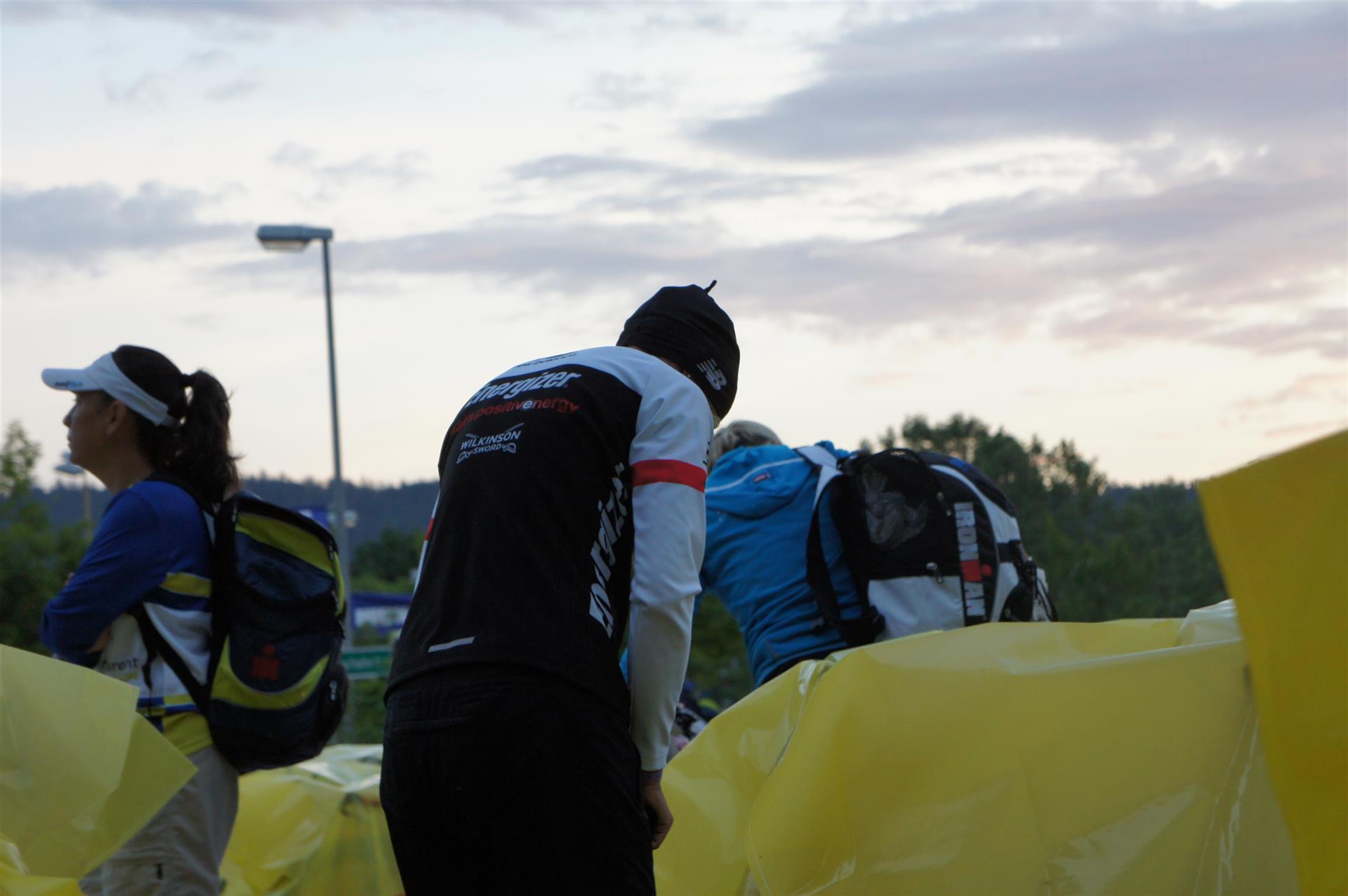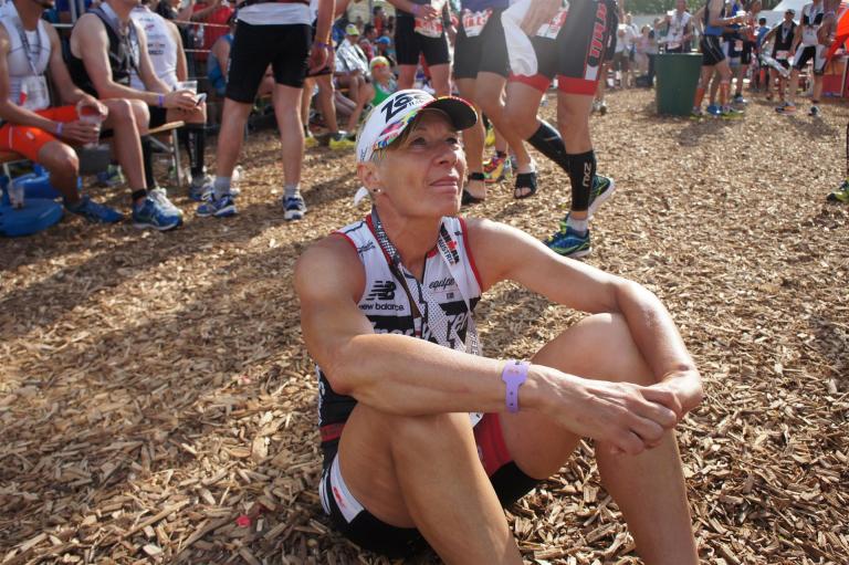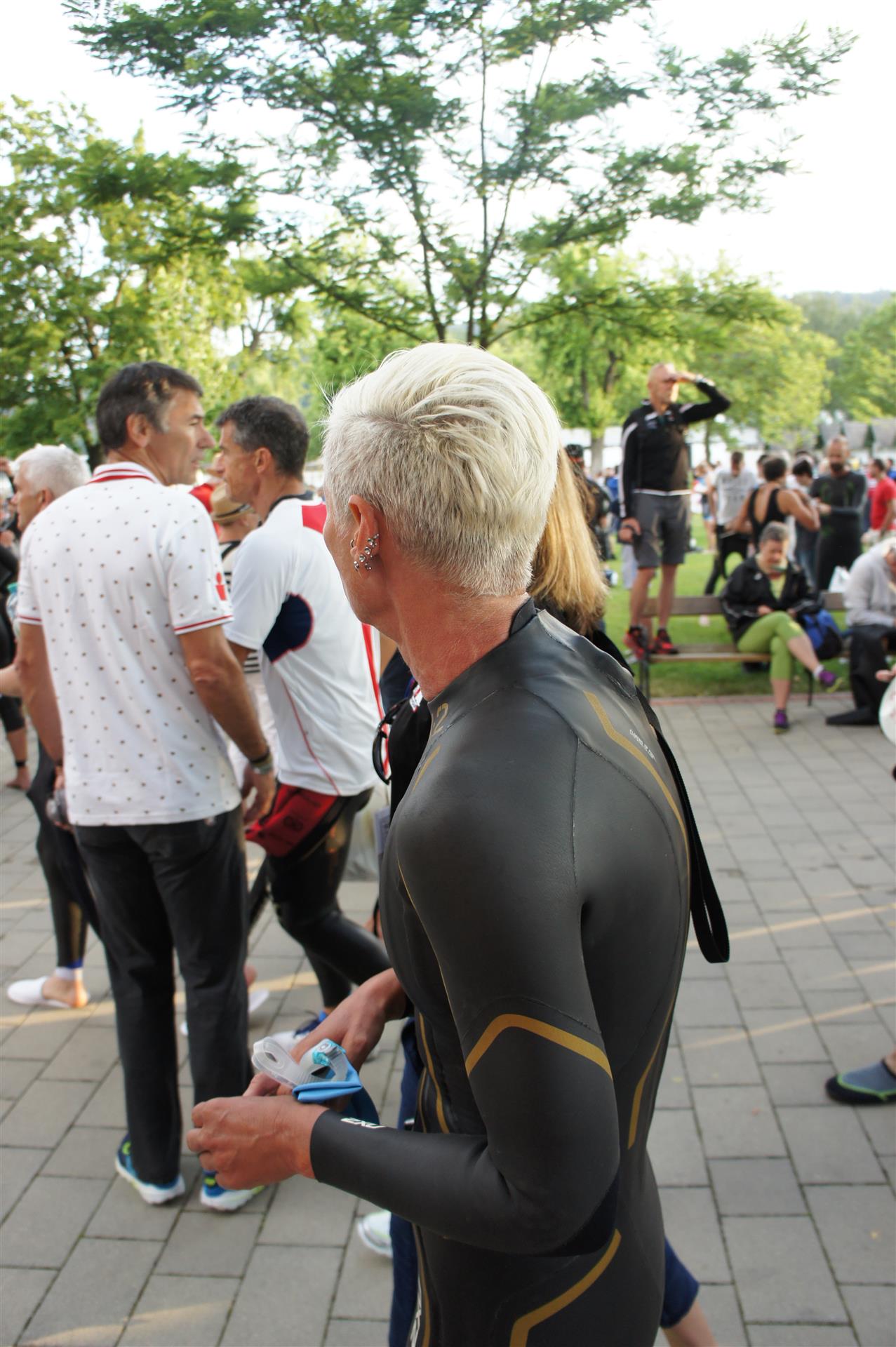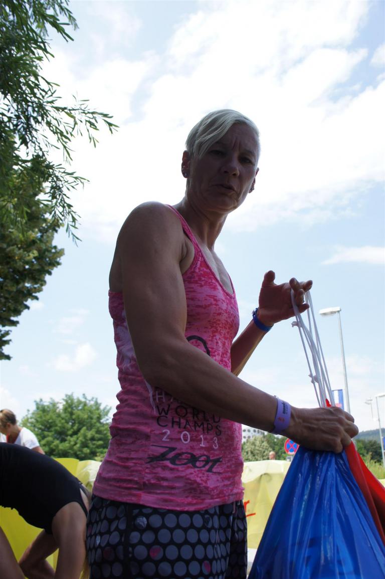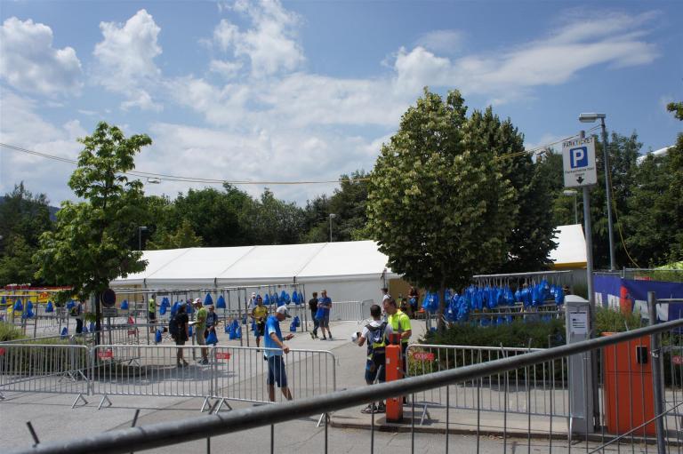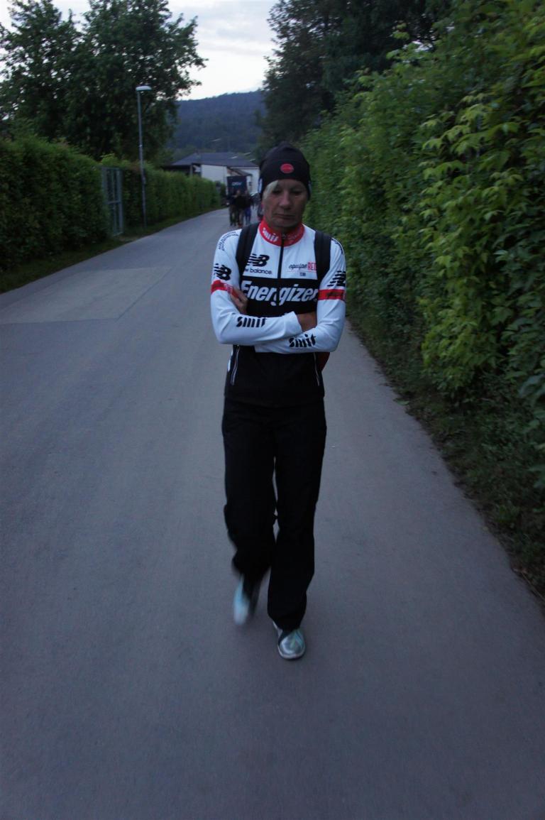 Nach einer Schwimmzeit von 1 Stunde und 11 Minuten verlasse ich das Wasser. Ich bin zufrieden mit meiner Zeit. Der Weg vom Schwimmausstieg bis in die Wechselzone ist relativ lange. Man hat ausreichend Zeit den Neoprenanzug etwas auszuziehen.