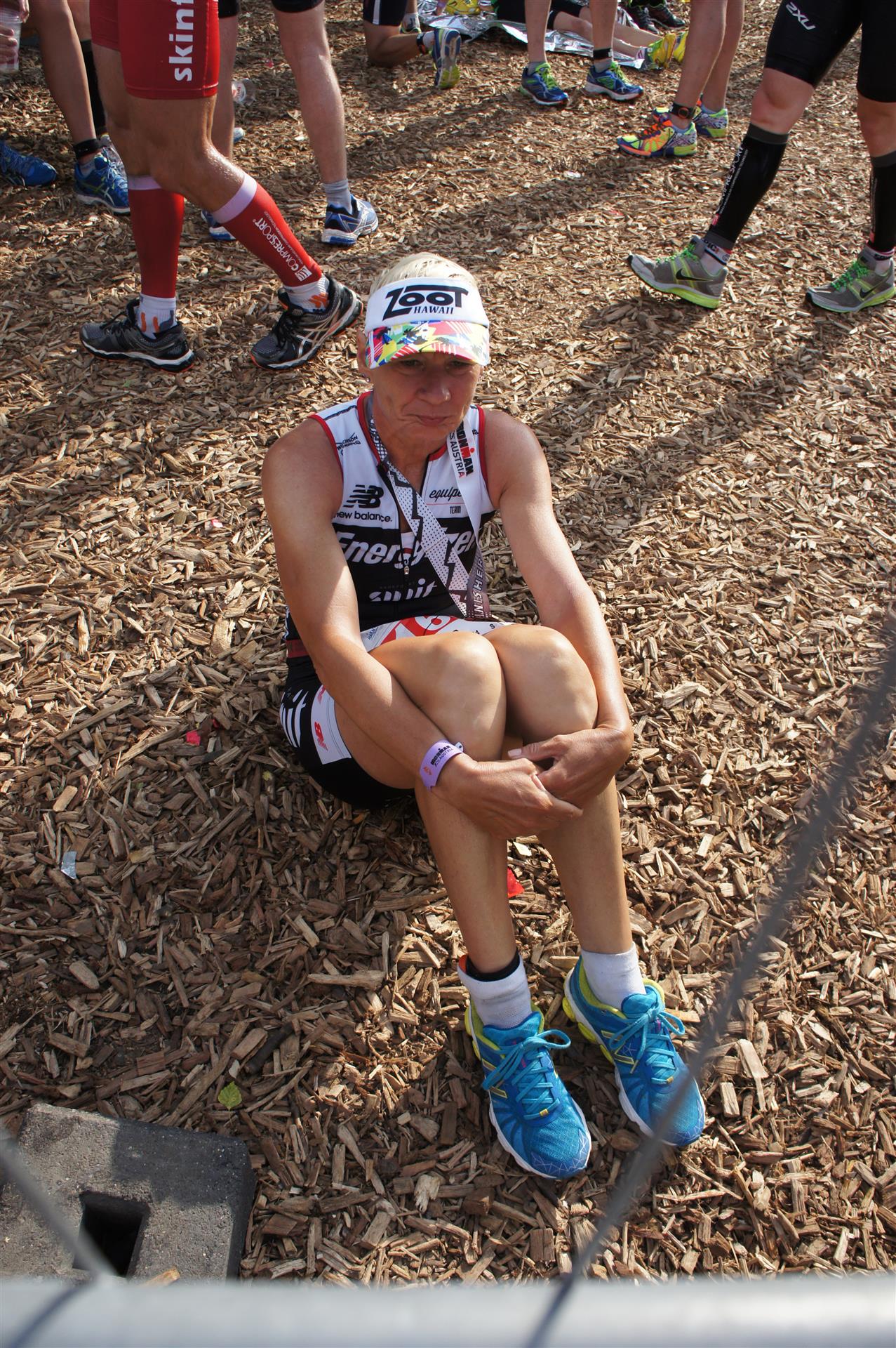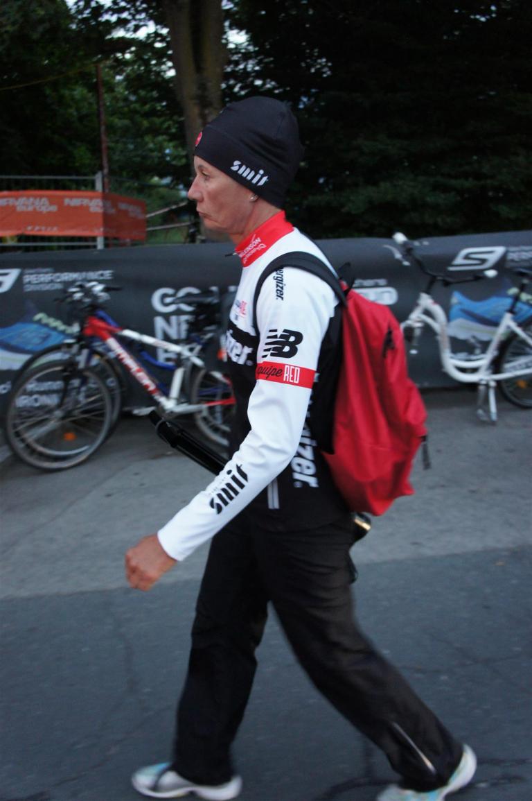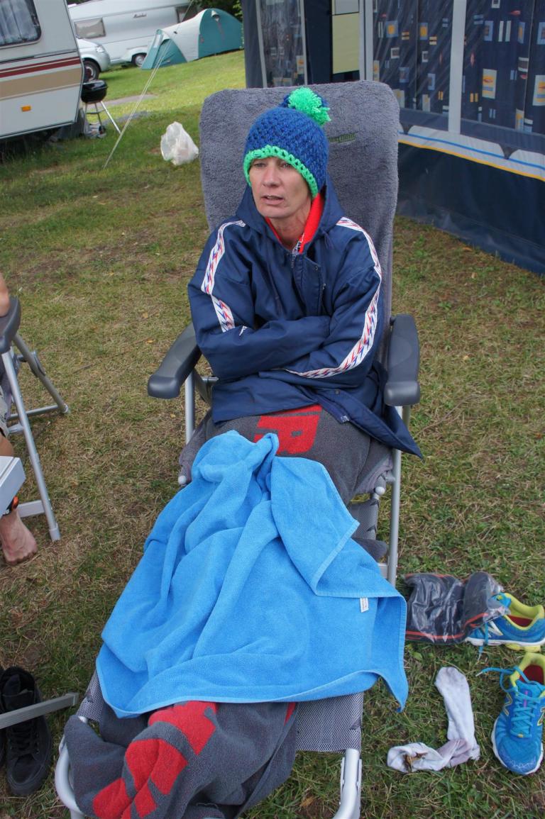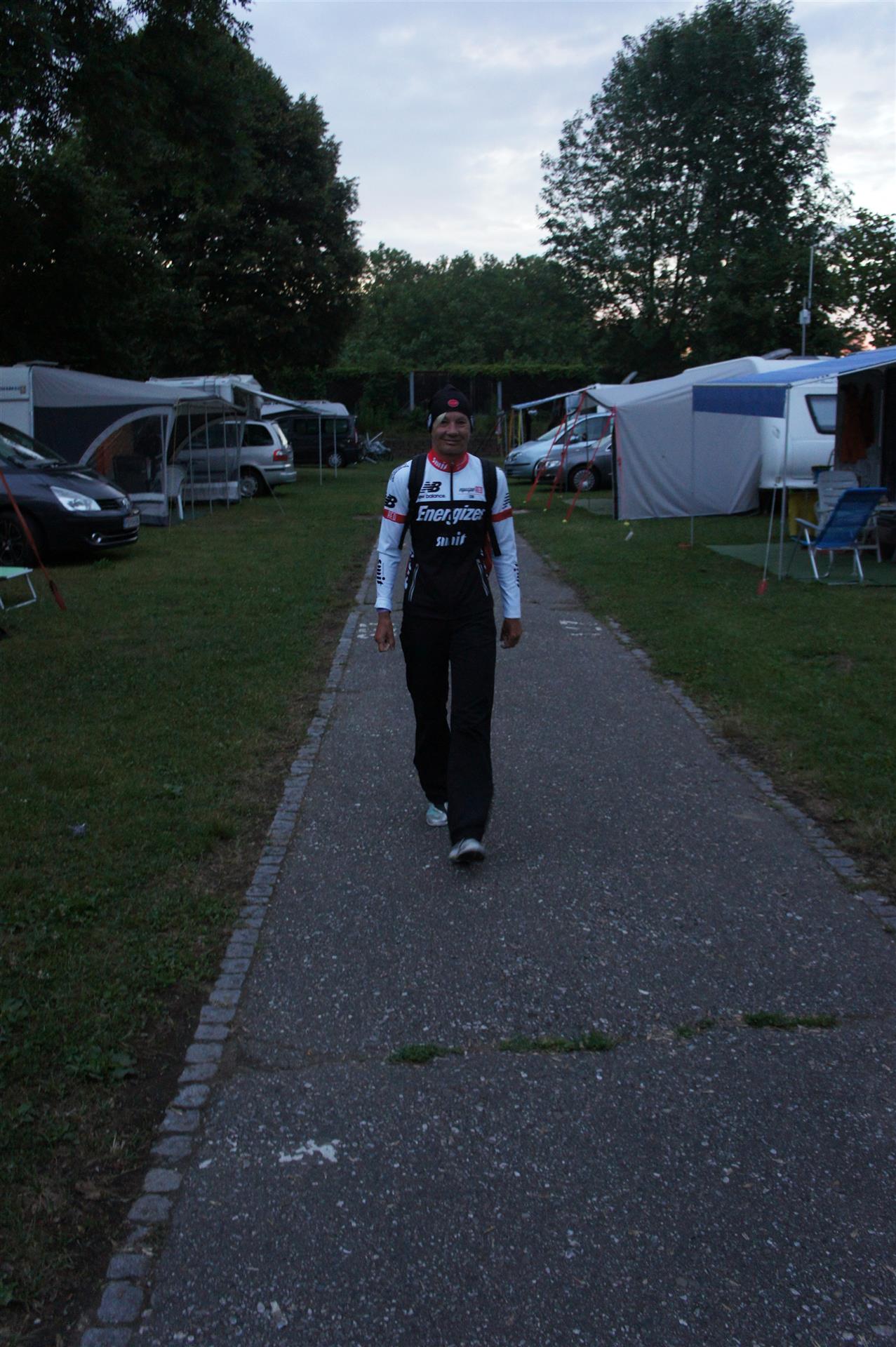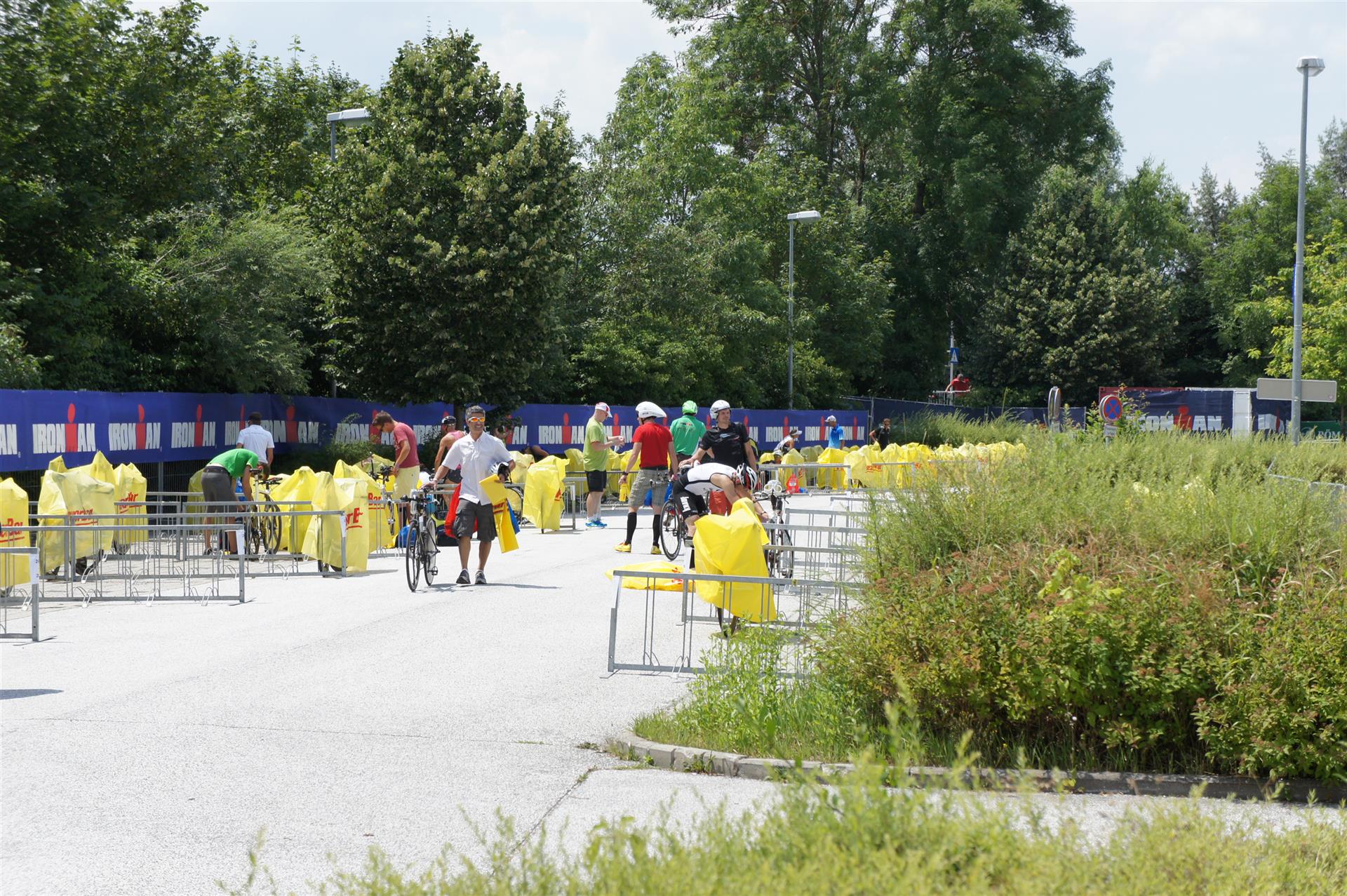 Nach einer Schwimmzeit von 1 Stunde und 11 Minuten verlasse ich das Wasser. Ich bin zufrieden mit meiner Zeit. Der Weg vom Schwimmausstieg bis in die Wechselzone ist relativ lange. Man hat ausreichend Zeit den Neoprenanzug etwas auszuziehen.