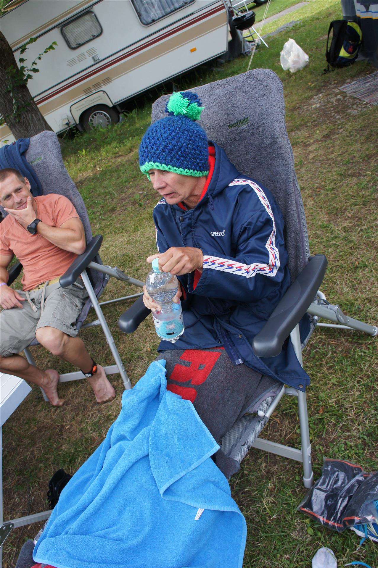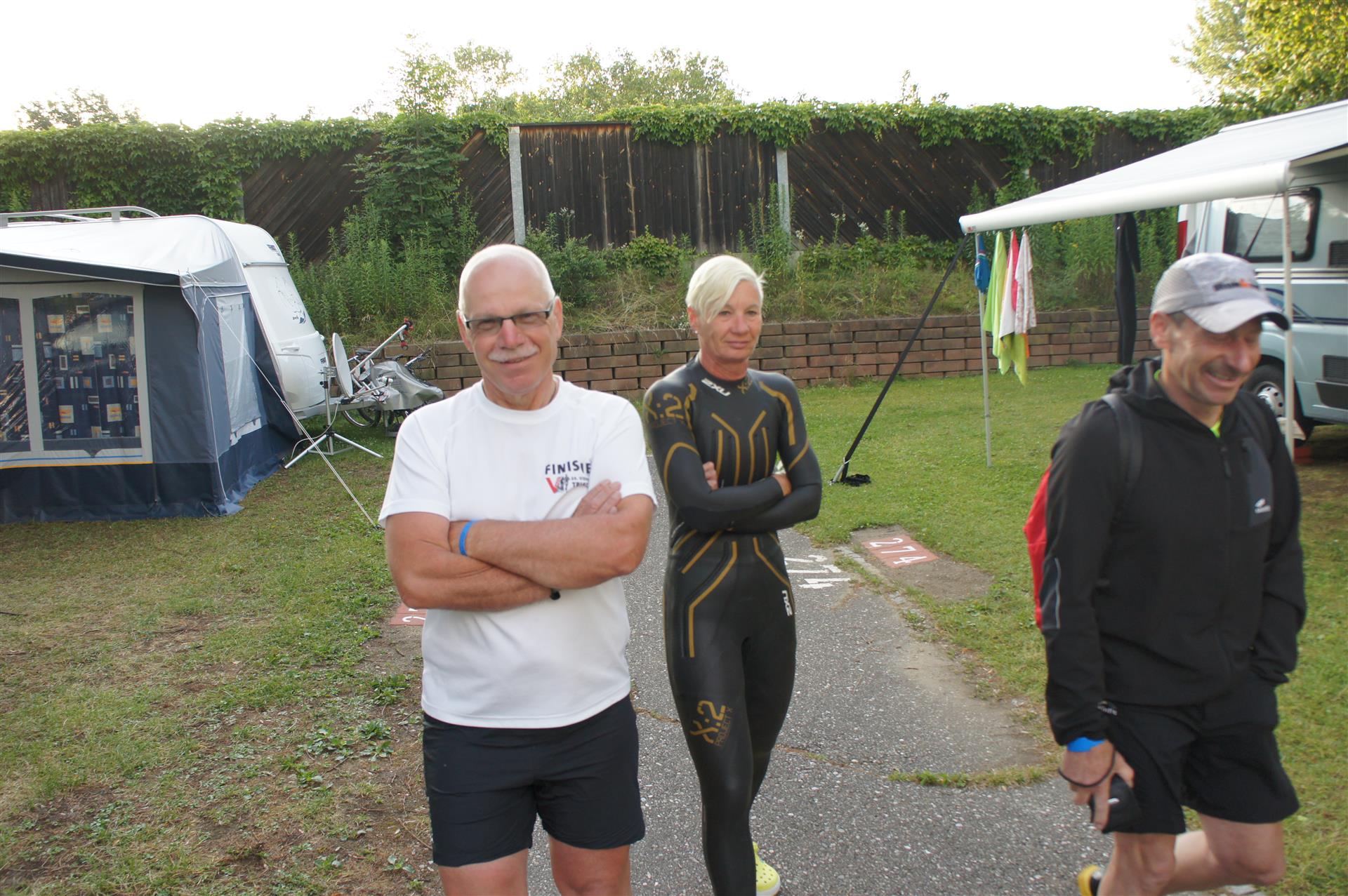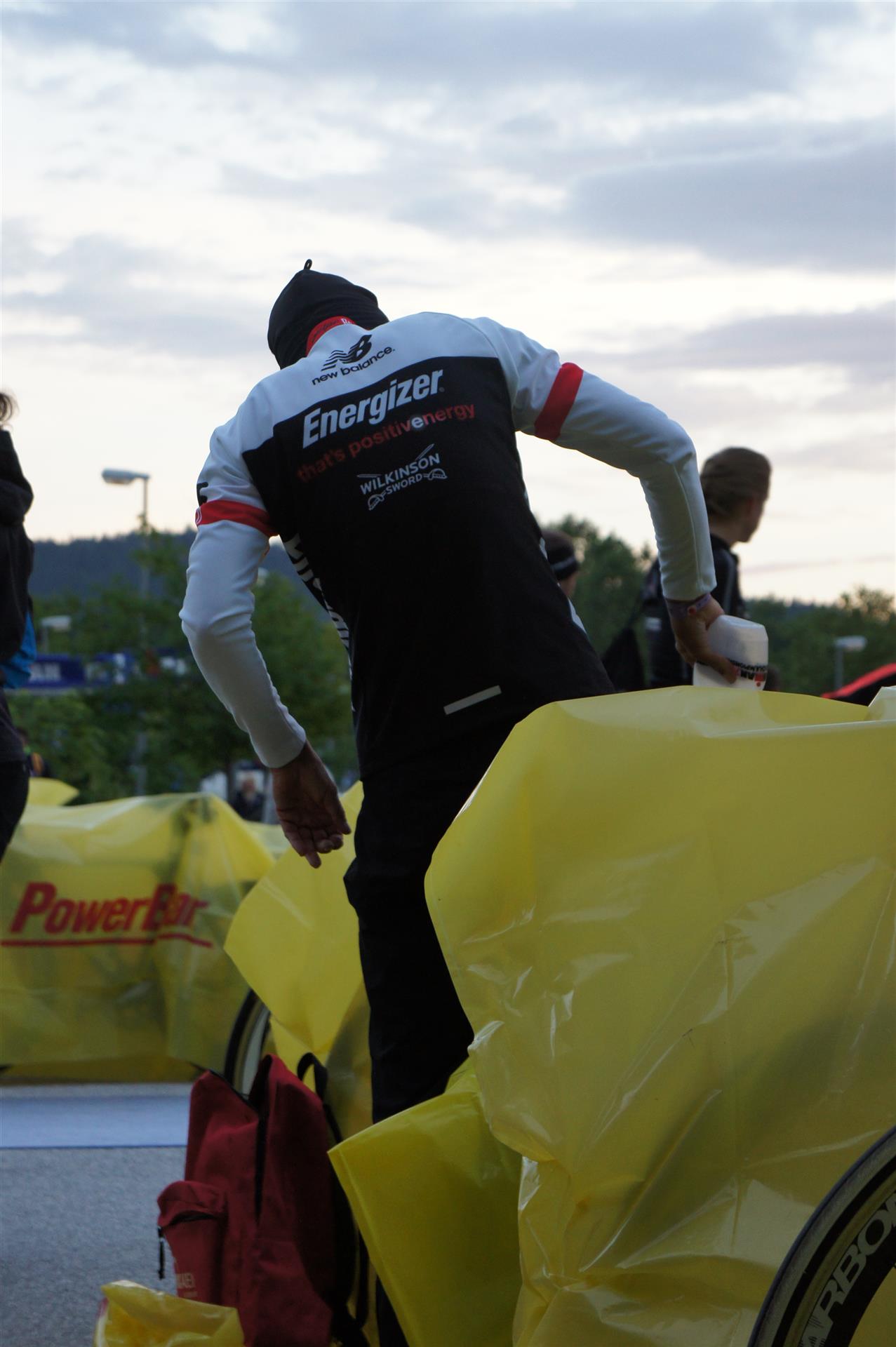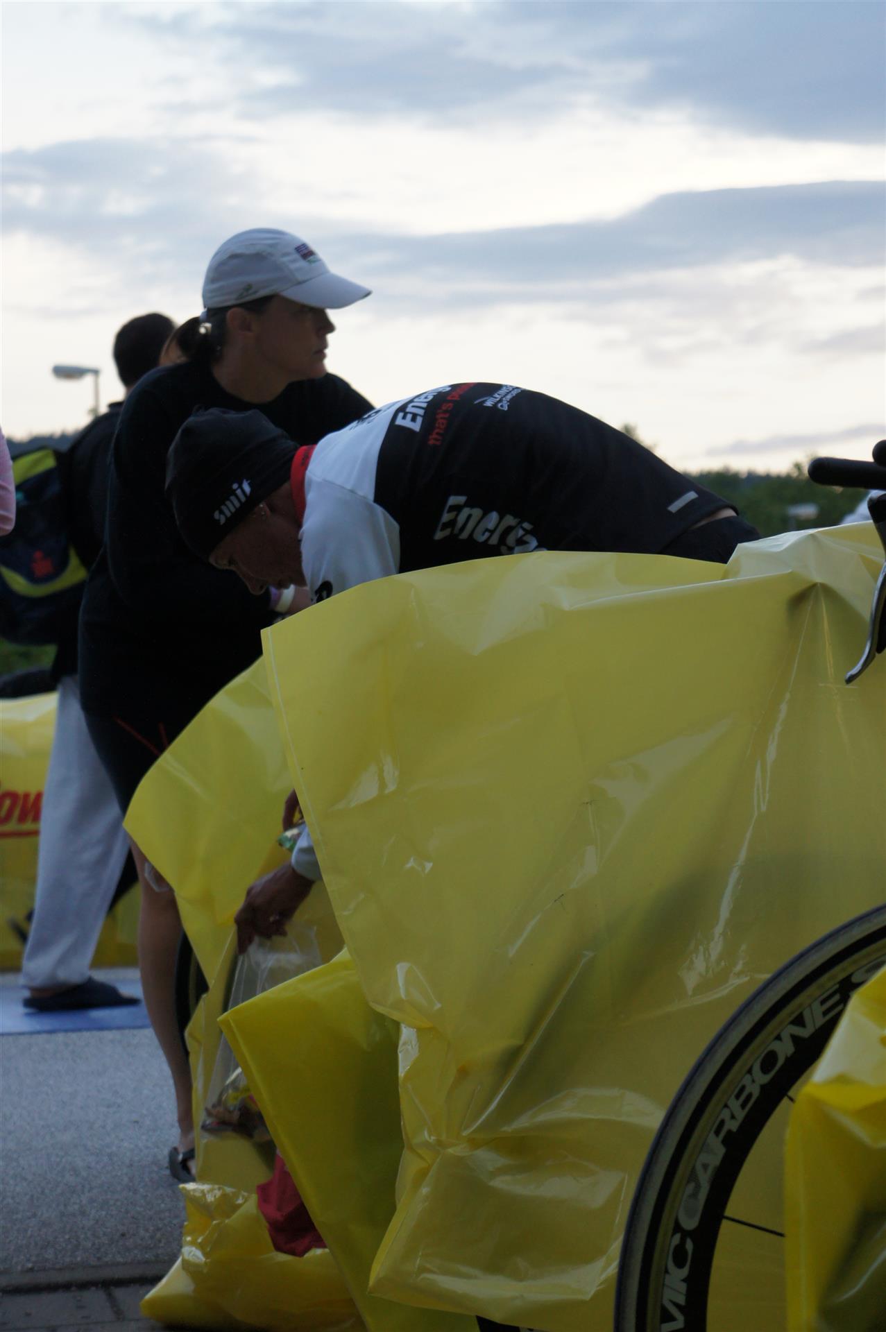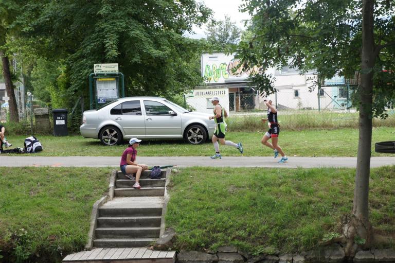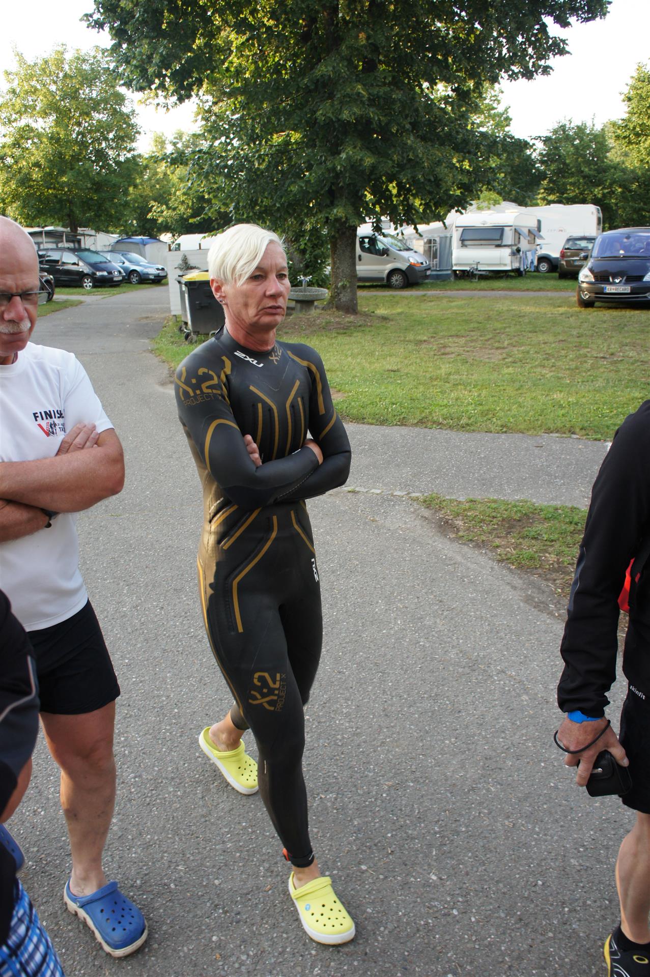 Nach einer Schwimmzeit von 1 Stunde und 11 Minuten verlasse ich das Wasser. Ich bin zufrieden mit meiner Zeit. Der Weg vom Schwimmausstieg bis in die Wechselzone ist relativ lange. Man hat ausreichend Zeit den Neoprenanzug etwas auszuziehen.
