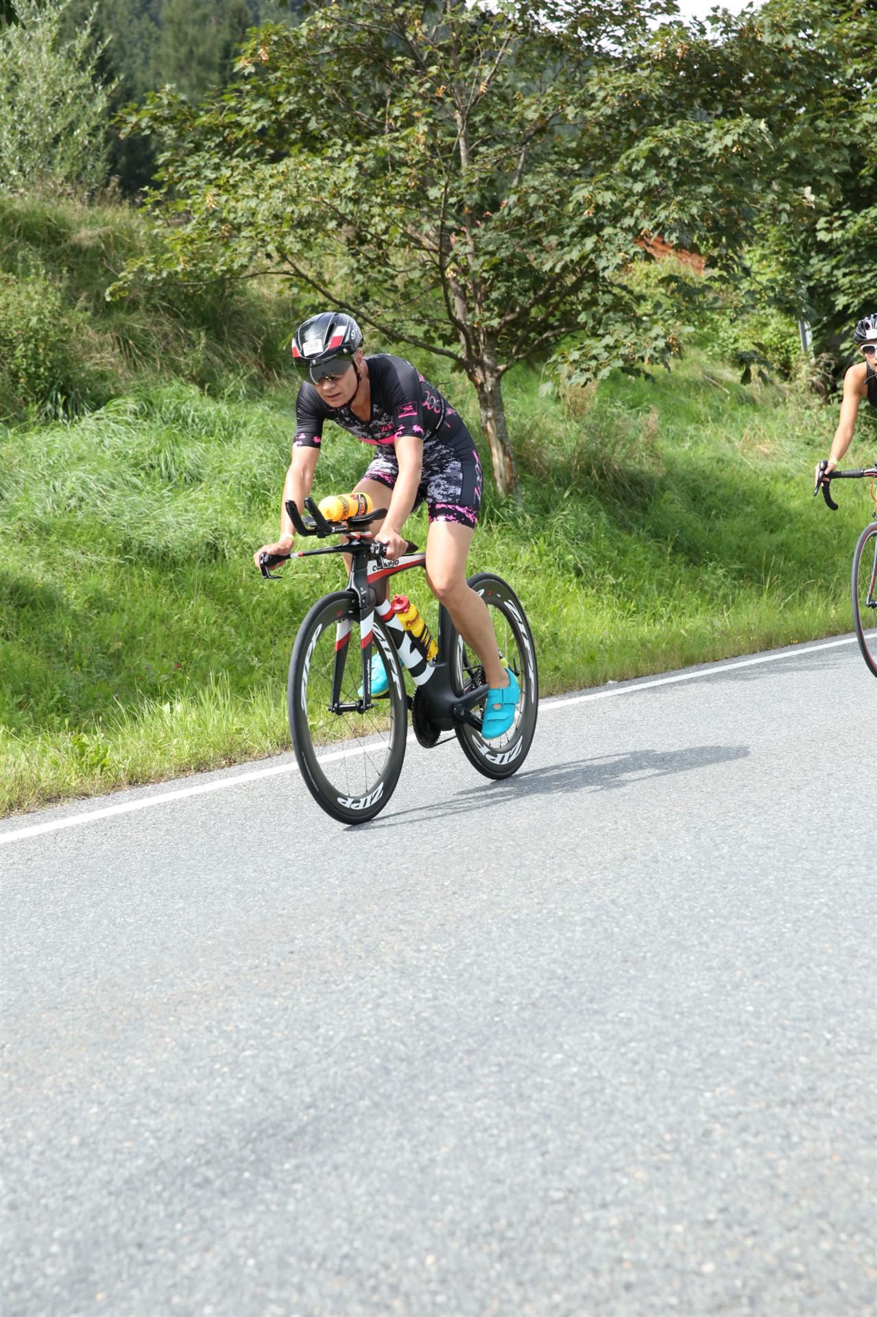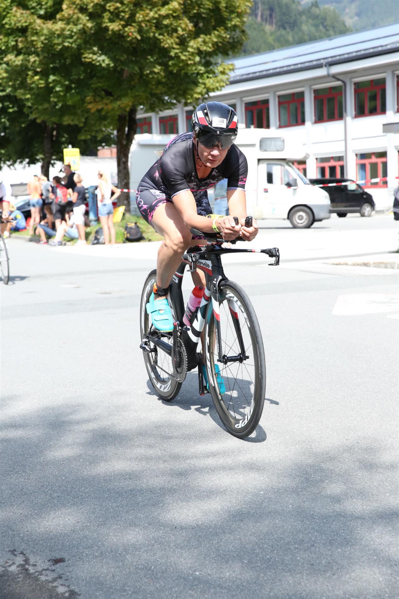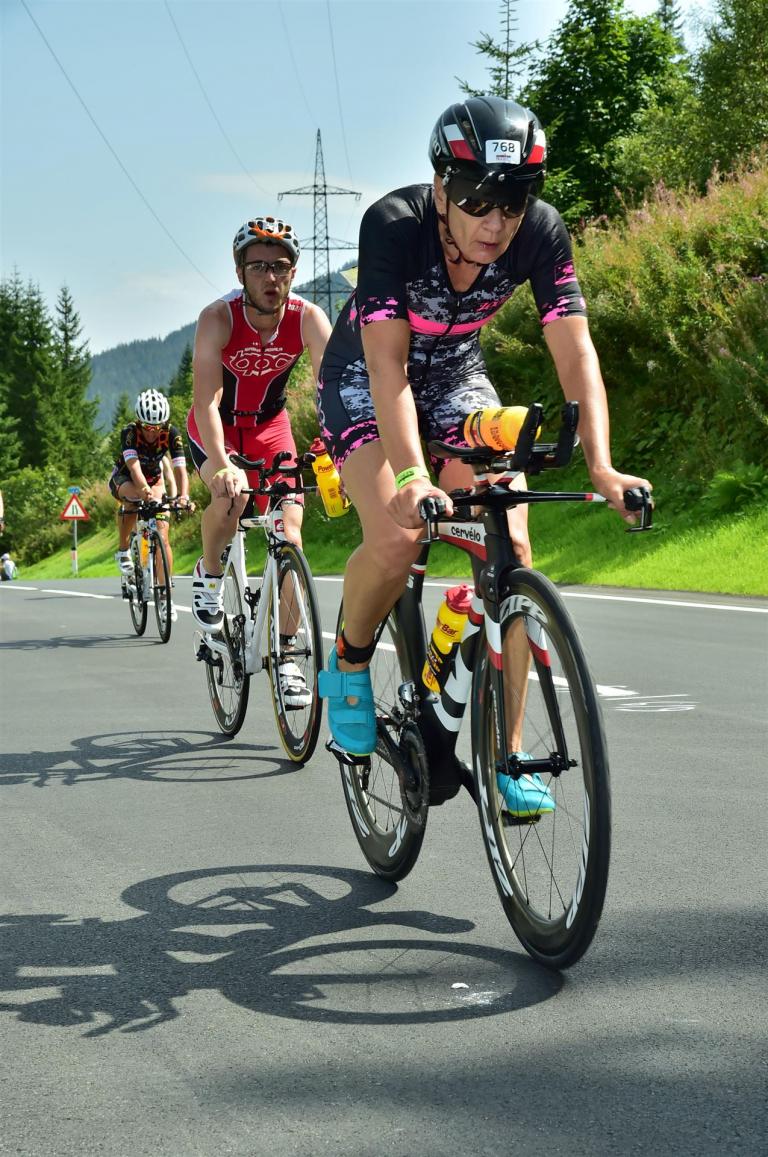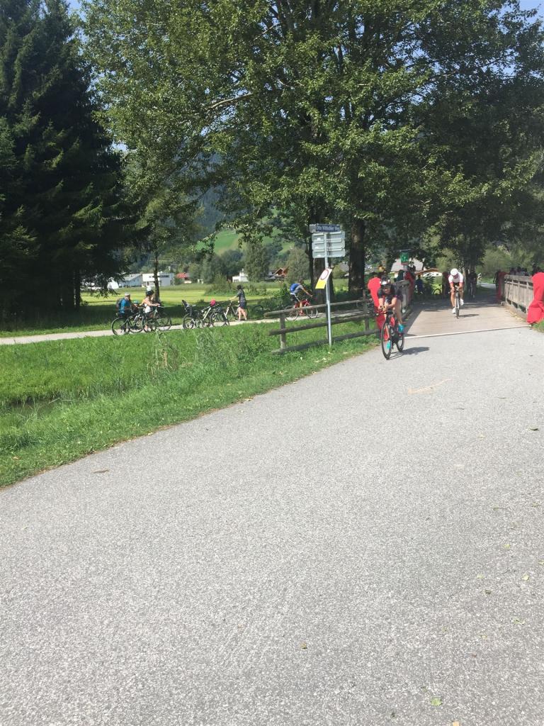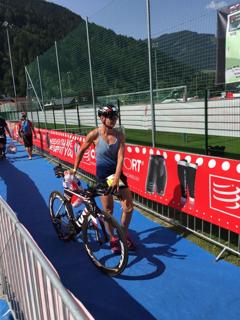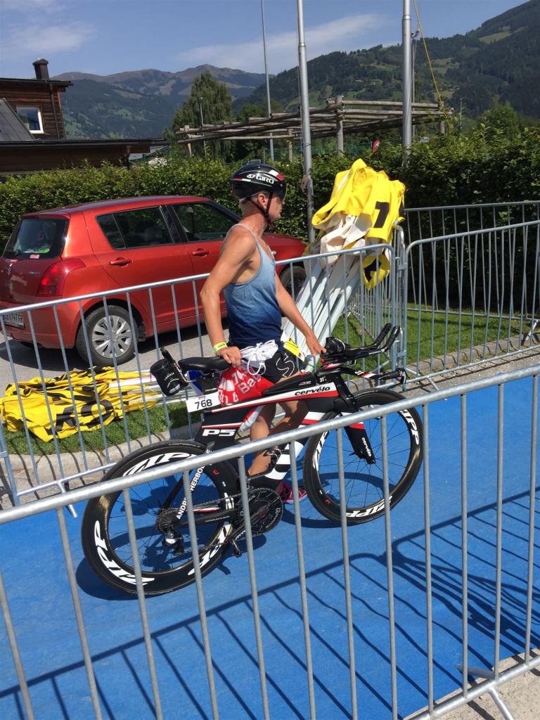 Schnell in die Wechselzone umziehen und dann aufs Rad. Es wird eine Runde mit insgesamt 870 Höhenmetern gefahren. Die ersten Kilometer sind meist flach, es läuft wunderbar. Ein 13 Kilometer langer Anstieg nach Dienten ist eines der Highlights der Radstrecke. Die ersten sechs Kilometer steigt die Strecke mit etwa 5,5 Prozent Steigung gemächlich an. Wer hier das Tempo zu hoch wählt, dem stellt sich auf den letzten zwei Kilometer mit bis zu 14 % Steigung eine Mauer auf. Leider habe ich, wie bereits in Klagenfurt, Probleme mit dem unteren Rücken. Ich versuche die Schmerzen zu verdrängen und mein Tempo zu fahren. Ich teile mir mein Tempo richtig ein und kurble den Berg hoch. Gefühlt werde ich von vielen überholt, ich behalte jedoch mein Tempo bei. Die Aussicht ist einfach phantastisch, ich versuche trotz Wettkampf die Strecke zu genießen. Am Filzensattel ist der höchste Punkt der Strecke erreicht, von 1.285 Metern Seehöhe geht es wieder bergab. Da ich die Strecke zum ersten Mal fahre bin ich etwas vorsichtig. Die Abfahrt ist am Anfang technisch sehr anspruchsvoll. Starkes Gefälle (15 %) und enge Kurven wechseln sich ab. Die Strecke ist jedoch hervorragend ausgezeichnet. Alle Kurven sind mit Schriftzeichen auf der Straße und Schildern markiert. Es wurde versucht alle Unebenheiten, Kanaldeckeln, Schlaglöcher … farblich zu markieren. Beeindruckend wieviel Mühe sich das Team hier gegeben hat. Im Zentrum von Kaprun ist eine ganz tolle Stimmung. Generell sind sehr viele Zuschauer auf der Strecke um die Athleten anzufeuern. Nach 3:08:14 Stunden steige ich vom Rad und es folgt die letzte Disziplin, das Laufen.