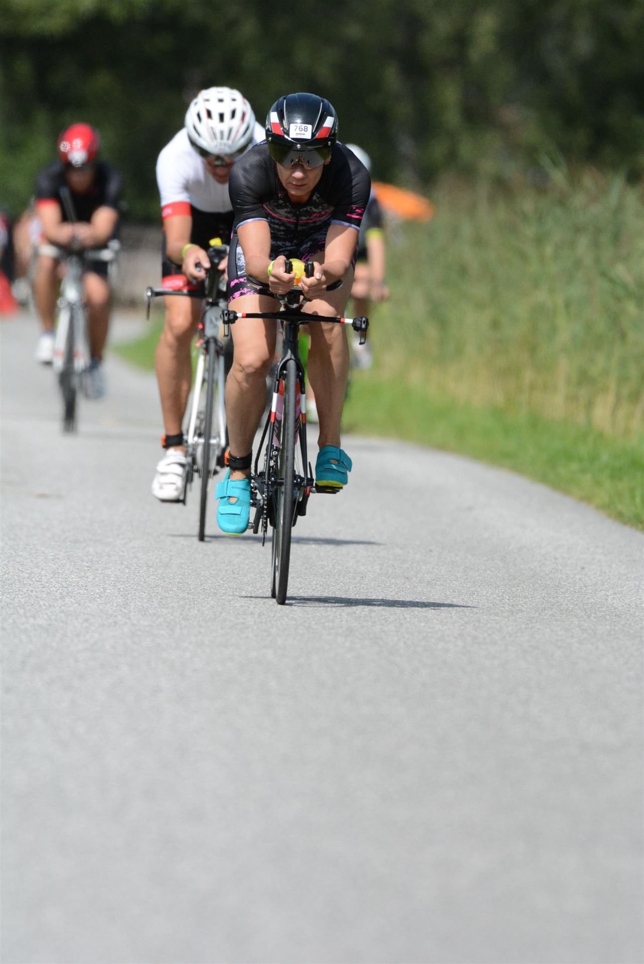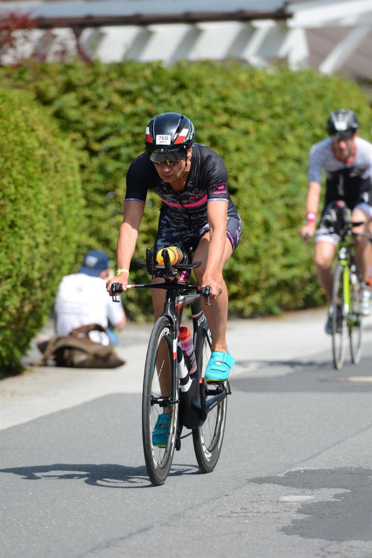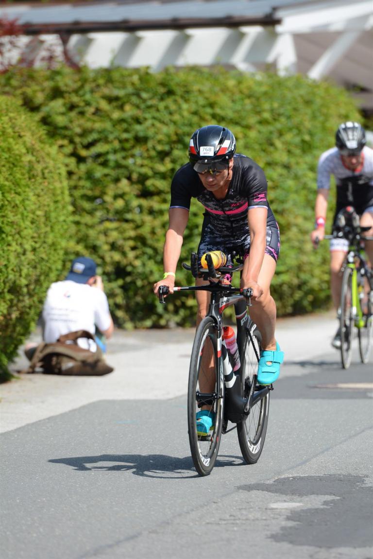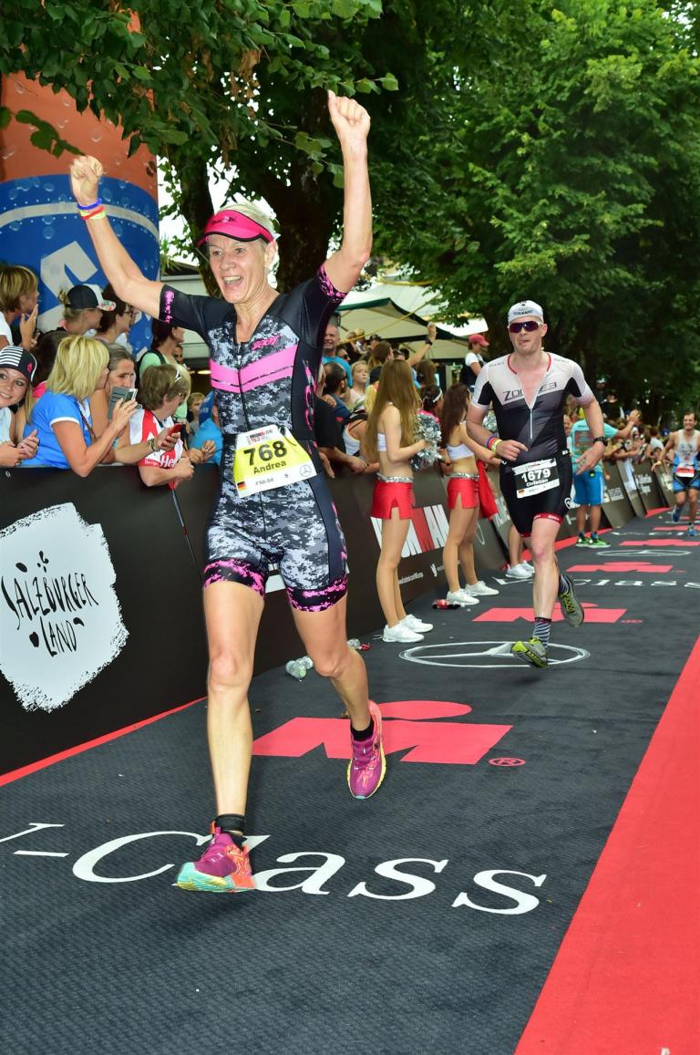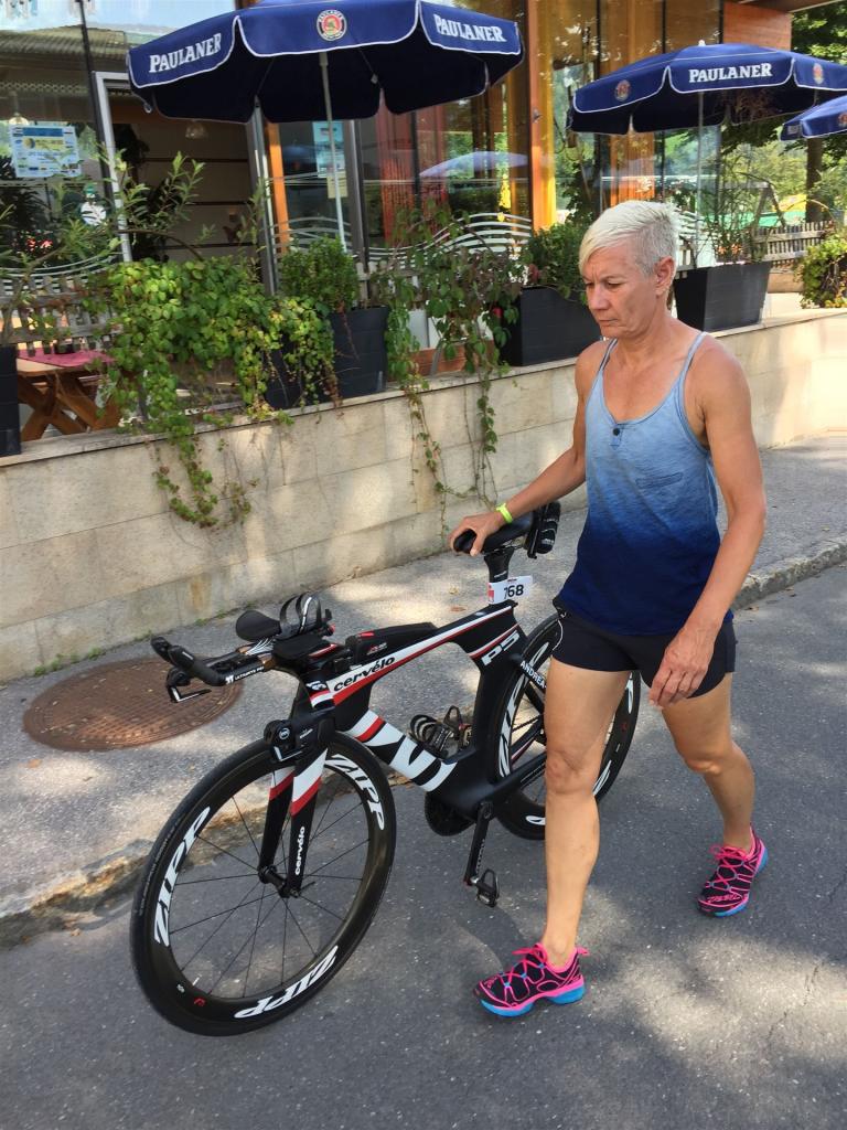 Schnell in die Wechselzone umziehen und dann aufs Rad. Es wird eine Runde mit insgesamt 870 Höhenmetern gefahren. Die ersten Kilometer sind meist flach, es läuft wunderbar. Ein 13 Kilometer langer Anstieg nach Dienten ist eines der Highlights der Radstrecke. Die ersten sechs Kilometer steigt die Strecke mit etwa 5,5 Prozent Steigung gemächlich an. Wer hier das Tempo zu hoch wählt, dem stellt sich auf den letzten zwei Kilometer mit bis zu 14 % Steigung eine Mauer auf. Leider habe ich, wie bereits in Klagenfurt, Probleme mit dem unteren Rücken. Ich versuche die Schmerzen zu verdrängen und mein Tempo zu fahren. Ich teile mir mein Tempo richtig ein und kurble den Berg hoch. Gefühlt werde ich von vielen überholt, ich behalte jedoch mein Tempo bei. Die Aussicht ist einfach phantastisch, ich versuche trotz Wettkampf die Strecke zu genießen. Am Filzensattel ist der höchste Punkt der Strecke erreicht, von 1.285 Metern Seehöhe geht es wieder bergab. Da ich die Strecke zum ersten Mal fahre bin ich etwas vorsichtig. Die Abfahrt ist am Anfang technisch sehr anspruchsvoll. Starkes Gefälle (15 %) und enge Kurven wechseln sich ab. Die Strecke ist jedoch hervorragend ausgezeichnet. Alle Kurven sind mit Schriftzeichen auf der Straße und Schildern markiert. Es wurde versucht alle Unebenheiten, Kanaldeckeln, Schlaglöcher … farblich zu markieren. Beeindruckend wieviel Mühe sich das Team hier gegeben hat. Im Zentrum von Kaprun ist eine ganz tolle Stimmung. Generell sind sehr viele Zuschauer auf der Strecke um die Athleten anzufeuern. Nach 3:08:14 Stunden steige ich vom Rad und es folgt die letzte Disziplin, das Laufen.