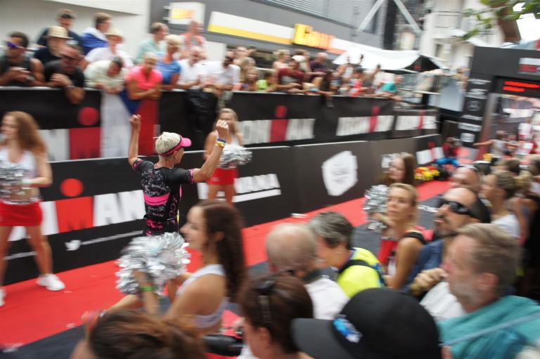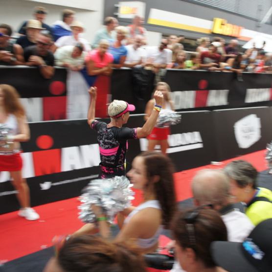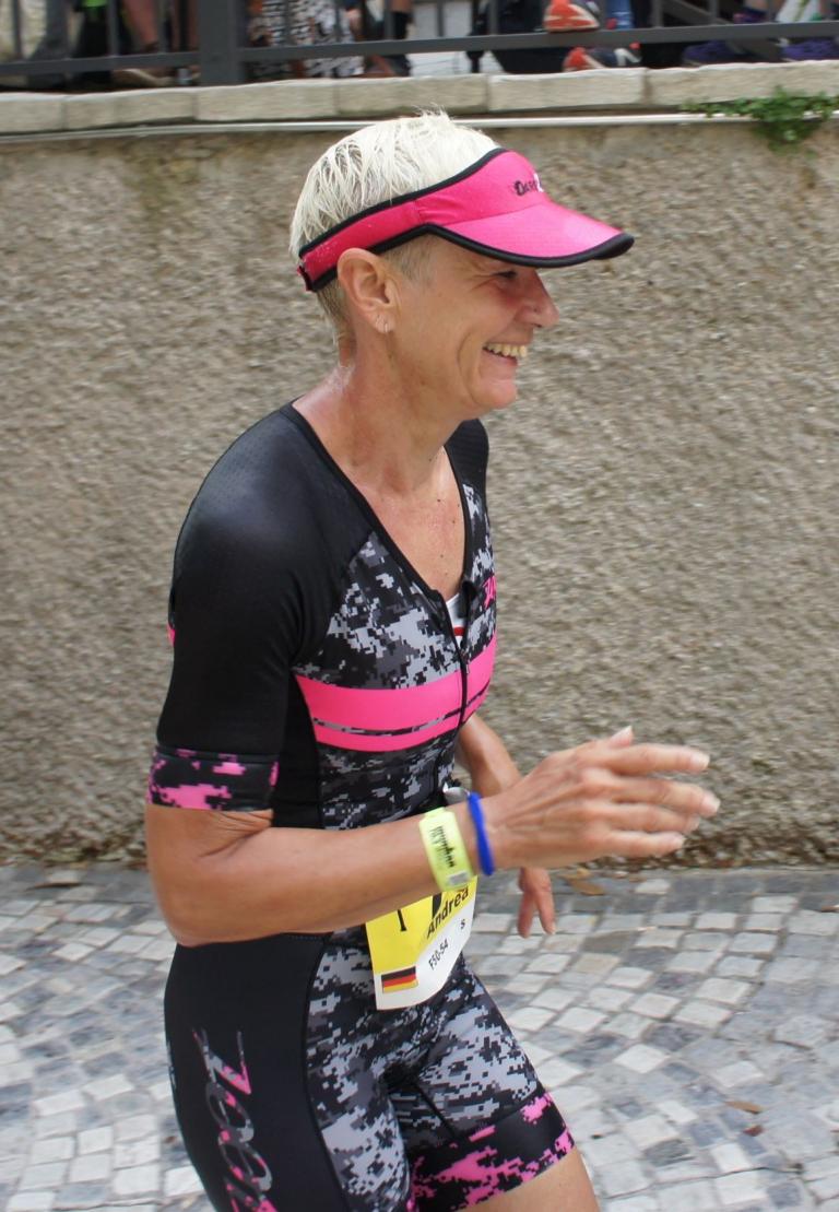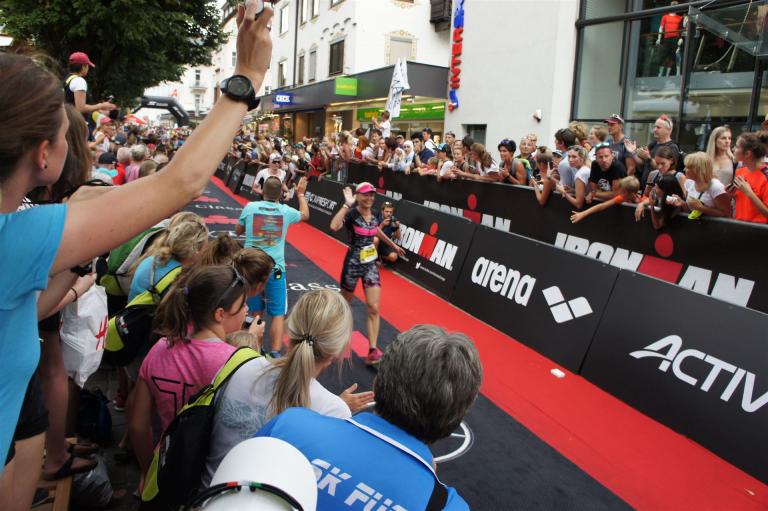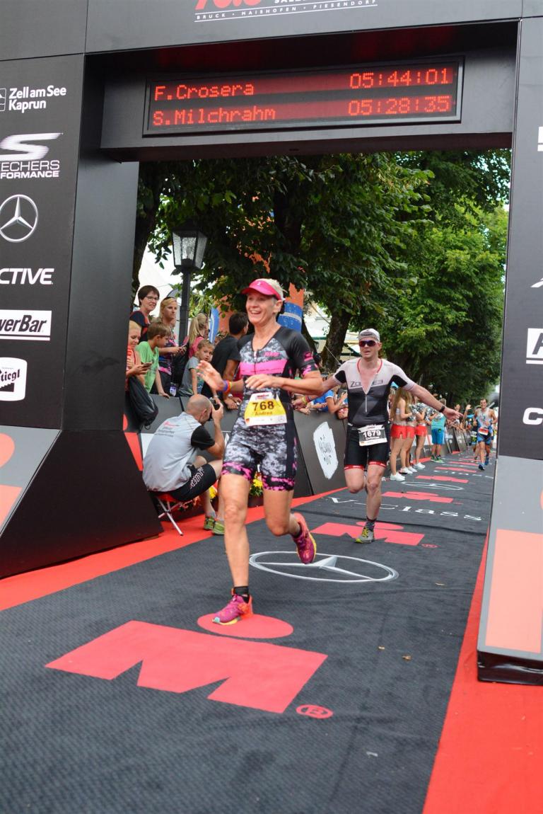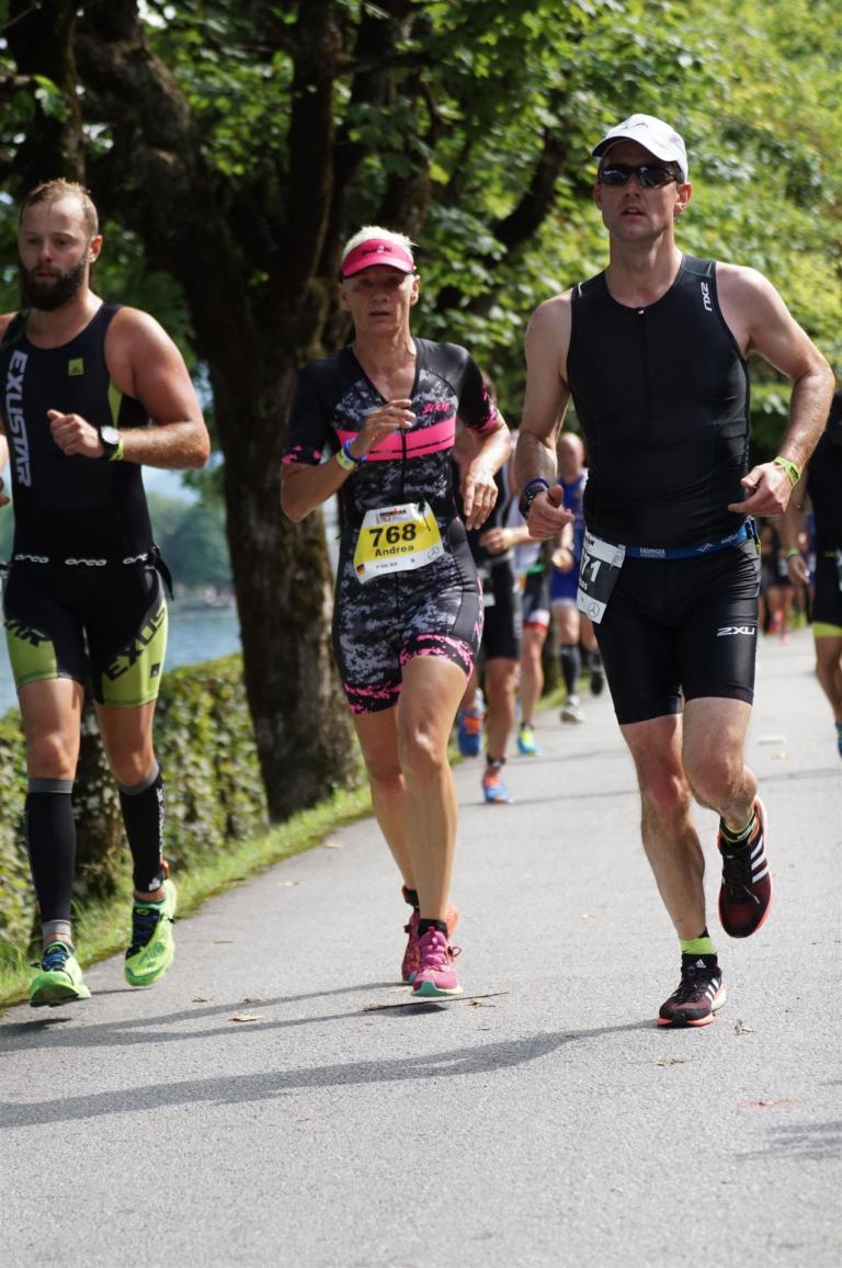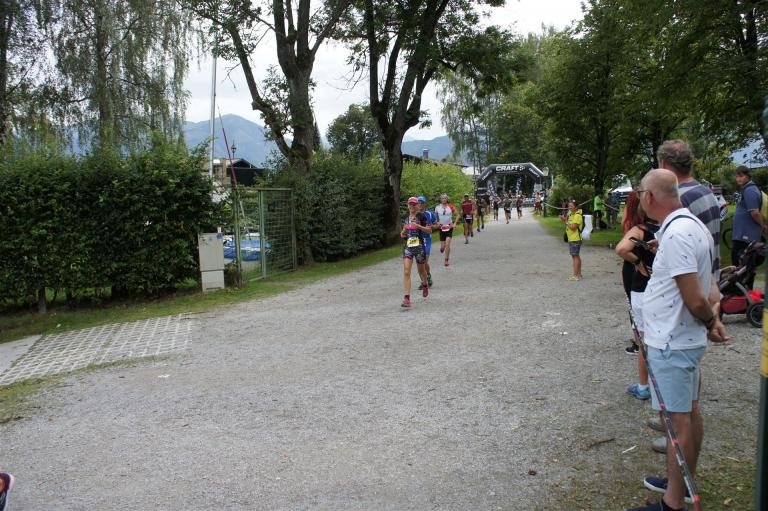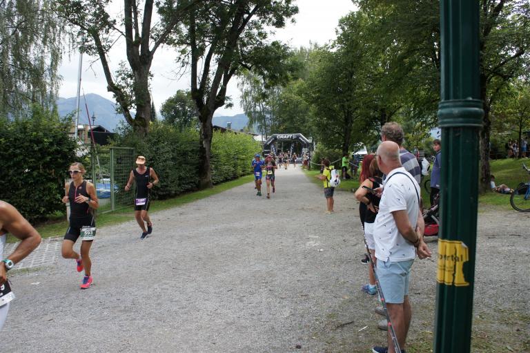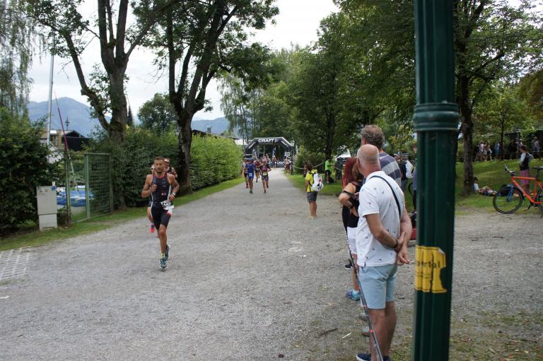 Die ersten 2-3 Kilometer fallen mir sehr schwer. Die Beine sind müde und ich kann mein Tempo nicht finden, was sehr ungewöhnlich für mich ist. Normalerweise habe ich keine Anlaufprobleme nach dem Rad. Meinem Rücken geht es sehr gut, daran kann es nicht liegen. Nachdem ich eine Runde durch die Stadt gelaufen bin und die Zuschauer mich angefeuert und motiviert haben geht es mir langsam besser. Mein Kopf ist positiv und die nächsten 18 Kilometer können kommen. Die Strecke führt am See entlang, ein tolles Panorama. Die Strecke ist teilweise Asphalt aber auch viel Schotter. Man gewöhnt sich irgendwann an den Schotter, die Zuschauer und die tolle Strecken helfen dabei. Gesamt werden 2 Runden mit einigen hoch-tief Passagen gelaufen. Das Ziel ist direkt in der Stadt. Die Finisherline ist voll, man wird angefeuert, es wird gejubelt, eine ganz tolle Stimmung. Für den Halbmarathon habe ich eine Zeit von 1:53:04 benötigt.