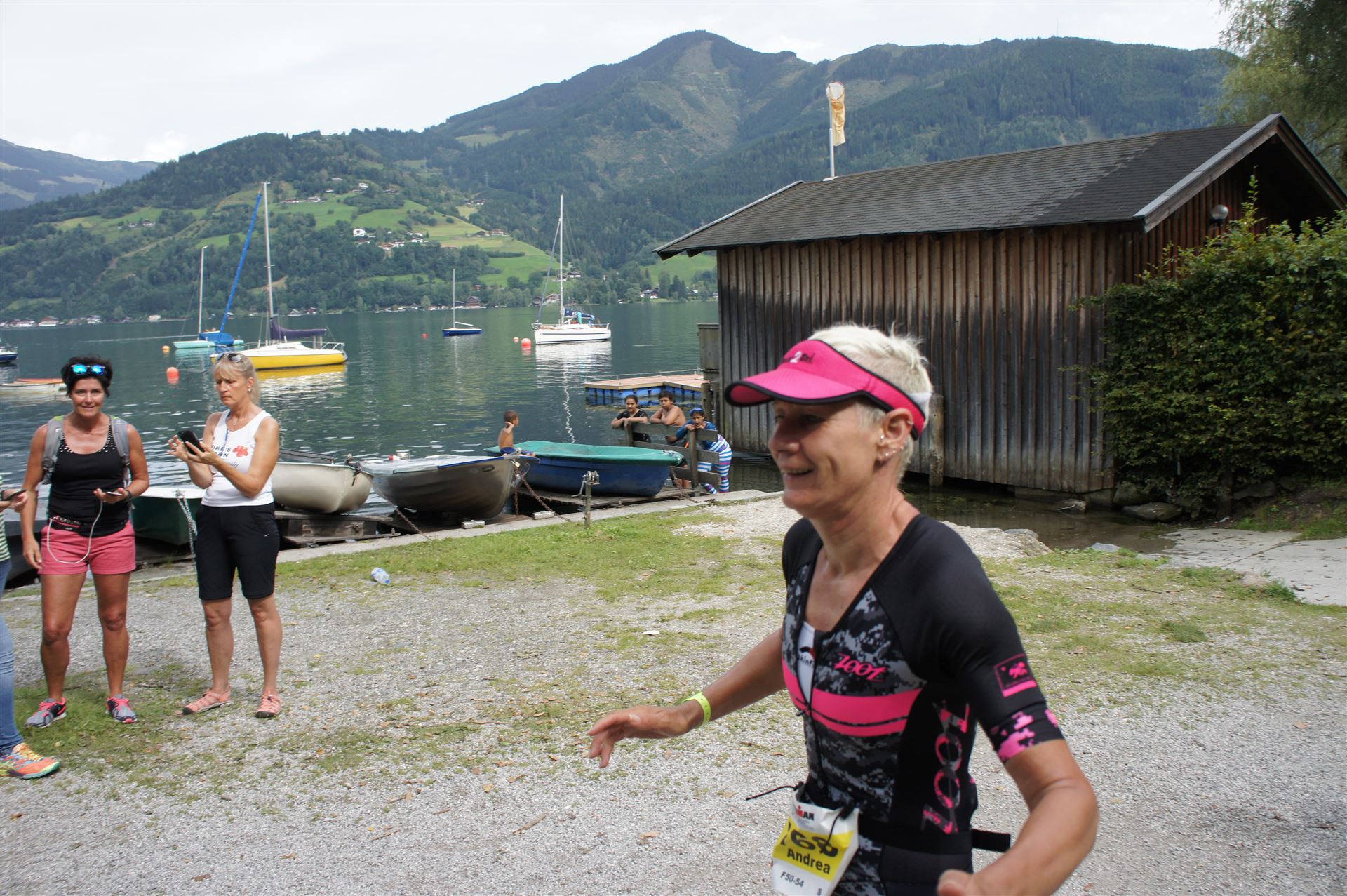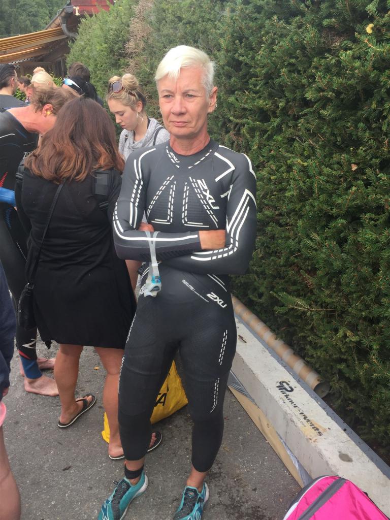 Um 11:00 Uhr fällt der Startschuss für die Profis Männer (eine sehr humane Zeit, man muss nicht so früh aufstehen). Die Sonne kommt langsam aus den Wolken hervor, die umliegenden Berge ergeben ein tolles Panorama. Bei diesem Anblick kann es nur ein toller Wettkampf werden. Direkt nach den Männern gehen die Profi–Frauen an den Start. Einige Minuten später beginnt für die Agegrouper der Rollingstart. Alle Sekunden gehen einige Athleten ins Wasser. Ich habe mich entsprechend meiner Schwimmzeit im Block 30-35 Minuten eingeordnet. Es wird eine Runde geschwommen. Der Kurs geht gerade aus bis zur großen Boje und wieder zurück. Das Schwimmen ist komplett Stressfrei. Durch das rollierende System gibt es kein Gehaue und Gedränge. Jeder kann seinen Rhythmus schwimmen. Nach 0:35:32 Minuten komme ich entspannt aus dem Wasser. Inzwischen scheint die Sonne, es wird ein wunderbarer Tag.
