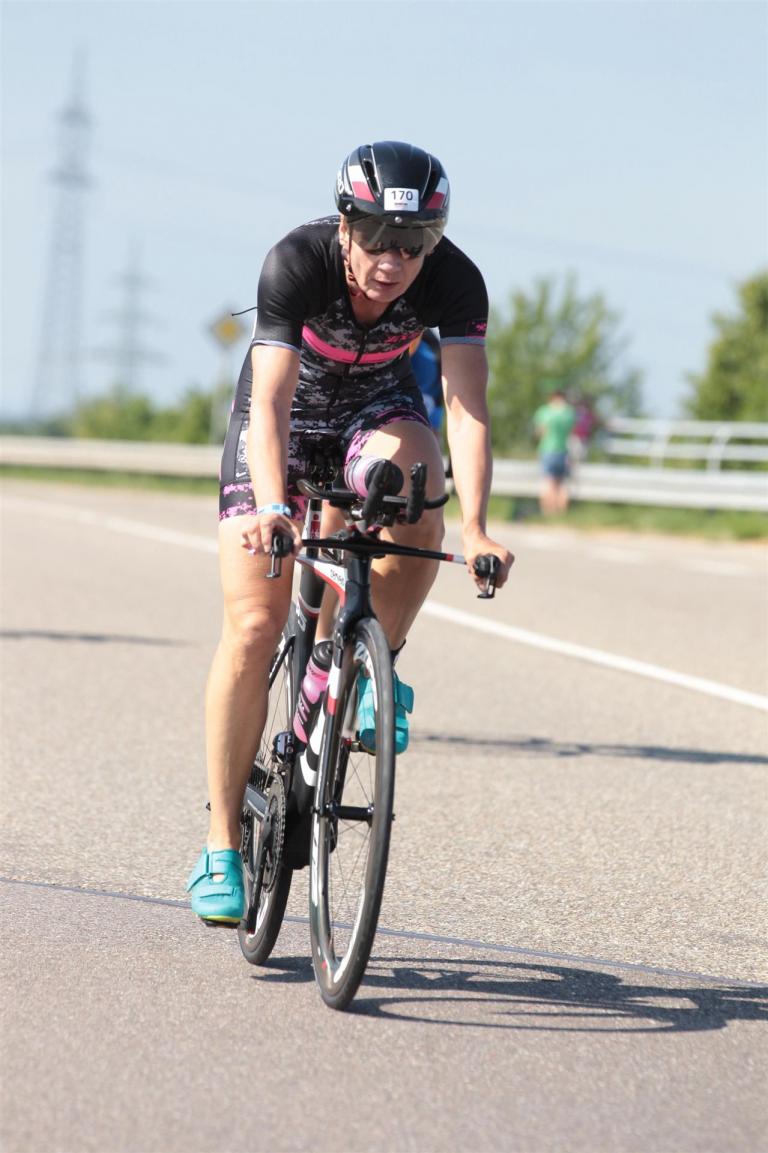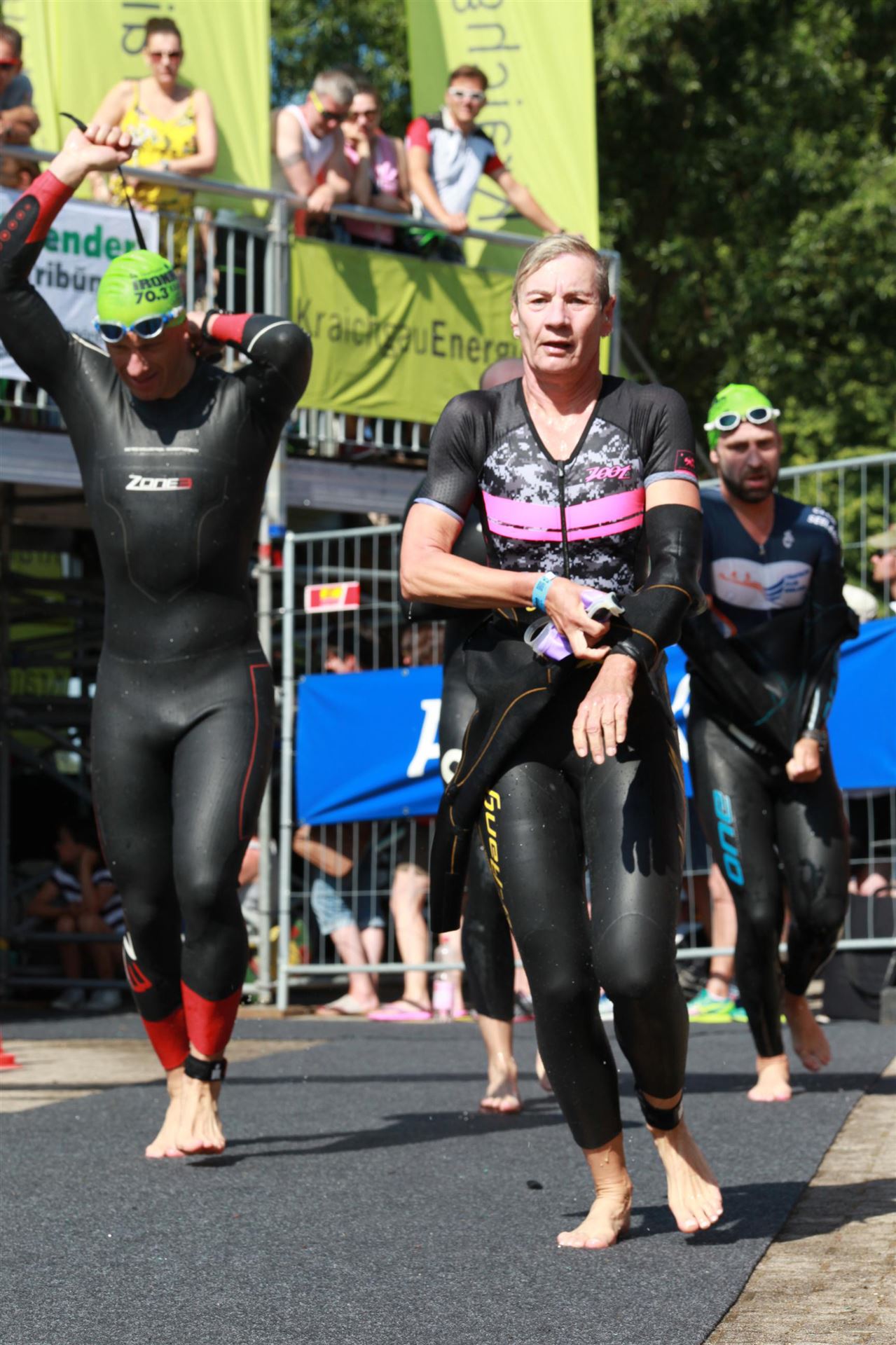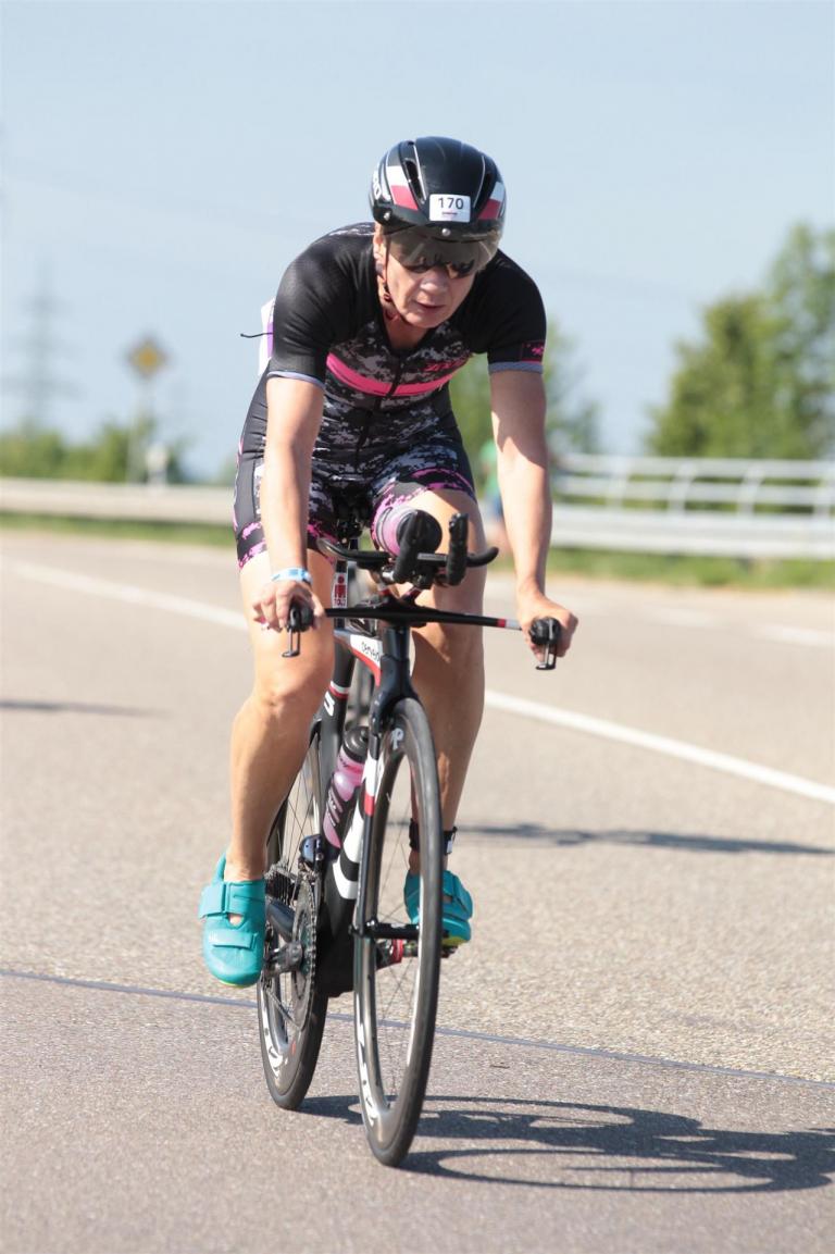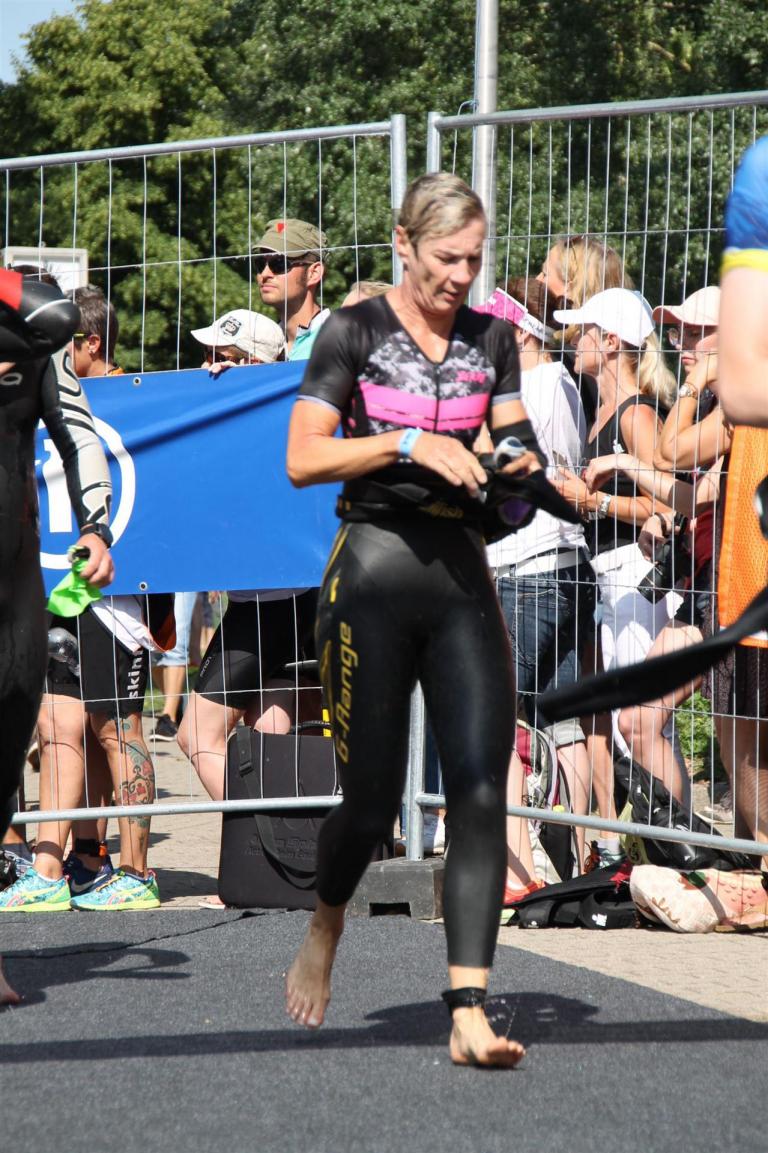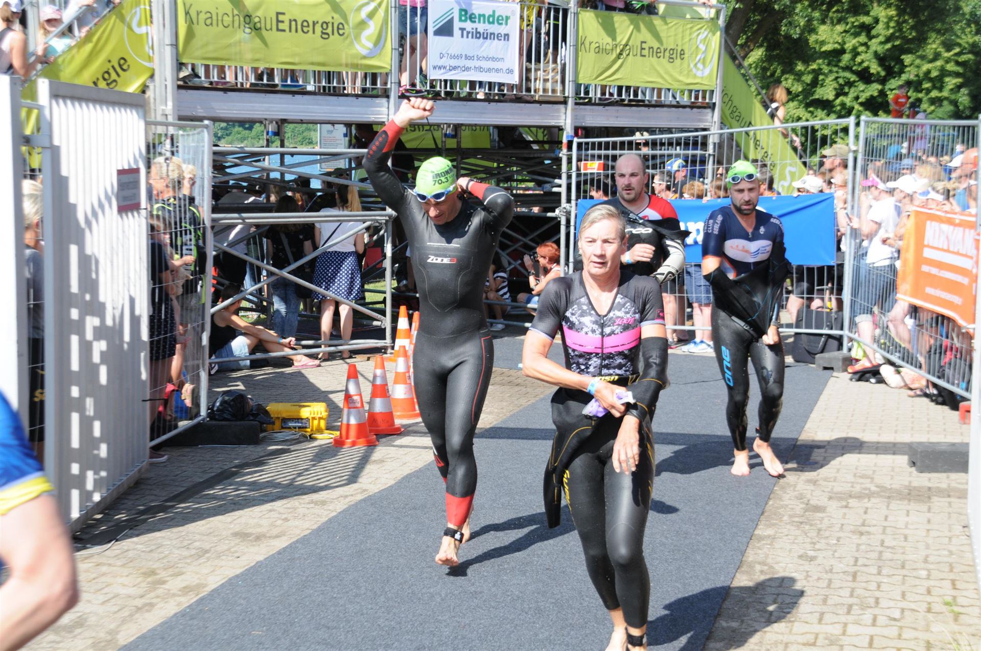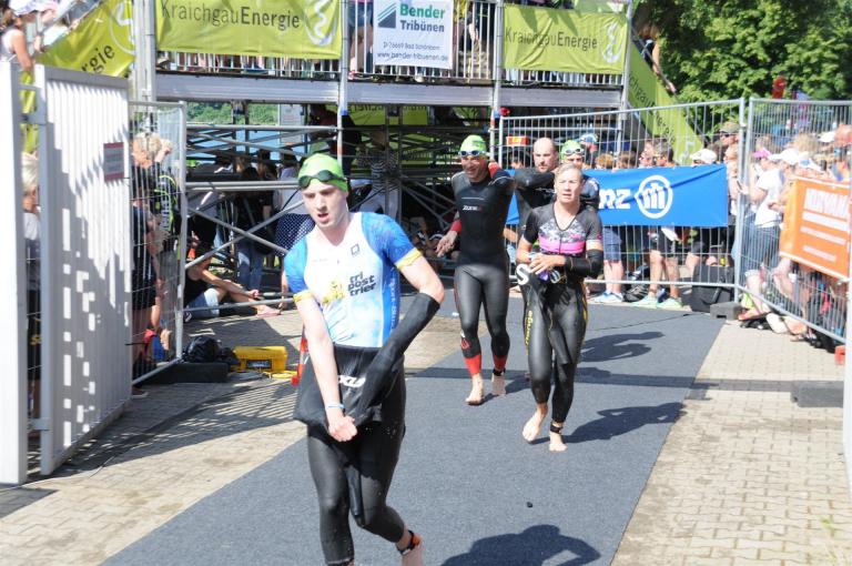 Geschwommen wurde im Hardtsee in Ubstadt-Weiher. Bei einer Wassertemperatur von 23,7 Grad durften wir mit Neo schwimmen, für die Profis galt Neoverbot. Mit einer Schwimmzeit von 36:25 ging ich als 3. Frau in meiner AK aus dem Wasser.