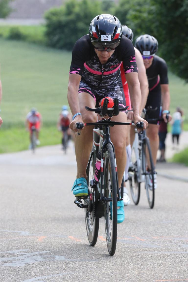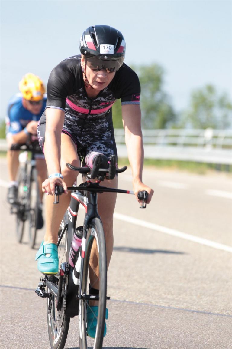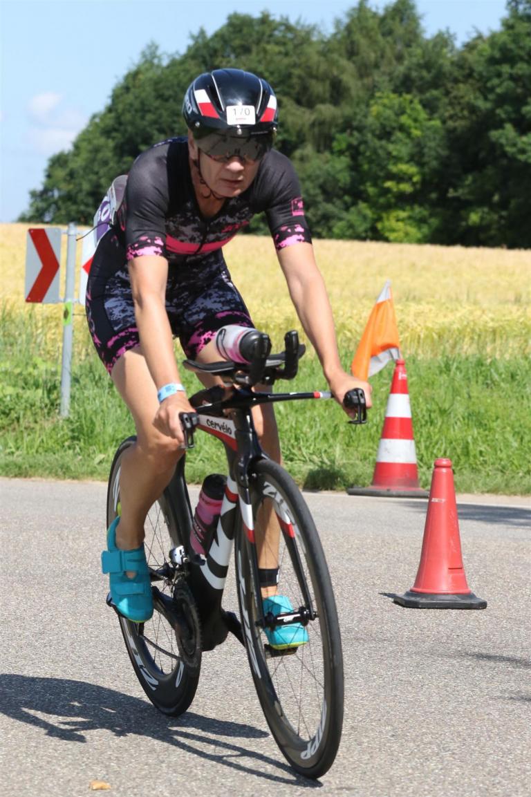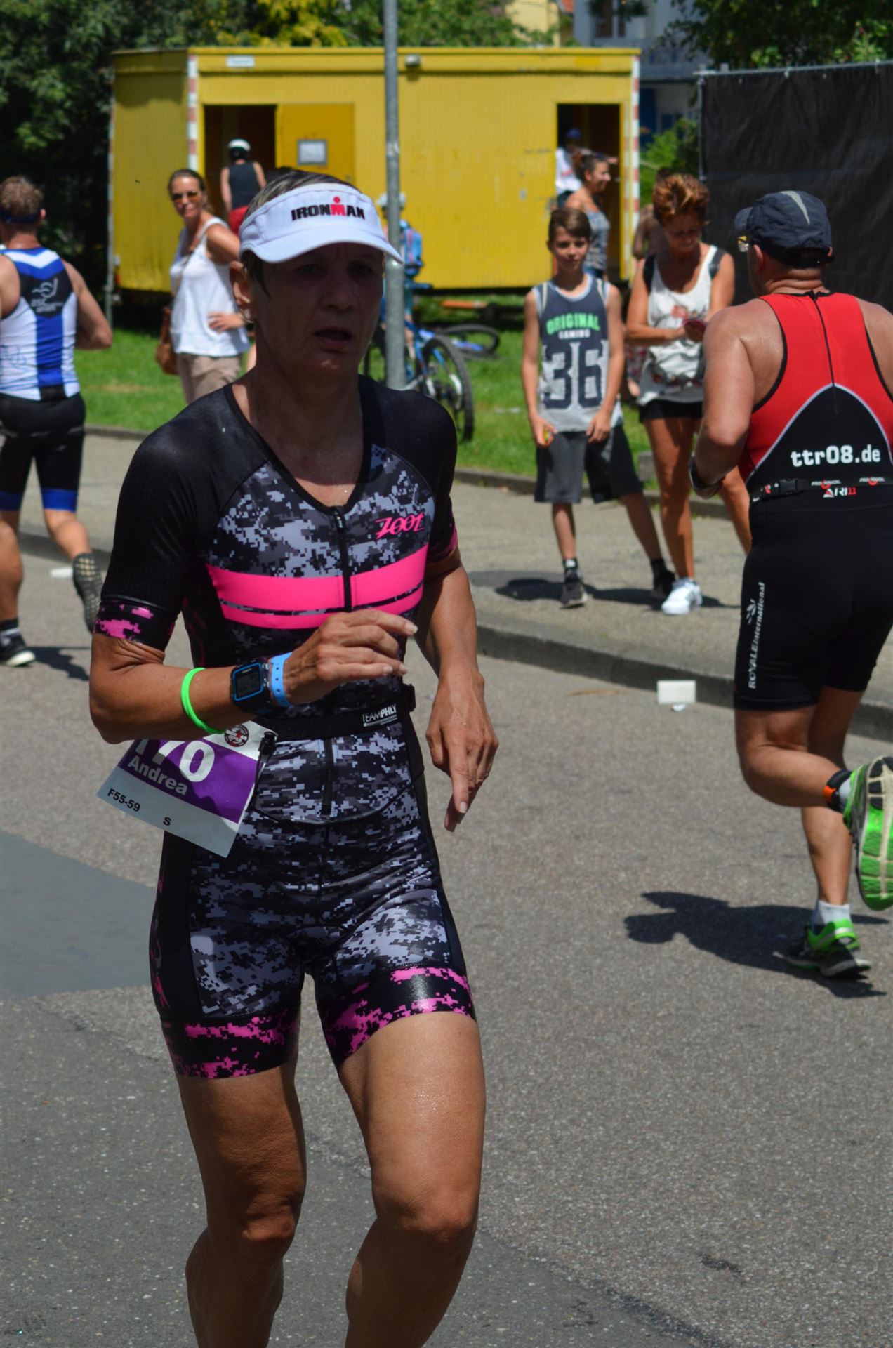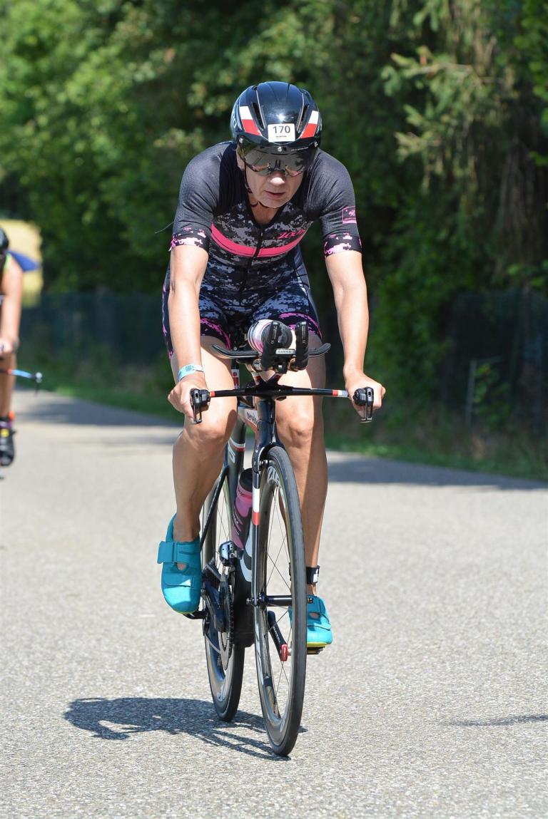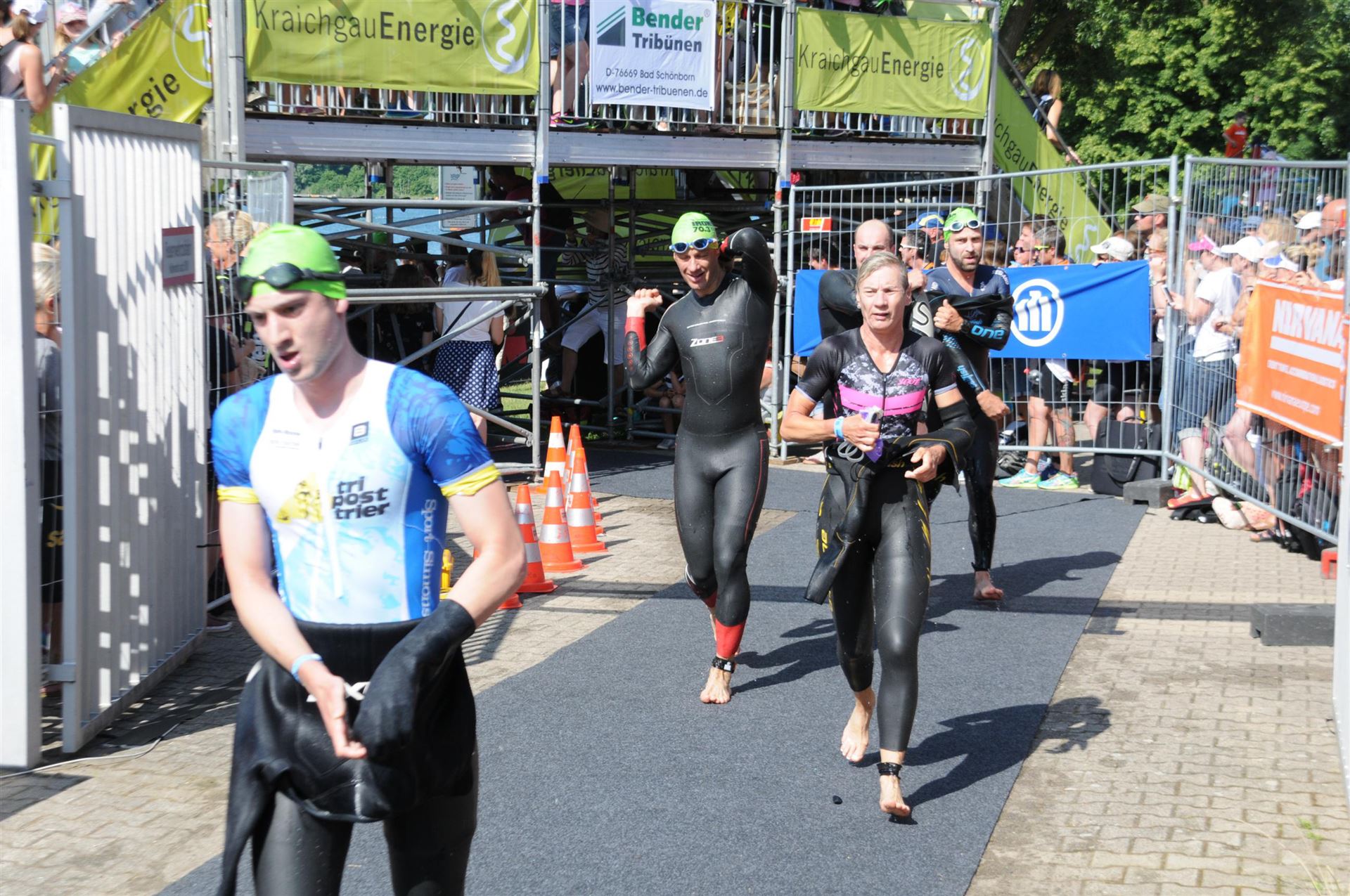 Geschwommen wurde im Hardtsee in Ubstadt-Weiher. Bei einer Wassertemperatur von 23,7 Grad durften wir mit Neo schwimmen, für die Profis galt Neoverbot. Mit einer Schwimmzeit von 36:25 ging ich als 3. Frau in meiner AK aus dem Wasser.