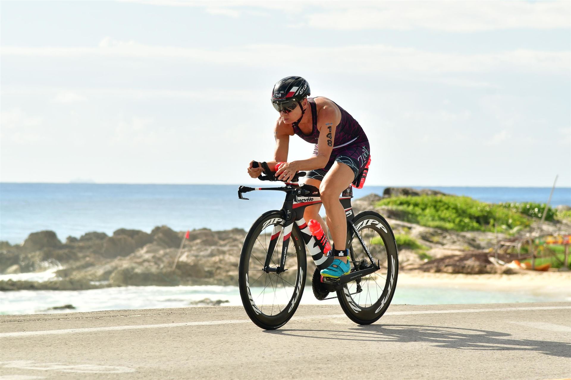 Zügig zum Rad und dann ab auf die erste Runde. Da mein Magen noch immer rebelliert verzichte ich die erste Zeit auf jegliche Nahrungs- bzw. Flüssigkeitsaufnahme. Das erste Stück geht an diversen Hotels und Restaurants vorbei. Die Strecke ist überwiegend geradeaus. Nichts spektakuläres. Ein großes Teilstück verläuft parallel zum Meer, der Ausblick ist einfach toll. Schön, wenn man während einem Rennen noch solch ein Panorama genießen kann. Am Anfang ist die Radstrecke noch etwas voll, das wird jedoch von Kilometer zu Kilometer besser. Ich fühle mich sehr gut und kann mein Tempo fahren. Ich freue mich, wenn ich den ein- oder anderen Athleten überholen kann, das bringt zusätzliche Motivation. Ich versuche die meiste Zeit abgelegt zu fahren, das minimiert den Windwiderstand. Die Verpflegungsstellen sind sehr dicht beieinander, man kann seine Flaschen auffüllen und sich mit Wasser kühlen. Ist perfekt organisiert. Insgesamt muss man 3 Runden fahren. 2 x 63 Kilometer und die letzte Runde noch 54 Kilometer. Ich versuche möglichst konstant mein Tempo zu fahren und fühle mich ausgezeichnet. Es steht ja im Anschluss noch ein Marathon an. Das Gefühl ist toll, als ich nach 3 Runden in Richtung Wechselzone abbiegen kann und bin erstaunt, wie viele erst jetzt auf die 3. Runde gehen. Schnell das TT Bike an einen Helfer abgeben und dann mit dem Laufbeutel ins Wechselzelt. Meine Radzeit von 5:30:34 ist eine tolle Zeit für mich.