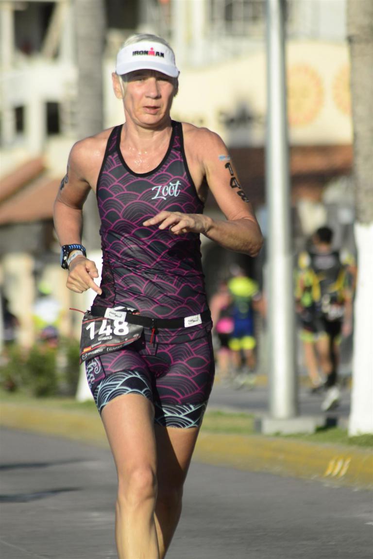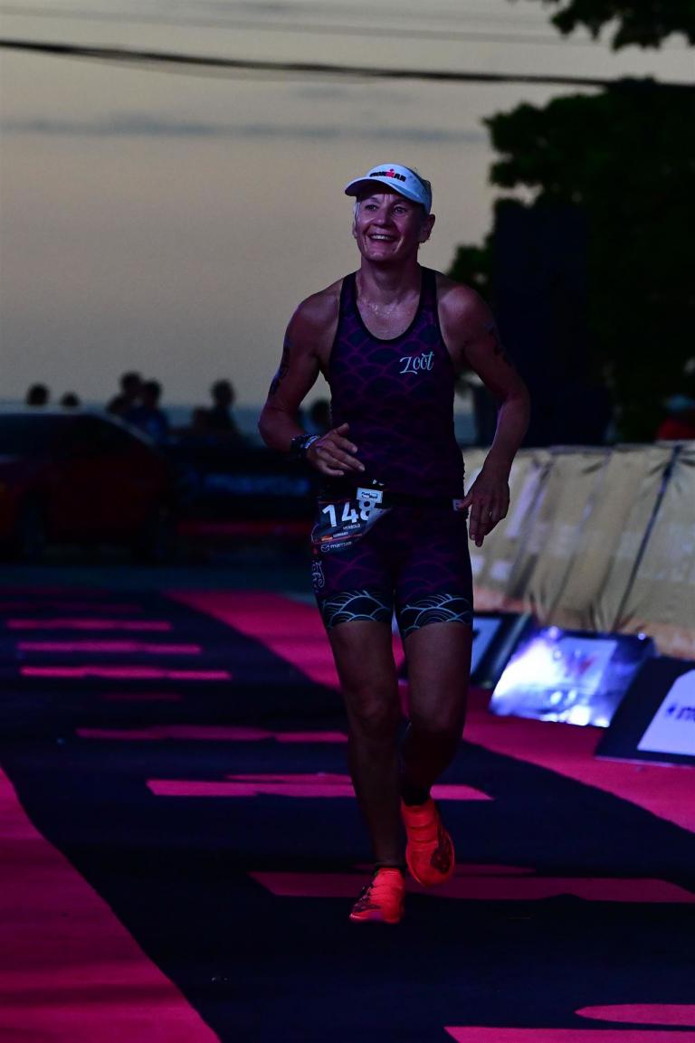 Als ich auf die Laufstrecke abbiege ruft mir Werner zu, dass ich auf dem 3. Platz liege. Das pusht natürlich und man läuft mit einem super Gefühl los. Die Strecke besteht aus 3 Runden mit jeweils 14 Kilometer. 7 Kilometer in eine Richtung und dann wieder zurück. Auf jedem Kilometer gibt es eine Verpflegungsstelle, das ist toll für die Athleten. Nach der ersten Runde gibt mir Werner die Info, dass ich inzwischen auf dem 2. Platz liege. Ich gehe mit einem tollen Gefühl auf die zweite Runde. Tolles Gefühl ist natürlich relativ, ich Laufe was geht, es ist kein Spaß, aber der 2. Platz motiviert. Ich nehme mir vor, diesen Platz auf jeden Fall zu verteidigen, man braucht ja Ziele. Kurz vor Ende der 2. Runde ruft mir Werner zu, dass die erste Frau in meiner AK nur noch 5 Minuten Vorsprung hat. Am Anfang vom Laufen waren es fast 20 Minuten. Ich werde das Gefühl nicht los, es läuft alles super.
