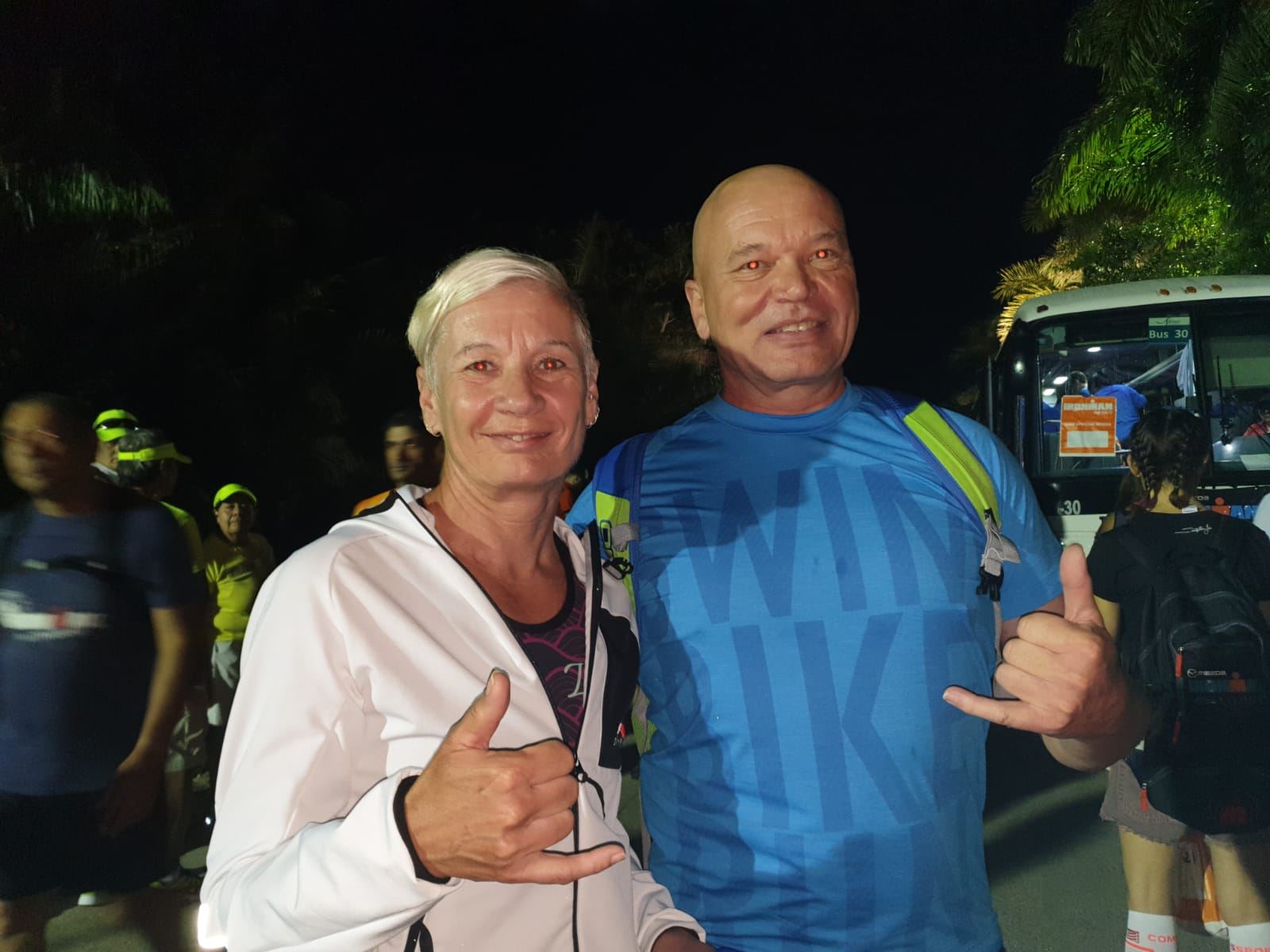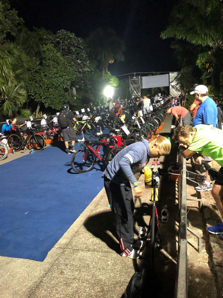 Um 4:30 Uhr gibt es bereits Frühstück im Hotel. Um diese Uhrzeit kann ich kaum etwas essen, es ist einfach zu früh. Nach dem alles für den anstehenden Wettkampf gerichtet ist fahren wir mit Hannes zur Wechselzone T1. Man erledigt routiniert die einzelnen Schritte. Rad überprüfen, Luft aufpumpen, Getränke und Verpflegung richten. Dies ist bereits meine 11te Langdistanz. Nachdem alles fertig ist verabschiede ich mich von Werner und es geht mit dem Bus zum Schwimmstart. Es ist alles super organisiert. Die Leute sind nett und relativ entspannt. Es herrscht eine gute Stimmung am Start. Die Wartezeit überbrücke ich zusammen mit einem Brasilianer. Wir halten etwas Smalltalk, natürlich über das Thema Triathlon und Wettkämpfe. Das entspannt und die Zeit geht schneller vorbei.
