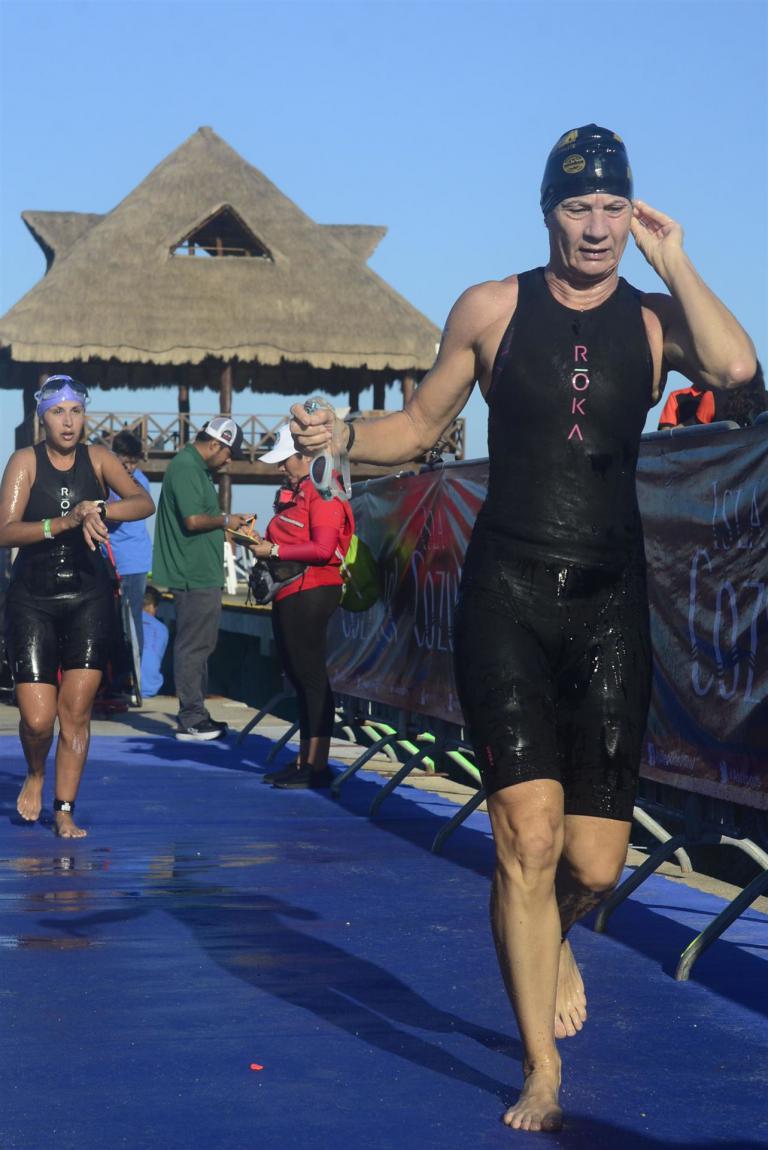 Ab 7:30 Uhr gehen die Agegrouper ins Wasser. Durch den Rollingstart gibt es kein Gedränge. Ich gehe circa um 7:42 Uhr ins Wasser. Es liegen 3,8 km im Meer schwimmen vor mir. Die Wellen meinen es an diesem Morgen gut mit mir. Der Seegang ist verhalten, meine Übelkeit erträglich. Man hat das Gefühl, man schwimmt in einem Aquarium. Man hat eine tolle Sicht. Ab und an sieht man einen Taucher am Meeresboden. Sicherheit wird groß geschrieben. Zumal aufgrund der Wassertemperatur ohne Neo geschwommen wird. Es gibt eine leichte Strömung, was die Schwimmzeit um einiges verkürzt. Die Strecke ist gut markiert, es geht 3.800 Meter in eine Richtung. Nach 1:06:04 steige ich aus dem Wasser.