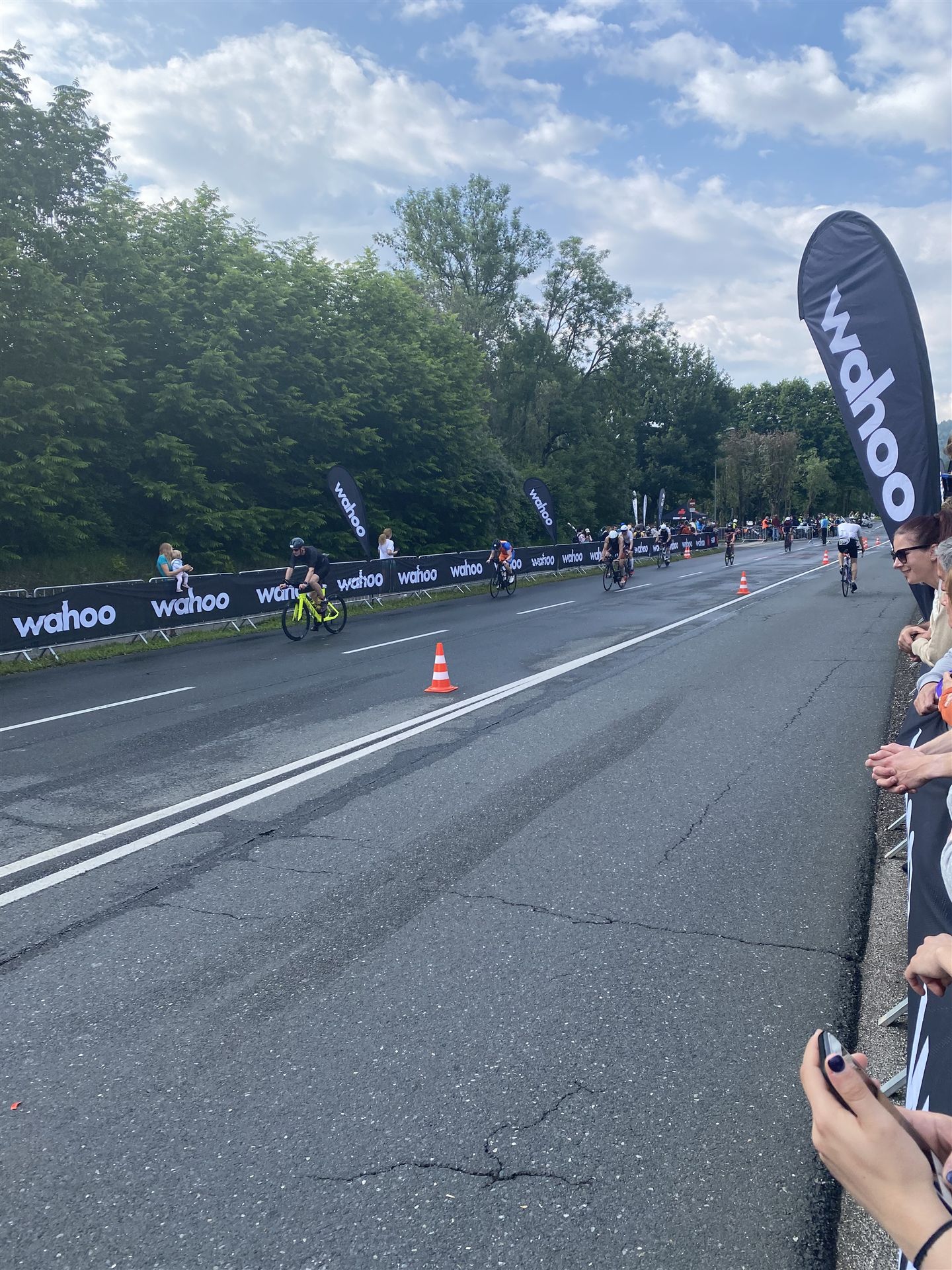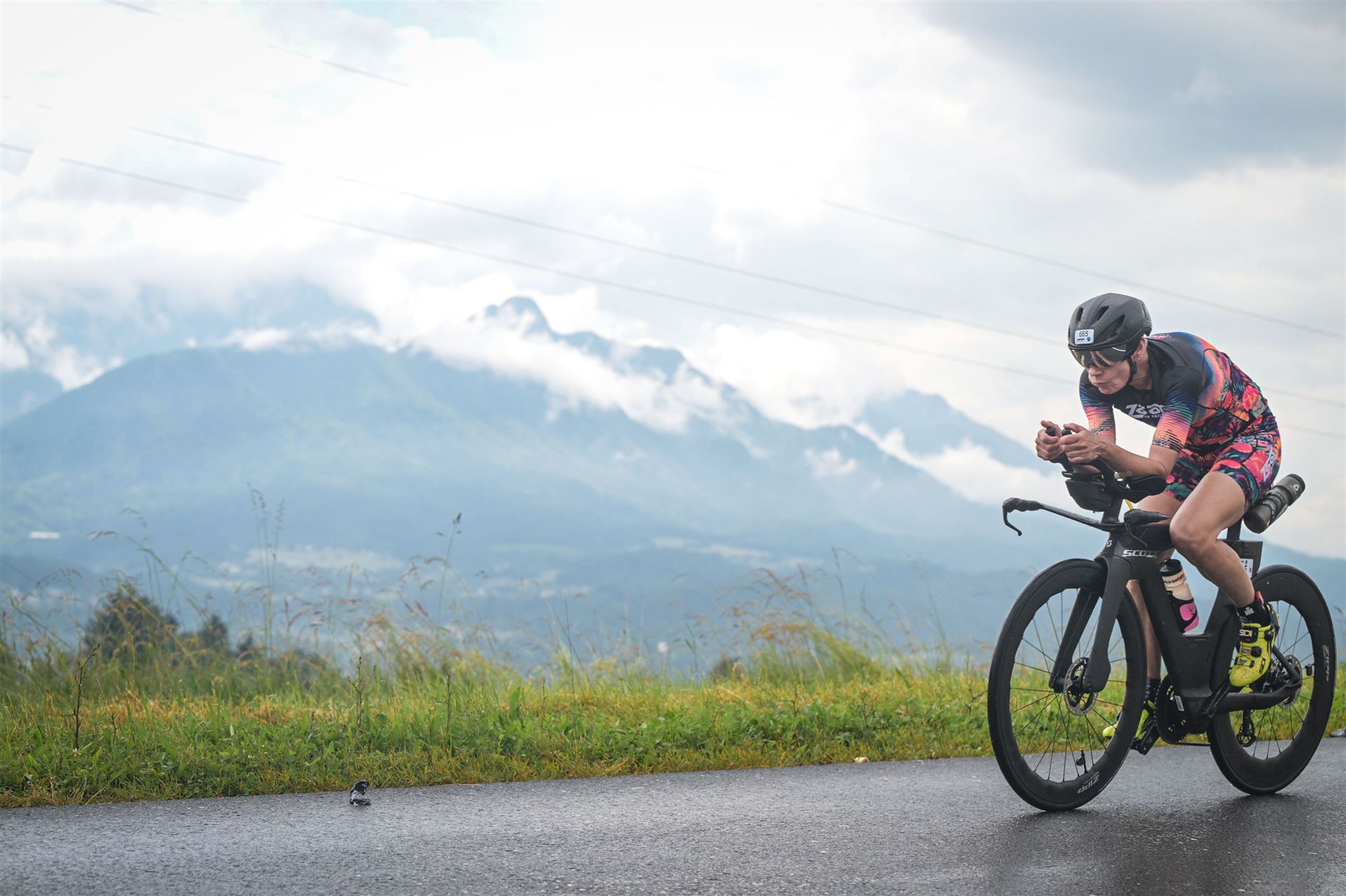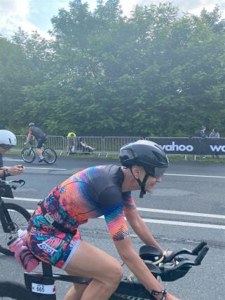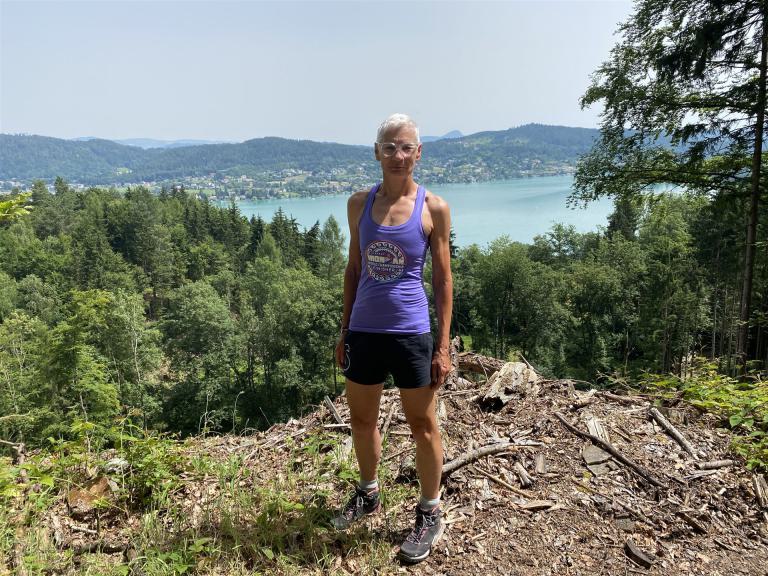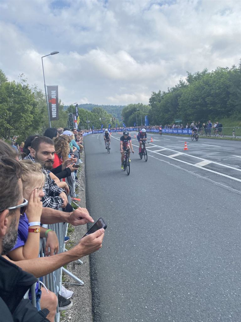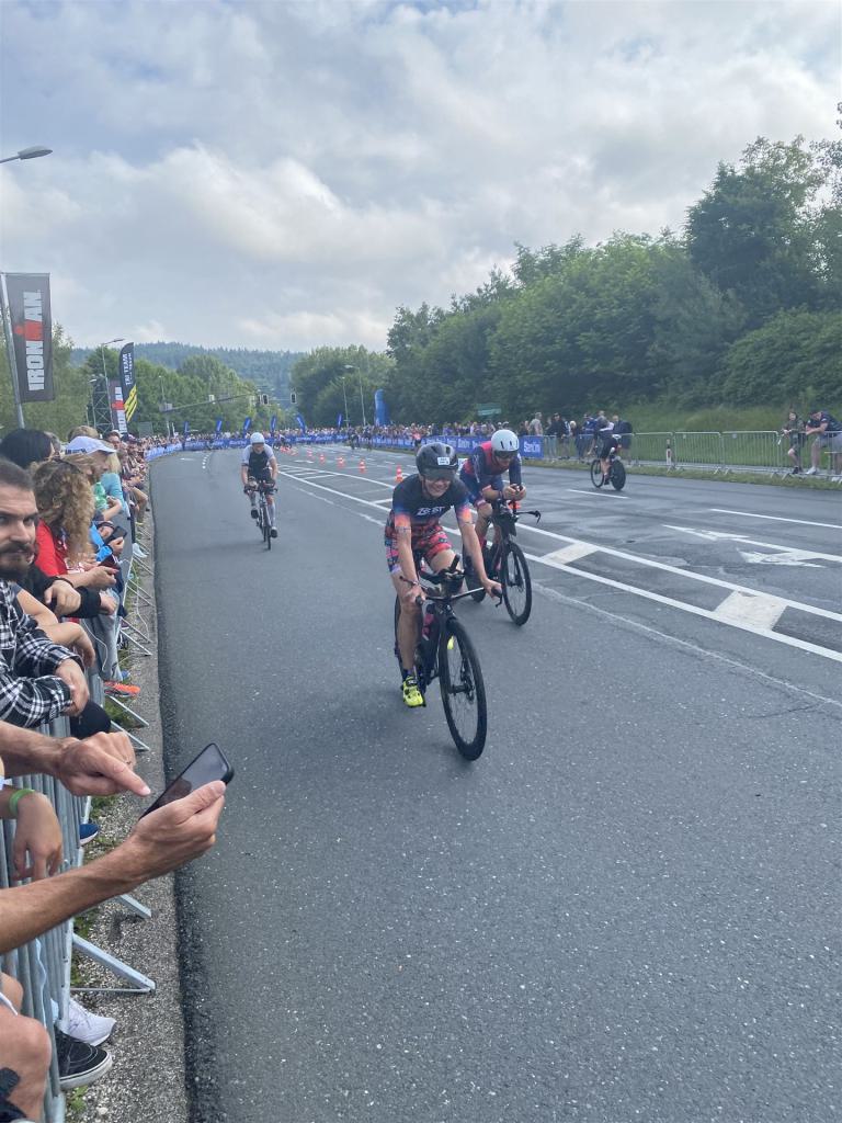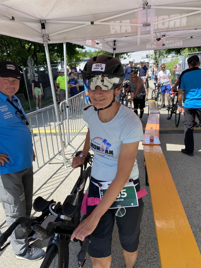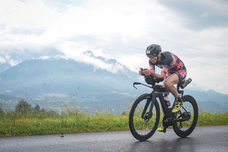 Aufgrund der für meine Verhältnisse niedrigen Temperaturen ziehe ich Socken mit klassischen Rennradschuhen sowie ein Trikot über. Das war die beste Entscheidung. Das erste Stück der Radstrecke führt am Wörthersee entlang. Die Straßen sind noch nass vom Regen, dafür ist die Aussicht traumhaft. Es lässt sich relativ gut fahren, durch den Rolling-Start ist das Feld nicht so dicht. Selbstverständlich muss man schauen, dass man keinen Windschatten fährt, es klappt aber ganz gut. Der erste längere Anstieg ist der Faaker See. Aufgrund der Wetterverhältnisse sind nicht viele Zuschauer am Anstieg. Ich kurble den Anstieg im kleinen Gang hoch, ist kein Problem für mich. Danach kommt ein flaches Stück, da gibt es immer relativ viel Gegenwind. Ich fühle mich sehr gut auf dem Rad, habe Druck auf den Pedalen und kann den Wettkampf genießen. Die Wettervorhersage passt leider nicht ganz zum tatsächlichen Wetter. Es gibt Strecken mit Starkregen, die Straßen sind sehr nass, bei den Abfahrten muss man aufpassen. Den zweiten längeren Anstieg (Ruperti Berg) fahre ich auch ohne Probleme, bei den Abfahrten muss man aufpassen. Der 180 Kilometerkurs besteht aus 2 Runden. Die Anstiege müssen zweimal gefahren werden. Auf der zweiten Runde sind die Steigungen dann doch etwas schwerer. Insgesamt bin ich mit meiner Radzeit von 6:01:37 Stunden sehr zu frieden.