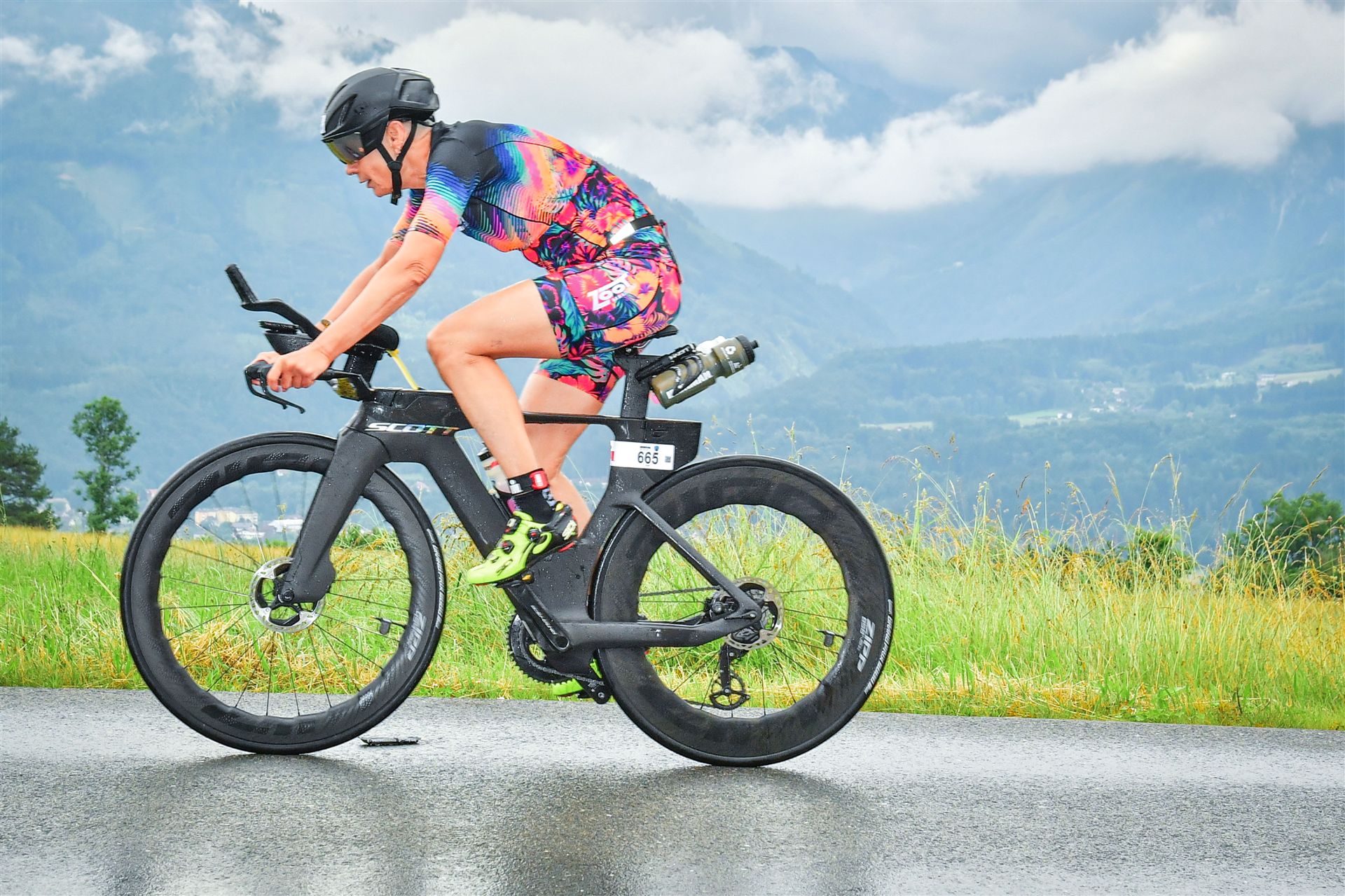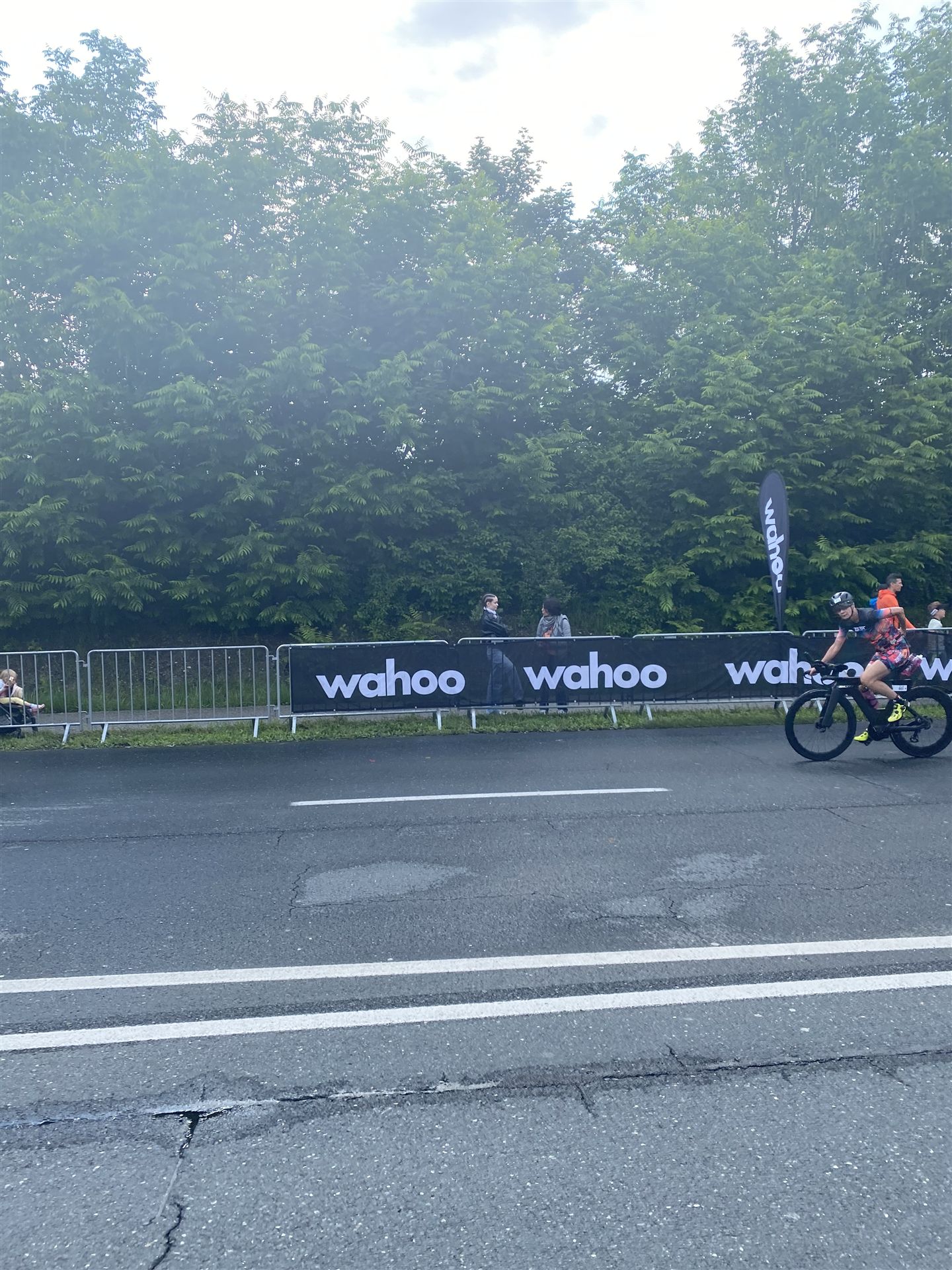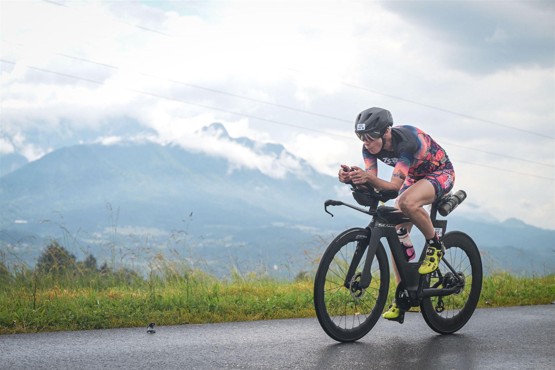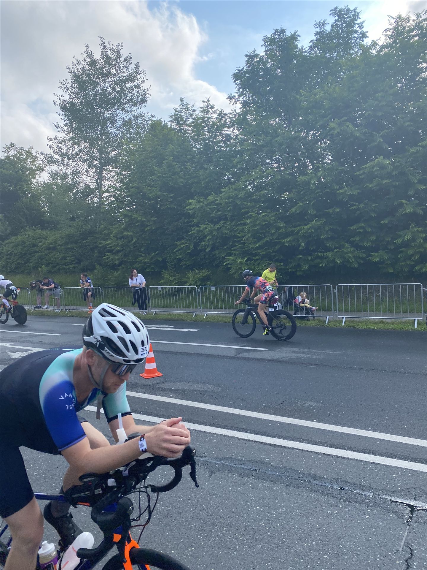 Aufgrund der für meine Verhältnisse niedrigen Temperaturen ziehe ich Socken mit klassischen Rennradschuhen sowie ein Trikot über. Das war die beste Entscheidung. Das erste Stück der Radstrecke führt am Wörthersee entlang. Die Straßen sind noch nass vom Regen, dafür ist die Aussicht traumhaft. Es lässt sich relativ gut fahren, durch den Rolling-Start ist das Feld nicht so dicht. Selbstverständlich muss man schauen, dass man keinen Windschatten fährt, es klappt aber ganz gut. Der erste längere Anstieg ist der Faaker See. Aufgrund der Wetterverhältnisse sind nicht viele Zuschauer am Anstieg. Ich kurble den Anstieg im kleinen Gang hoch, ist kein Problem für mich. Danach kommt ein flaches Stück, da gibt es immer relativ viel Gegenwind. Ich fühle mich sehr gut auf dem Rad, habe Druck auf den Pedalen und kann den Wettkampf genießen. Die Wettervorhersage passt leider nicht ganz zum tatsächlichen Wetter. Es gibt Strecken mit Starkregen, die Straßen sind sehr nass, bei den Abfahrten muss man aufpassen. Den zweiten längeren Anstieg (Ruperti Berg) fahre ich auch ohne Probleme, bei den Abfahrten muss man aufpassen. Der 180 Kilometerkurs besteht aus 2 Runden. Die Anstiege müssen zweimal gefahren werden. Auf der zweiten Runde sind die Steigungen dann doch etwas schwerer. Insgesamt bin ich mit meiner Radzeit von 6:01:37 Stunden sehr zu frieden.