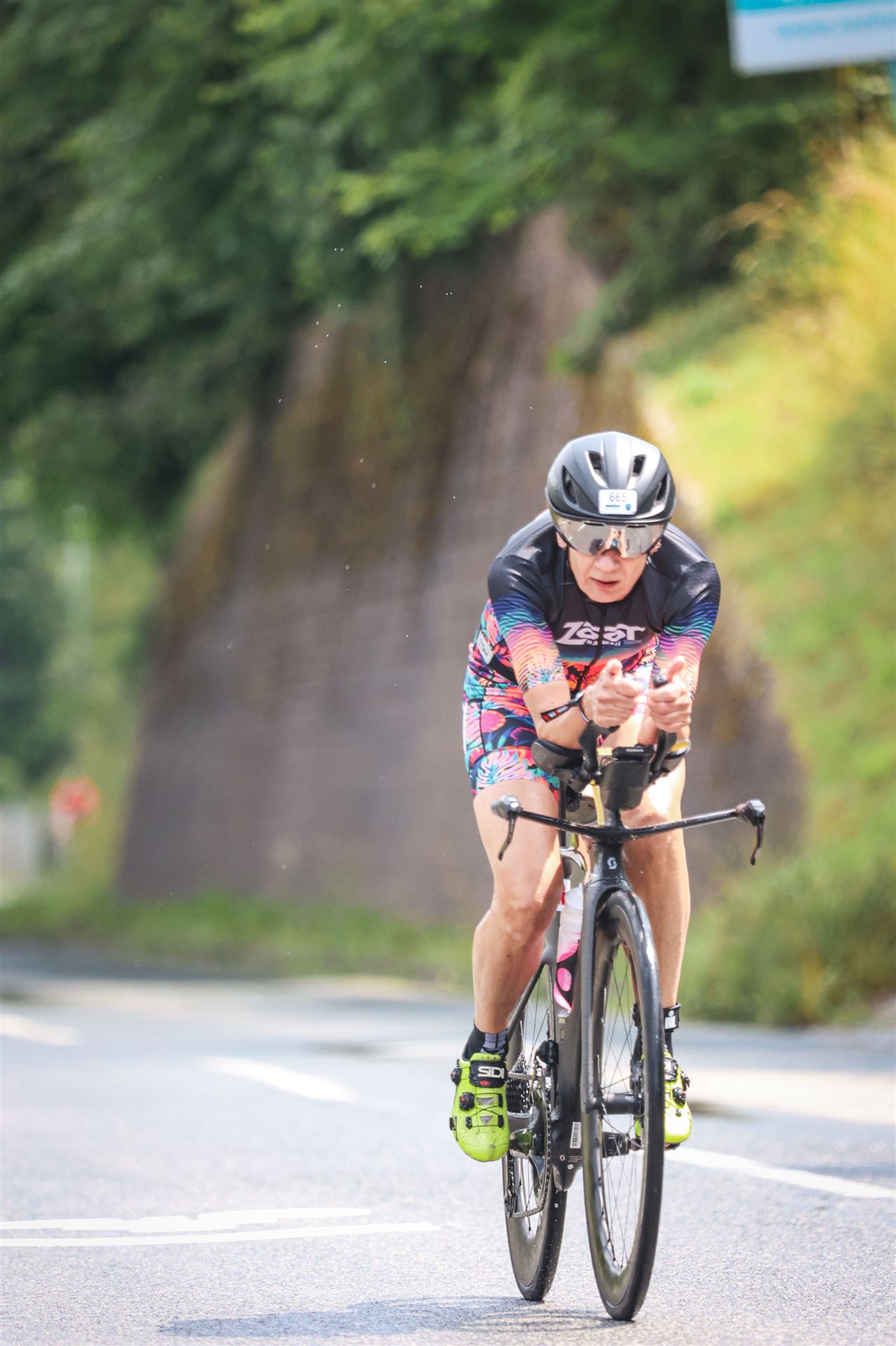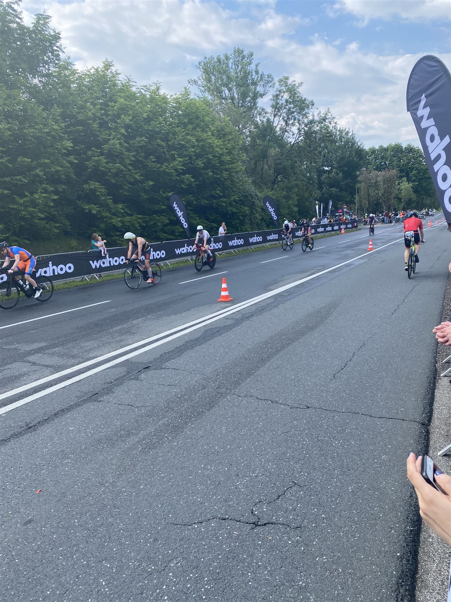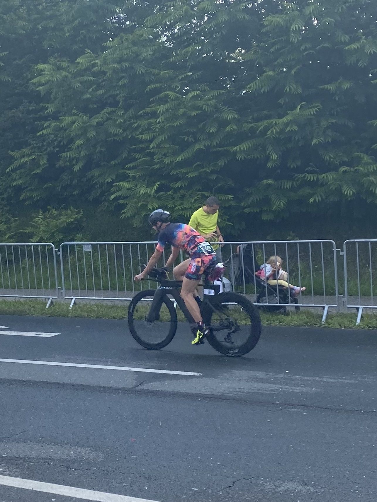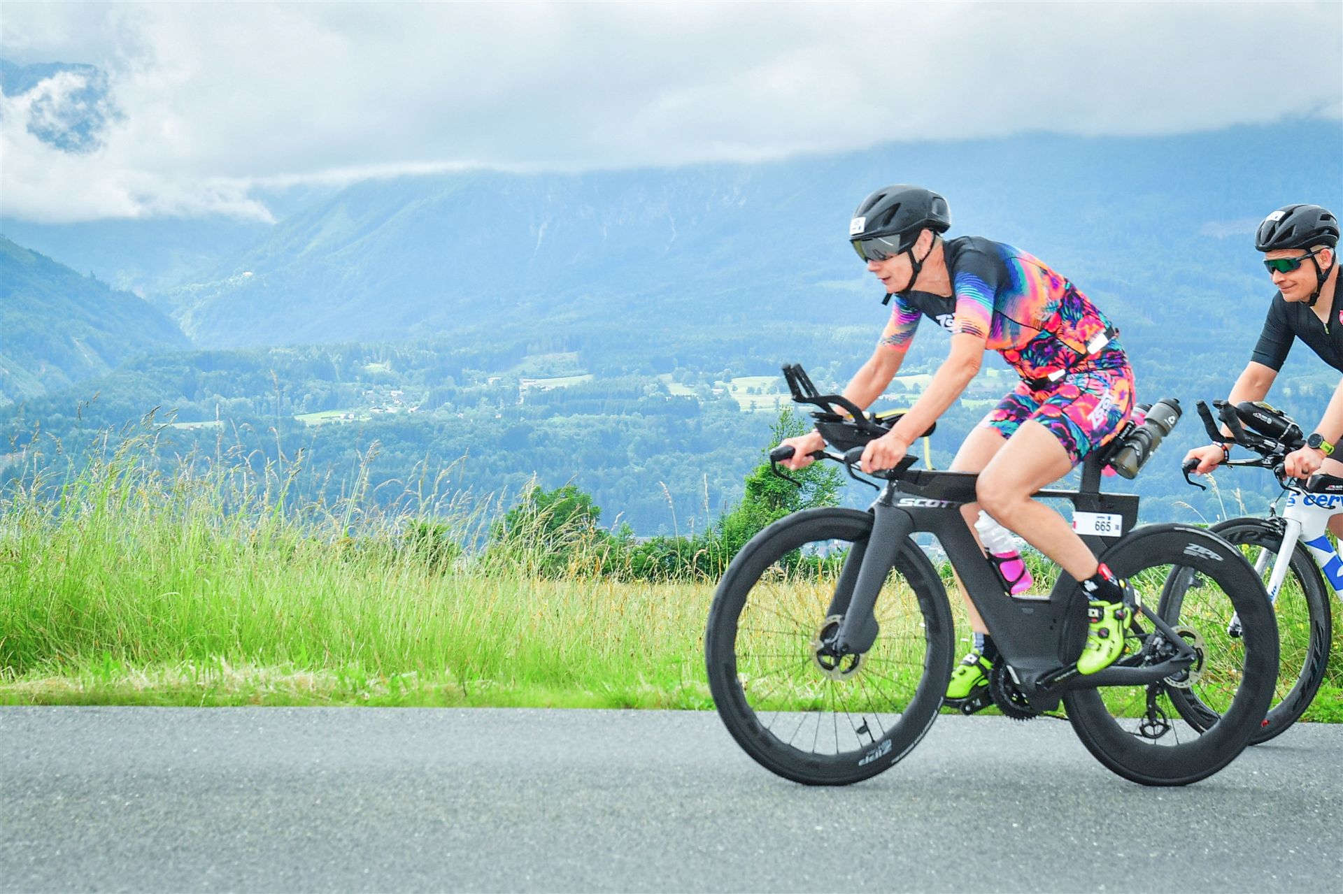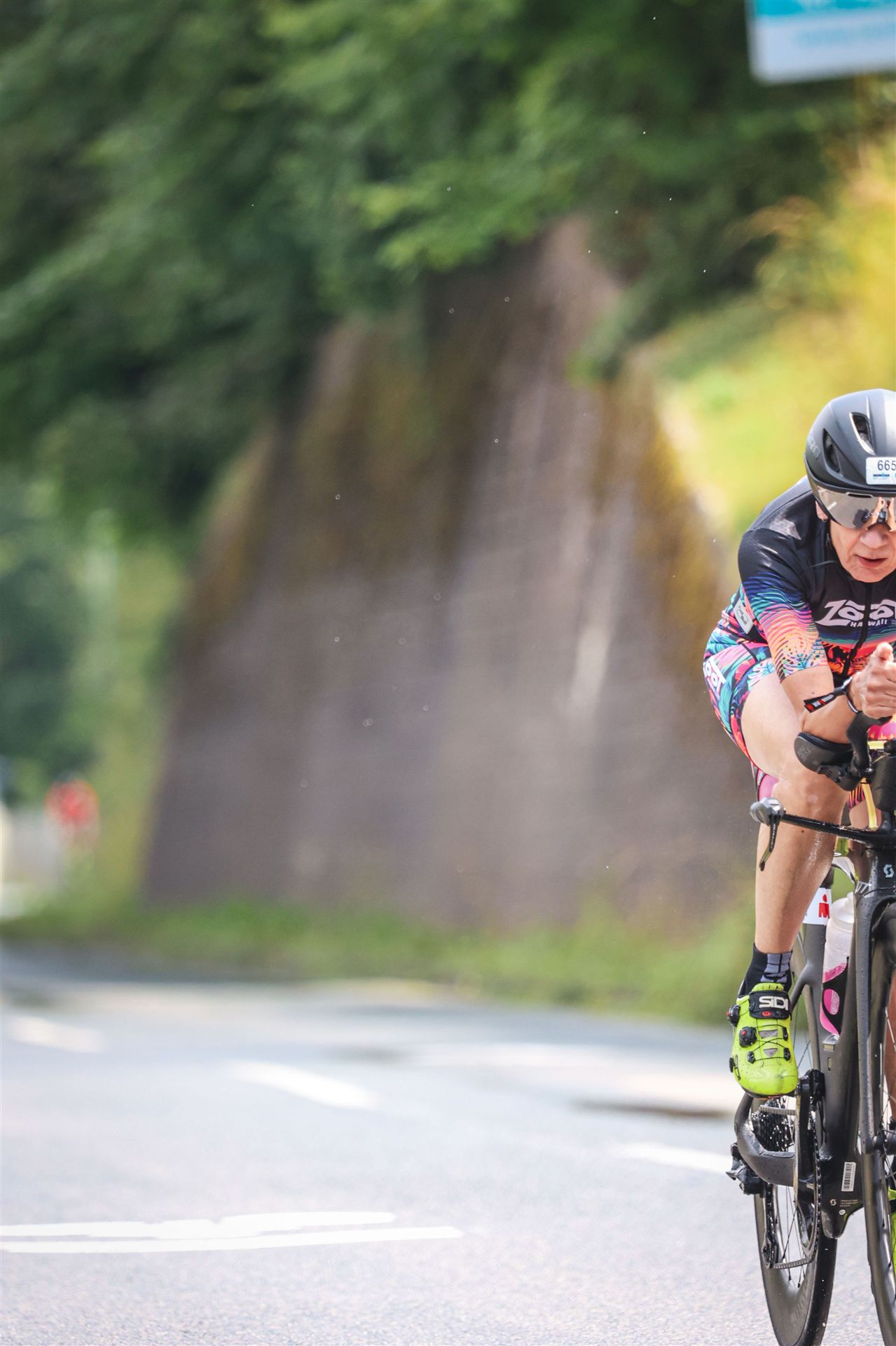 Aufgrund der für meine Verhältnisse niedrigen Temperaturen ziehe ich Socken mit klassischen Rennradschuhen sowie ein Trikot über. Das war die beste Entscheidung. Das erste Stück der Radstrecke führt am Wörthersee entlang. Die Straßen sind noch nass vom Regen, dafür ist die Aussicht traumhaft. Es lässt sich relativ gut fahren, durch den Rolling-Start ist das Feld nicht so dicht. Selbstverständlich muss man schauen, dass man keinen Windschatten fährt, es klappt aber ganz gut. Der erste längere Anstieg ist der Faaker See. Aufgrund der Wetterverhältnisse sind nicht viele Zuschauer am Anstieg. Ich kurble den Anstieg im kleinen Gang hoch, ist kein Problem für mich. Danach kommt ein flaches Stück, da gibt es immer relativ viel Gegenwind. Ich fühle mich sehr gut auf dem Rad, habe Druck auf den Pedalen und kann den Wettkampf genießen. Die Wettervorhersage passt leider nicht ganz zum tatsächlichen Wetter. Es gibt Strecken mit Starkregen, die Straßen sind sehr nass, bei den Abfahrten muss man aufpassen. Den zweiten längeren Anstieg (Ruperti Berg) fahre ich auch ohne Probleme, bei den Abfahrten muss man aufpassen. Der 180 Kilometerkurs besteht aus 2 Runden. Die Anstiege müssen zweimal gefahren werden. Auf der zweiten Runde sind die Steigungen dann doch etwas schwerer. Insgesamt bin ich mit meiner Radzeit von 6:01:37 Stunden sehr zu frieden.