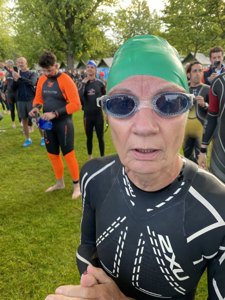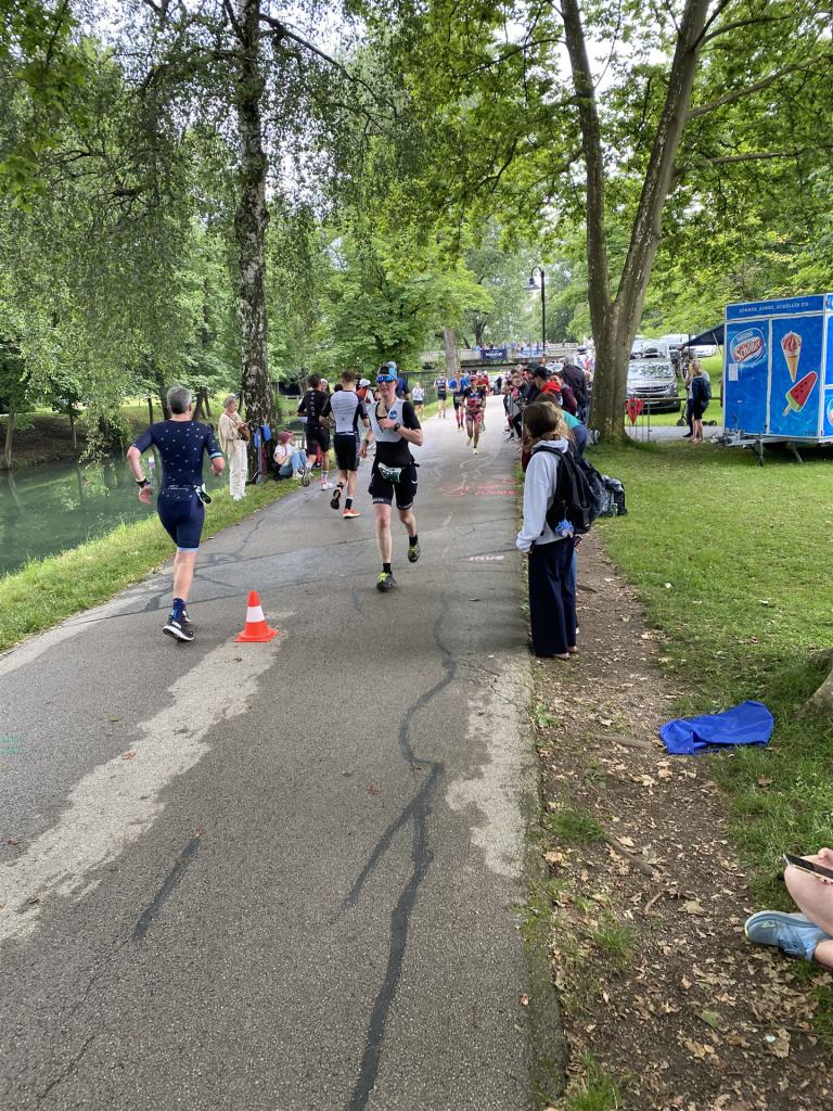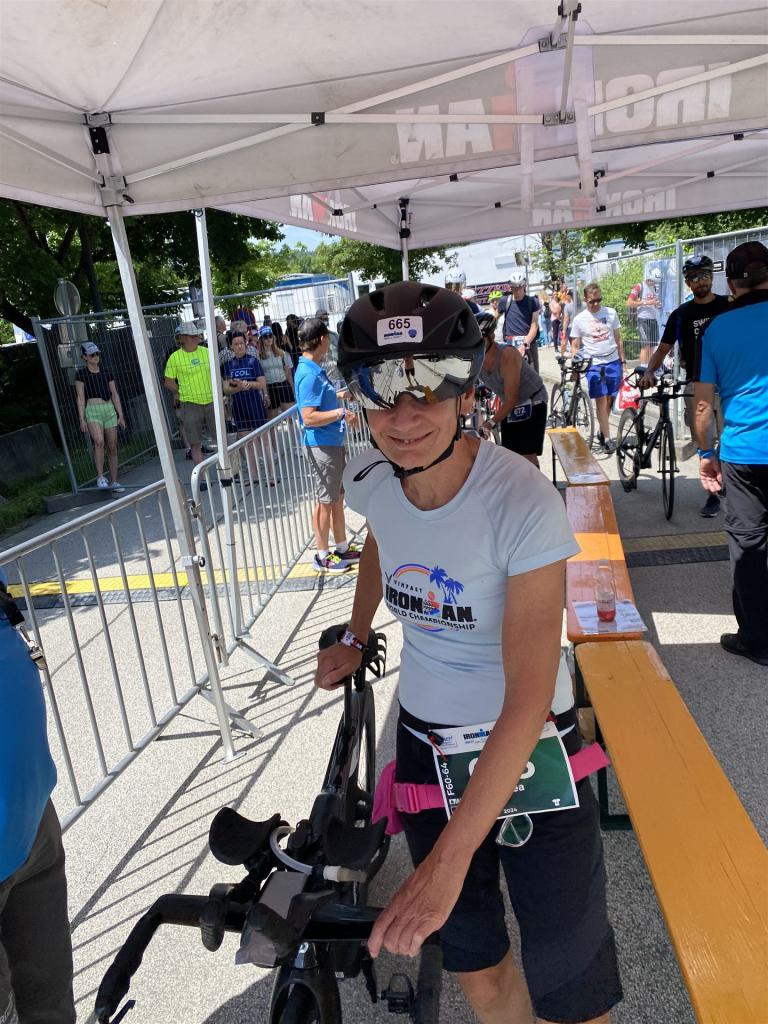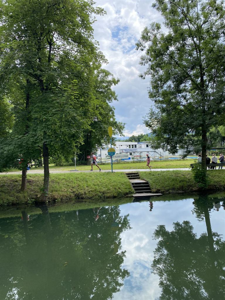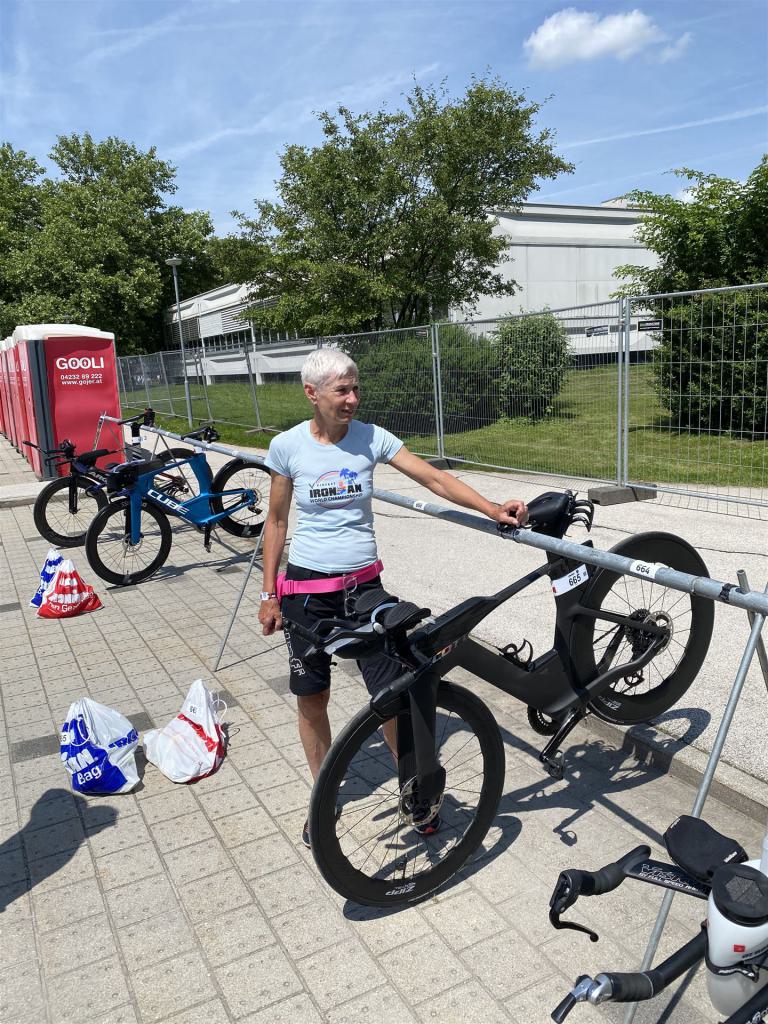 Geschwommen werden die 3,8 Kilometer im Wörthersee. Der See hat Trinkwasserqualität und ist relativ klar. Gestartet wird in Gruppen, man ordnet sich entsprechend der voraussichtlichen Schwimmzeit in eine Gruppe ein. Die Profimänner starteten um 6:30 Uhr, es gab keine Profifrauen. Ab 6:40 Uhr gingen die Agegrouper ins Wasser. Da ich keine Uhr beim Wettkampf trage konnte ich nicht einschätzen, wie lange es gedauert hat, bis ich ins Wasser konnte. Alle 5 Sekunden gingen 4 Athleten ins Wasser. Das Schwimmen war relativ entspannt, ich wurde nicht oft überholt und habe auch wenige Athleten überholt. Ich denke, die meisten Athleten haben sich korrekt eingeordnet. Der erste Streckenabschnitt klappt super, ich kann die Bojen sehr gut erkennen. Beim Rückweg in Richtung Lendkanal hatte ich leichte Schwierigkeiten mit den Bojen. War aber nicht schlimm für mich, ich habe mich an den anderen Athleten orientiert. Den Eingang zum Lendkanal konnte ich nicht erkennen, ohne Brille und dann noch direkt die Sonne, da habe mich absolut auf die anderen verlassen. Erstaunlicherweise hielt sich das Gedränge im Lendkanal auch in Grenzen, ich hatte mich Mental auf dichtes Gedränge und evtl. auch Schläge eingestellt. Nichts davon ist passiert. Das Schöne an diesem Kanal sind die Zuschauer auf beiden Seiten, die Stimmung ist super. Der Schwimmausstieg ist am Parkhotel, die Strecke bis in die Wechselzone ist relativ lang. Ich komme als 2. Frau in meiner AK aus dem Wasser. Mit meiner Schwimmzeit von 1:19:50 bin ich zufrieden.