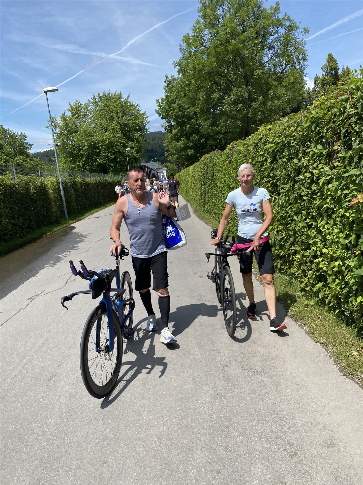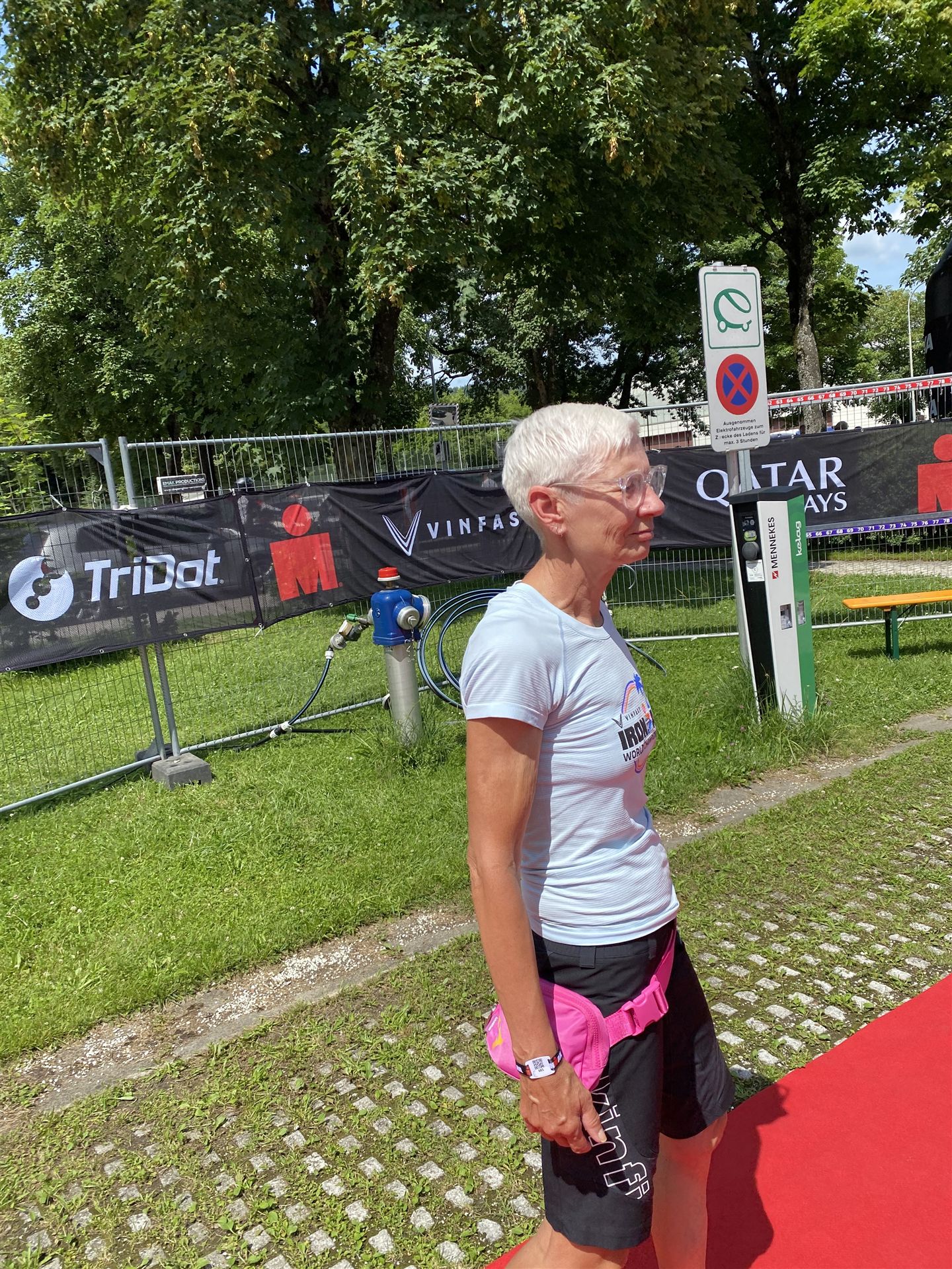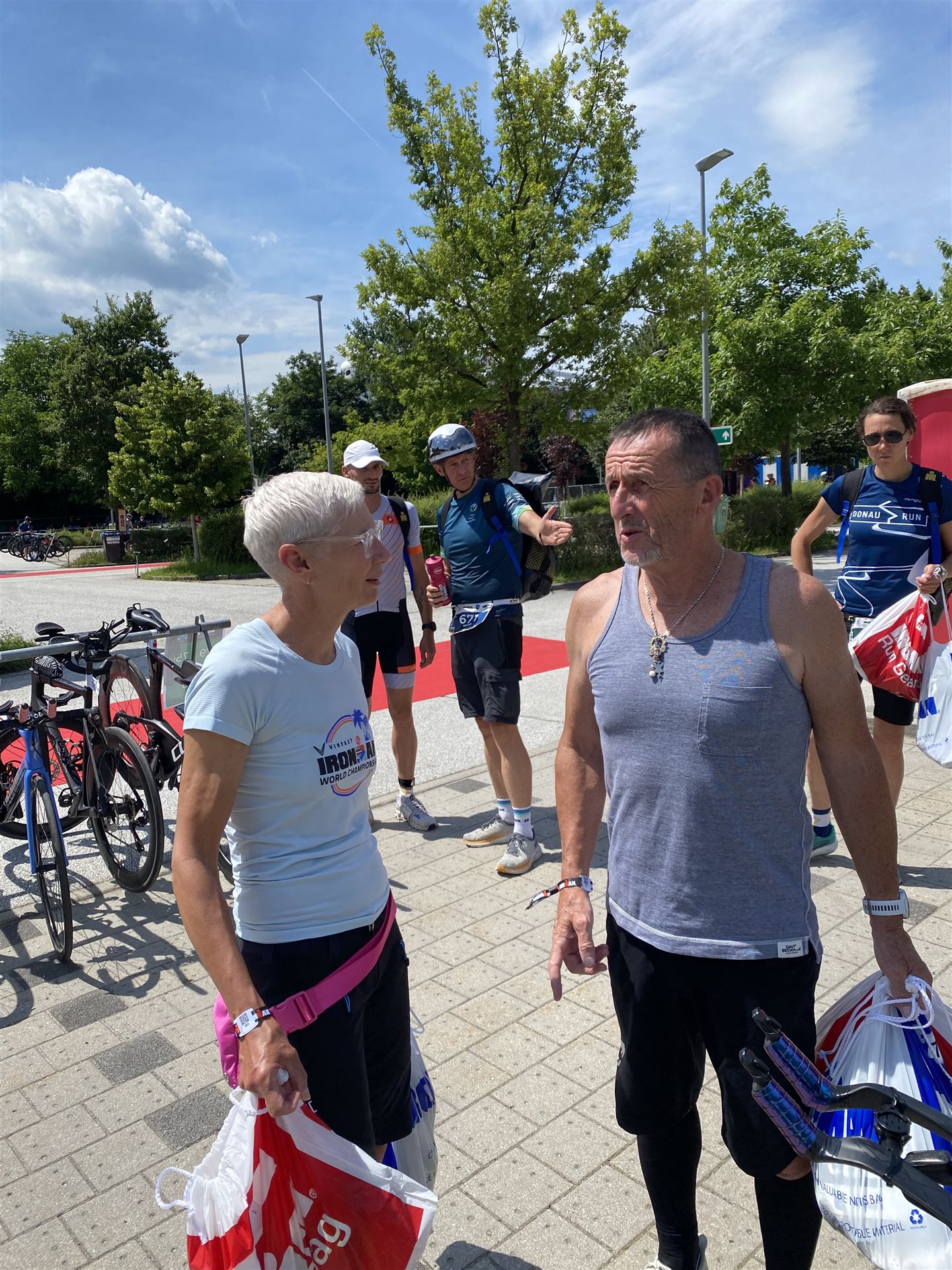 Geschwommen werden die 3,8 Kilometer im Wörthersee. Der See hat Trinkwasserqualität und ist relativ klar. Gestartet wird in Gruppen, man ordnet sich entsprechend der voraussichtlichen Schwimmzeit in eine Gruppe ein. Die Profimänner starteten um 6:30 Uhr, es gab keine Profifrauen. Ab 6:40 Uhr gingen die Agegrouper ins Wasser. Da ich keine Uhr beim Wettkampf trage konnte ich nicht einschätzen, wie lange es gedauert hat, bis ich ins Wasser konnte. Alle 5 Sekunden gingen 4 Athleten ins Wasser. Das Schwimmen war relativ entspannt, ich wurde nicht oft überholt und habe auch wenige Athleten überholt. Ich denke, die meisten Athleten haben sich korrekt eingeordnet. Der erste Streckenabschnitt klappt super, ich kann die Bojen sehr gut erkennen. Beim Rückweg in Richtung Lendkanal hatte ich leichte Schwierigkeiten mit den Bojen. War aber nicht schlimm für mich, ich habe mich an den anderen Athleten orientiert. Den Eingang zum Lendkanal konnte ich nicht erkennen, ohne Brille und dann noch direkt die Sonne, da habe mich absolut auf die anderen verlassen. Erstaunlicherweise hielt sich das Gedränge im Lendkanal auch in Grenzen, ich hatte mich Mental auf dichtes Gedränge und evtl. auch Schläge eingestellt. Nichts davon ist passiert. Das Schöne an diesem Kanal sind die Zuschauer auf beiden Seiten, die Stimmung ist super. Der Schwimmausstieg ist am Parkhotel, die Strecke bis in die Wechselzone ist relativ lang. Ich komme als 2. Frau in meiner AK aus dem Wasser. Mit meiner Schwimmzeit von 1:19:50 bin ich zufrieden.