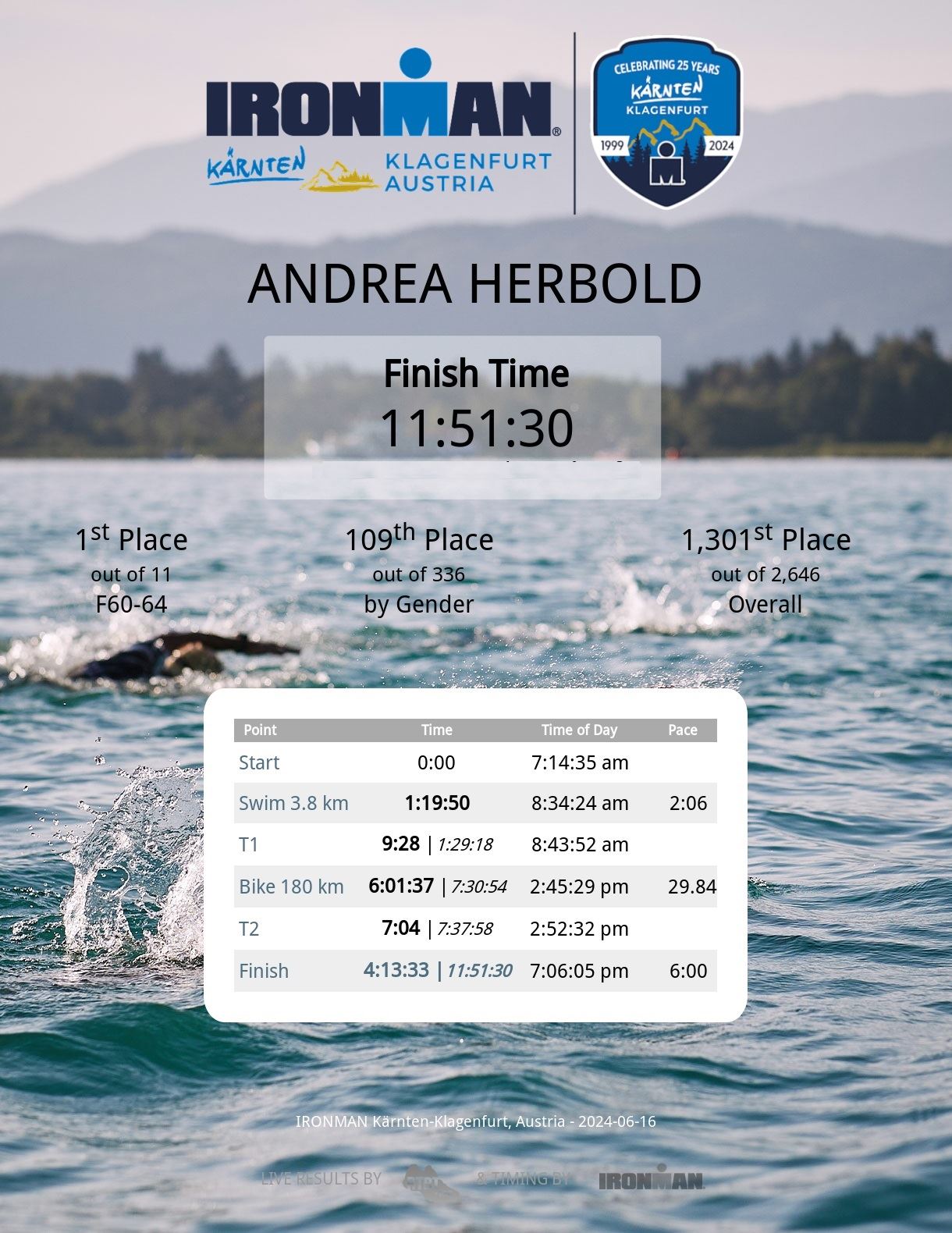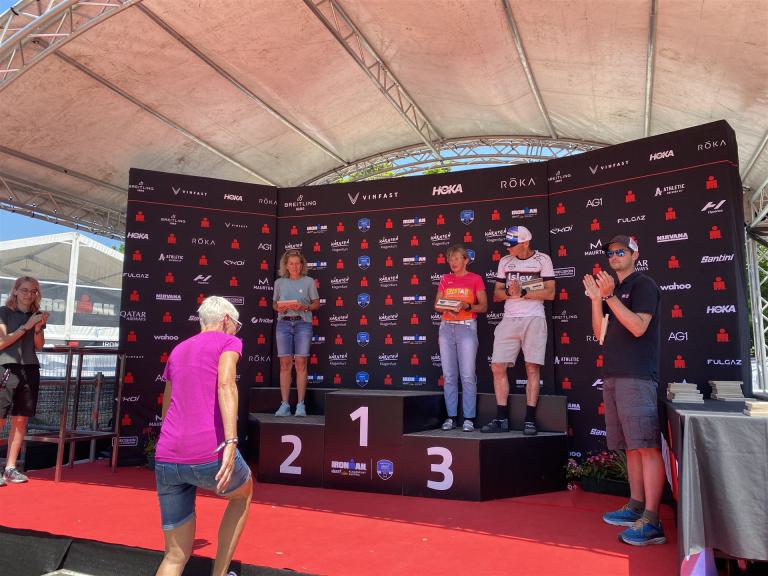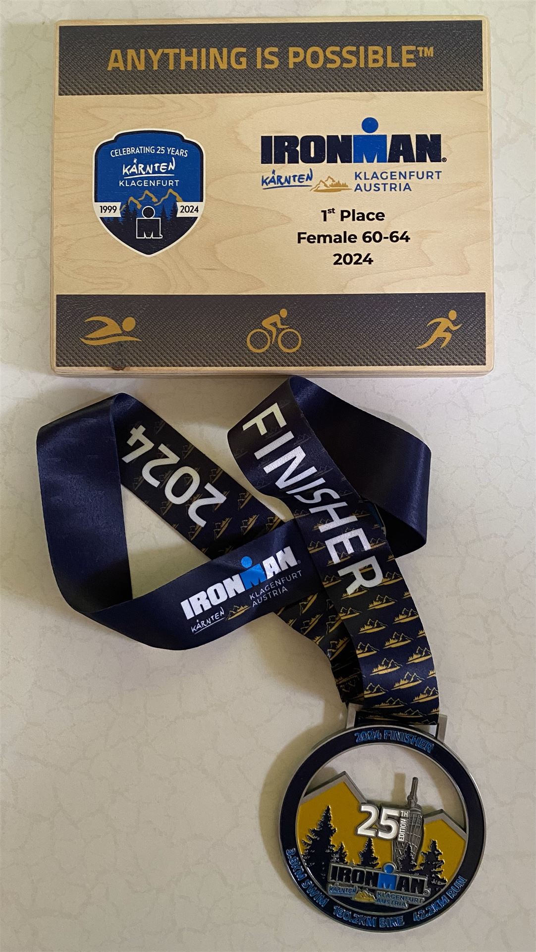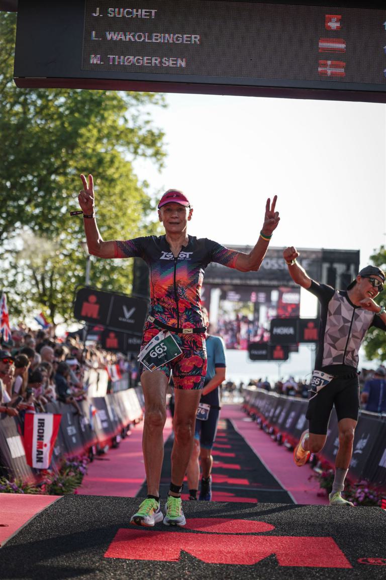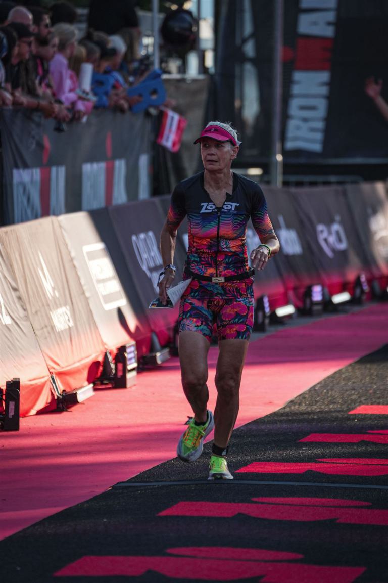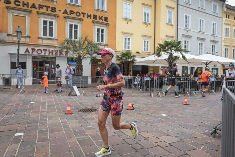Ab in die Wechselzone und die Radschuhe mit den Laufschuhen tauschen. Aufgrund der Temperatur entscheide ich mich, mein Trikot anzulassen. Ich gehe als erste Frau in meiner AK mit einem Vorsprung von circa 18 Minuten auf die Laufstrecke. Nach dem ersten Kilometer geht es mir nicht so gut, ich fühle mich schlapp. Das kenne ich überhaupt nicht von mir. Anscheinend habe ich auf dem Rad nicht ausreichend gegessen. Normalerweise kann ich nach dem Rad direkt ohne Probleme los laufen, dieses Mal habe ich Probleme. Ich entscheide mich bis zur ersten Verpflegungsstelle Gehpausen einzulegen. An der ersten Verpflegungsstelle bin ich vorbei gelaufen, keine Ahnung weshalb. Das ist Wettkampf, da passieren solche Dingen. Bei der 2. Verpflegungsstelle nehme ich mir etwas Zeit und esse und trinke ordentlich. Danach geht es mir viel besser. Nach den ersten 10 Kilometern konnte ich meinen Vorsprung auf die Zweite bereits etwas ausbauen. Ich halte bei jeder Verpflegungsstelle an und nehme Flüssigkeit bzw. Gel zu mir. Der Vorsprung wird immer größer. Werner hält mich auf dem Laufenden. Ab circa Kilometer 32 habe ich Probleme mit der Verpflegung. Ich kann nichts mehr aufnehmen, mein Magen rebelliert. Ich entscheide spontan, dass ich es mit Cola probiere. Die Strategie geht auf, mein Magen rebelliert nicht mehr. Da ich bereits einen Vorsprung von über 45 Minuten auf den letzten 10 Kilometern habe gehe ich auf Nummer sicher. Ich nehme nur noch Cola zu mir und lege die ein- oder andere Gehpause ein. Ich bin zuversichtlich als Erste ins Ziel zu kommen. Bei Kilometer 39 bin ich schon leicht euphorisch, laufe jedoch weiter verhalten. Kein unnötiges Risiko eingehen. Bei Kilometer 41 fange ich an innerlich zu jubeln. Auf dem letzten Kilometer sind alle Probleme vergessen, es geht in Richtung Ziel. Der Zieleinlauf ist für jeden Athleten etwas Besonderes. Direkt im Ziel wartet bereits Werner auf mich und überreicht mir die Finisher Medaille. Das ist ein toller Moment. Natürlich habe ich, wie immer, vergessen auf meine Endzeit zu schauen. Wichtig für mich ist, ins Ziel zu kommen. Natürlich freut man sich, wenn dann noch eine gute Zeit bzw. Platzierung raus komm. Den Marathon bin ich in einer Zeit von 4:13:33 gelaufen. Meine Gesamtzeit beträgt 11:51:30 Stunden. Wahnsinn, ich bin total begeistert mit dieser Zeit gefinisht zu haben. Die Zweite in meiner AK kommt erst 1:17 Stunden nach mir ins Ziel. Es ist toll wieviel Zeit ich noch rauslaufen konnte. Es war wieder ein tolles Erlebnis in Klagenfurt und ich bin dankbar bei diesem Jubiläum dabei sein zu können. Nach dem Wettkampf gibt es noch eine Woche Urlaub und Erholung, danach geht der Focus auf die Weltmeisterschaft in Nizza.