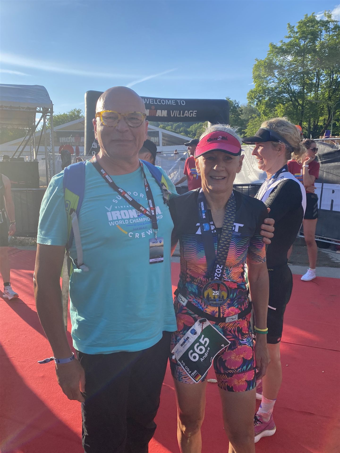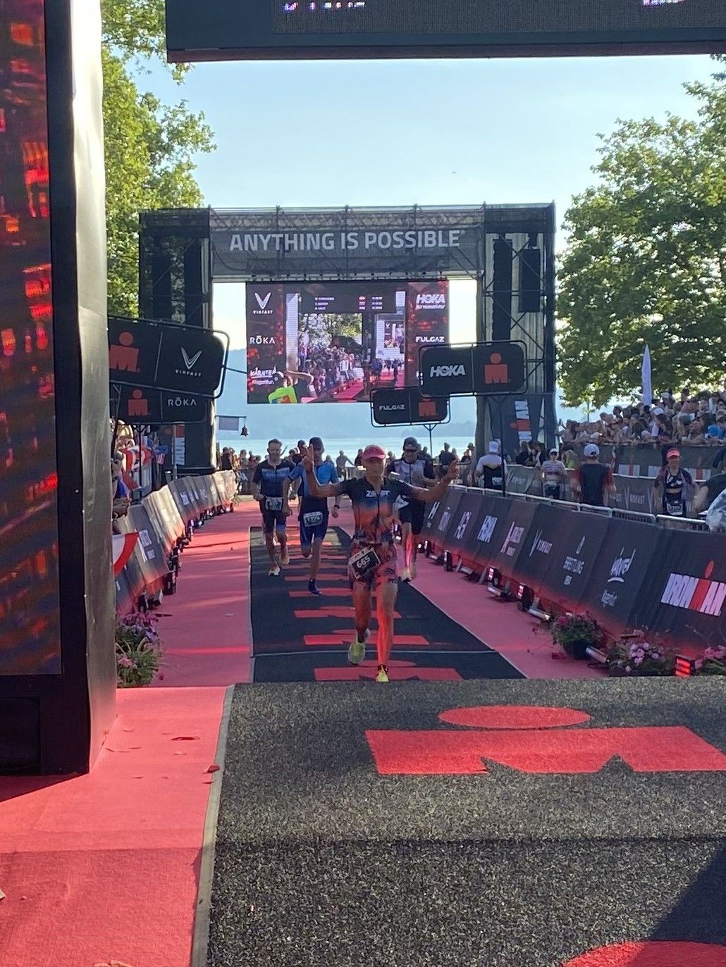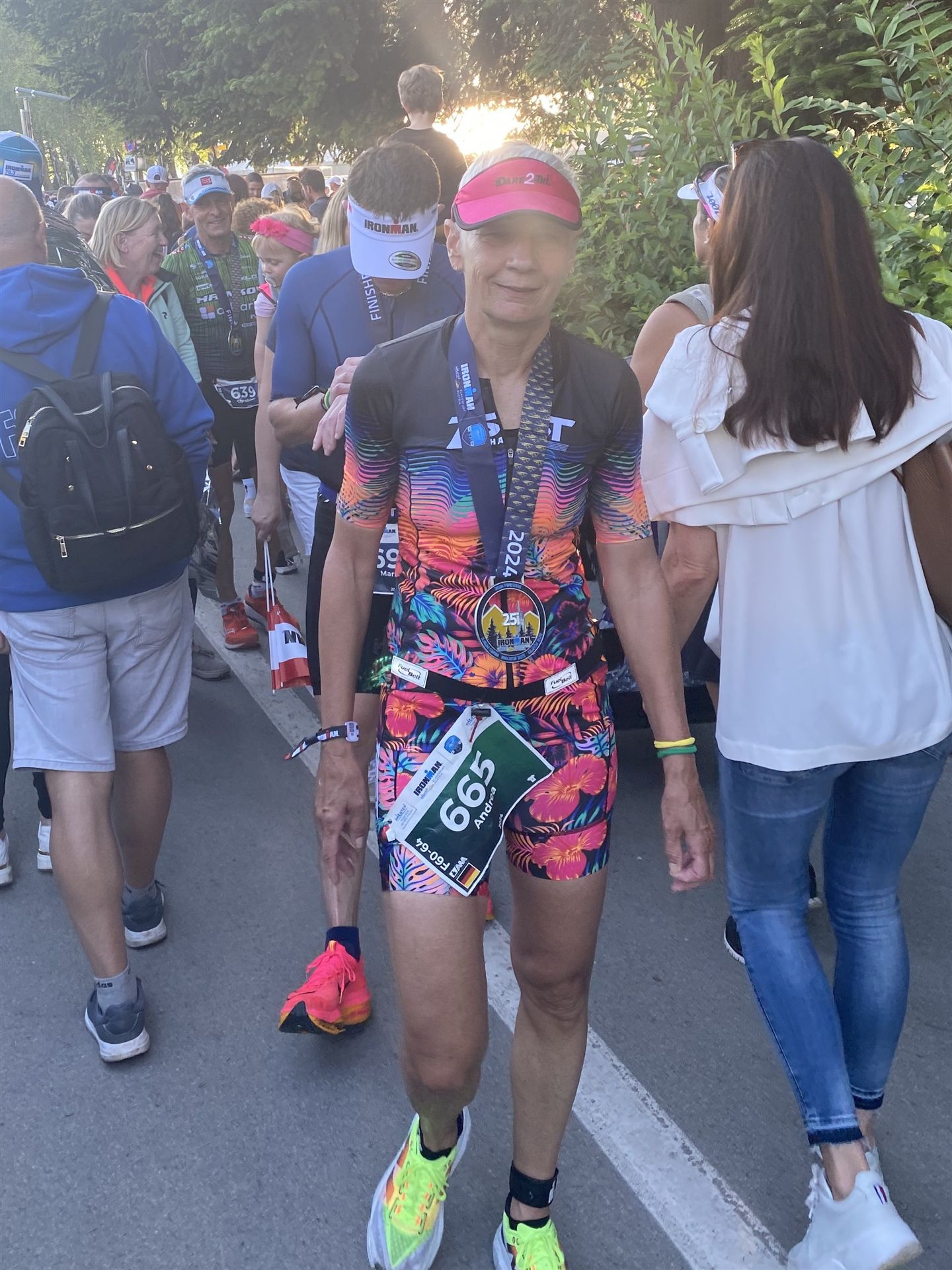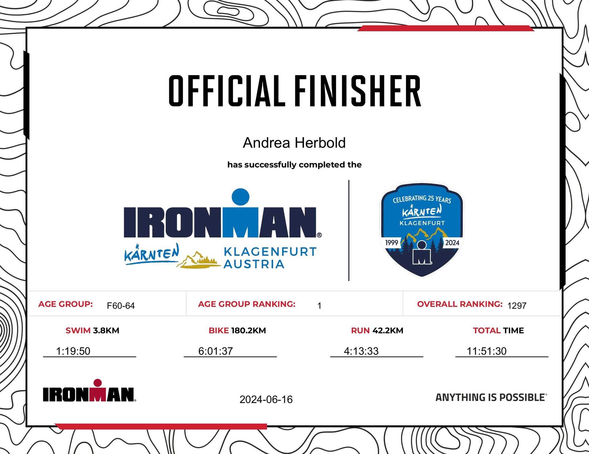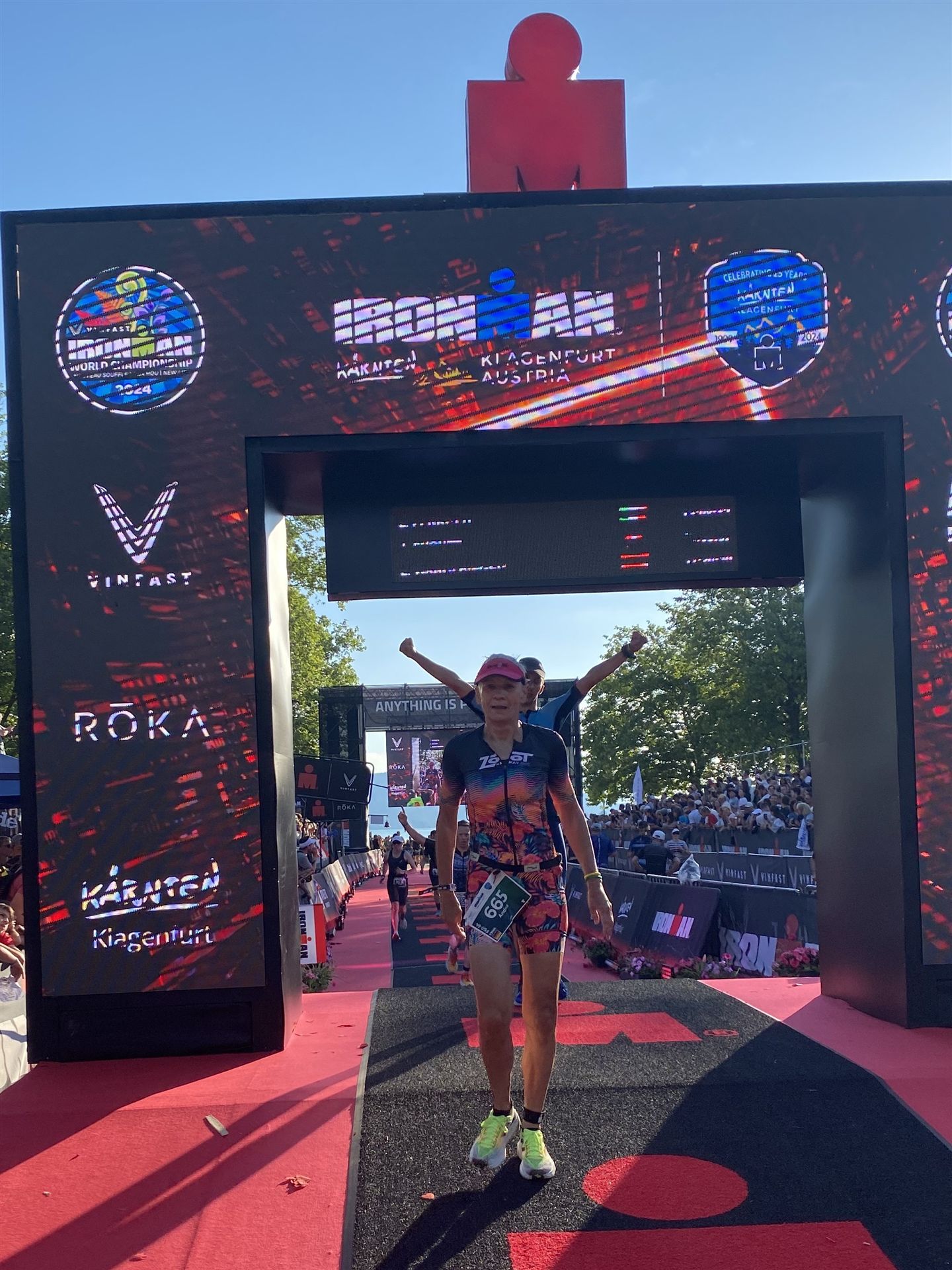 Ab in die Wechselzone und die Radschuhe mit den Laufschuhen tauschen. Aufgrund der Temperatur entscheide ich mich, mein Trikot anzulassen. Ich gehe als erste Frau in meiner AK mit einem Vorsprung von circa 18 Minuten auf die Laufstrecke. Nach dem ersten Kilometer geht es mir nicht so gut, ich fühle mich schlapp. Das kenne ich überhaupt nicht von mir. Anscheinend habe ich auf dem Rad nicht ausreichend gegessen. Normalerweise kann ich nach dem Rad direkt ohne Probleme los laufen, dieses Mal habe ich Probleme. Ich entscheide mich bis zur ersten Verpflegungsstelle Gehpausen einzulegen. An der ersten Verpflegungsstelle bin ich vorbei gelaufen, keine Ahnung weshalb. Das ist Wettkampf, da passieren solche Dingen. Bei der 2. Verpflegungsstelle nehme ich mir etwas Zeit und esse und trinke ordentlich. Danach geht es mir viel besser. Nach den ersten 10 Kilometern konnte ich meinen Vorsprung auf die Zweite bereits etwas ausbauen. Ich halte bei jeder Verpflegungsstelle an und nehme Flüssigkeit bzw. Gel zu mir. Der Vorsprung wird immer größer. Werner hält mich auf dem Laufenden. Ab circa Kilometer 32 habe ich Probleme mit der Verpflegung. Ich kann nichts mehr aufnehmen, mein Magen rebelliert. Ich entscheide spontan, dass ich es mit Cola probiere. Die Strategie geht auf, mein Magen rebelliert nicht mehr. Da ich bereits einen Vorsprung von über 45 Minuten auf den letzten 10 Kilometern habe gehe ich auf Nummer sicher. Ich nehme nur noch Cola zu mir und lege die ein- oder andere Gehpause ein. Ich bin zuversichtlich als Erste ins Ziel zu kommen. Bei Kilometer 39 bin ich schon leicht euphorisch, laufe jedoch weiter verhalten. Kein unnötiges Risiko eingehen. Bei Kilometer 41 fange ich an innerlich zu jubeln. Auf dem letzten Kilometer sind alle Probleme vergessen, es geht in Richtung Ziel. Der Zieleinlauf ist für jeden Athleten etwas Besonderes. Direkt im Ziel wartet bereits Werner auf mich und überreicht mir die Finisher Medaille. Das ist ein toller Moment. Natürlich habe ich, wie immer, vergessen auf meine Endzeit zu schauen. Wichtig für mich ist, ins Ziel zu kommen. Natürlich freut man sich, wenn dann noch eine gute Zeit bzw. Platzierung raus komm. Den Marathon bin ich in einer Zeit von 4:13:33 gelaufen. Meine Gesamtzeit beträgt 11:51:30 Stunden. Wahnsinn, ich bin total begeistert mit dieser Zeit gefinisht zu haben. Die Zweite in meiner AK kommt erst 1:17 Stunden nach mir ins Ziel. Es ist toll wieviel Zeit ich noch rauslaufen konnte. Es war wieder ein tolles Erlebnis in Klagenfurt und ich bin dankbar bei diesem Jubiläum dabei sein zu können. Nach dem Wettkampf gibt es noch eine Woche Urlaub und Erholung, danach geht der Focus auf die Weltmeisterschaft in Nizza.