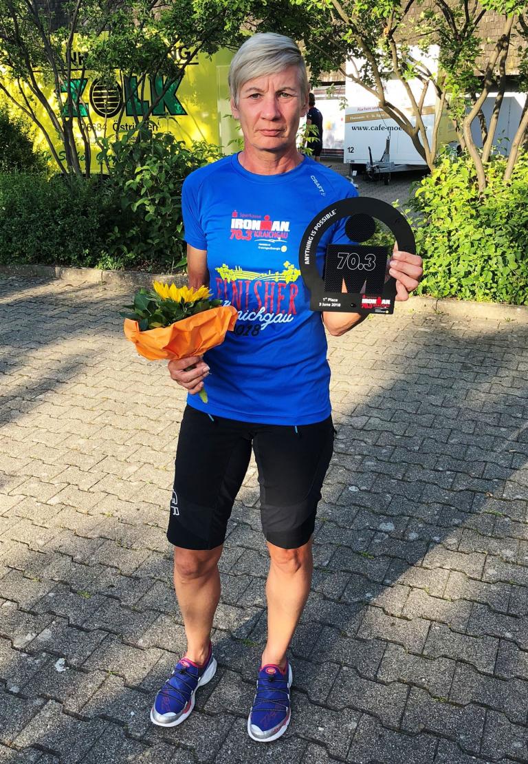 Beim Einstieg in die 2. Rad Runde hat mir mein Mann zugerufen, dass ich auf dem ersten Platz in meiner Altersklasse bin. Das motiviert dann noch einmal zusätzlich. Auf der zweiten Runde war mir die Strecke dann schon besser bekannt und etwas einfacher zu fahren. Nach 6:00:17 bin ich vom Rad gestiegen (für mich eine tolle Zeit mit einem 30’er Schnitt).