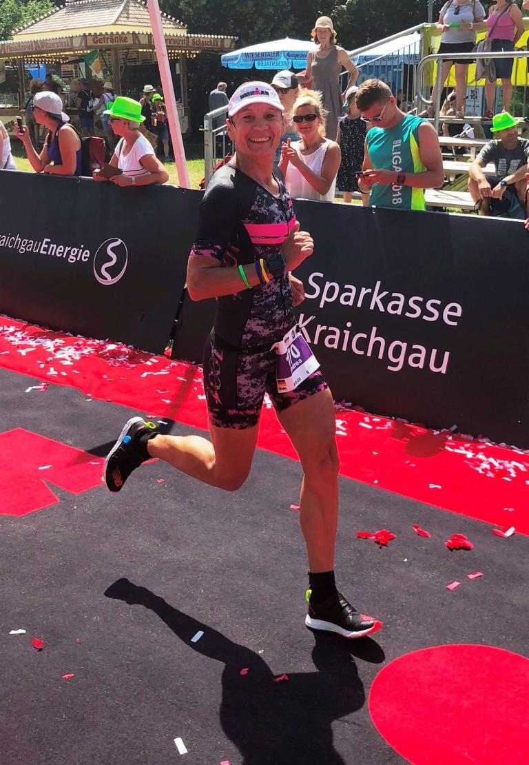 Geschwommen wurde im Hardtsee in Ubstadt-Weiher. Bei einer Wassertemperatur von 23,7 Grad durften wir mit Neo schwimmen, für die Profis galt Neoverbot. Mit einer Schwimmzeit von 36:25 ging ich als 3. Frau in meiner AK aus dem Wasser.