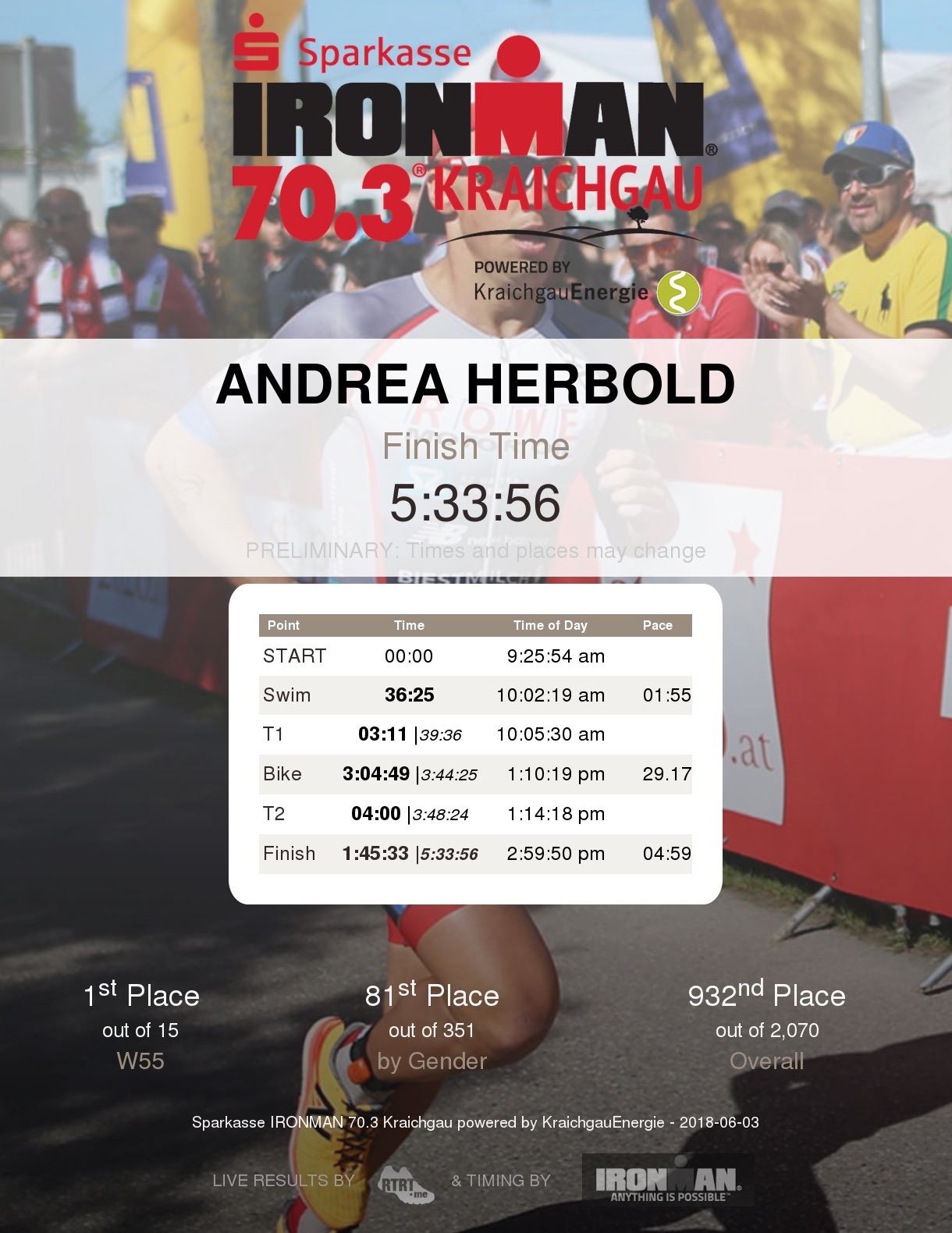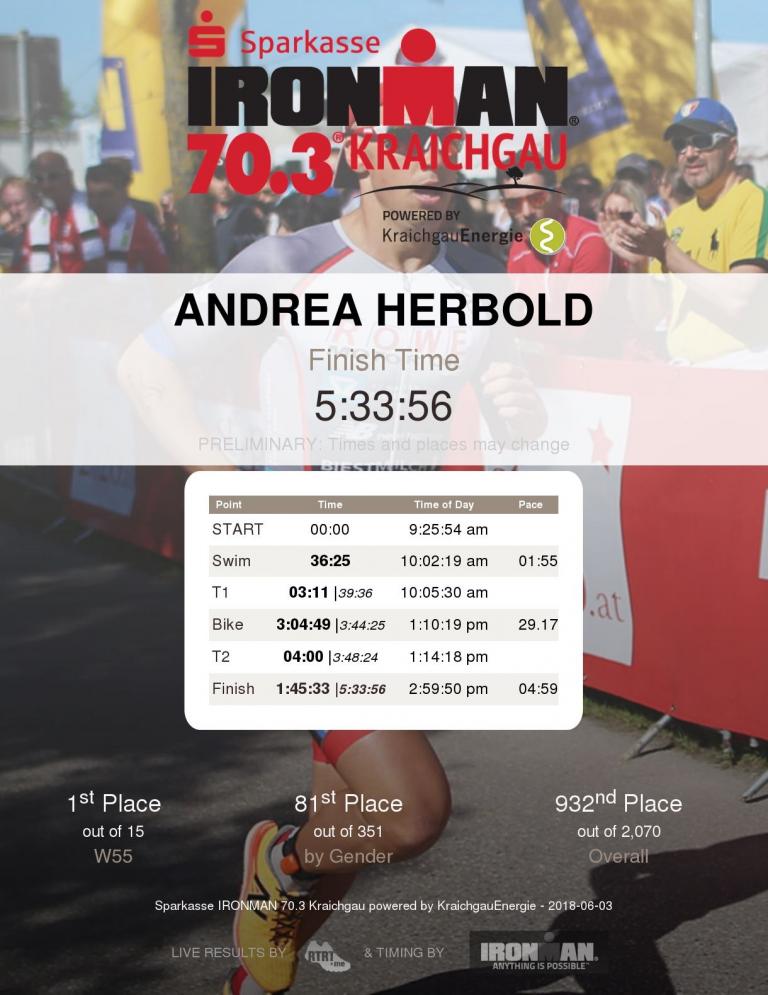 Mit diesem Platz war für mich klar, ich muss Gas geben. Trotz Hitze versuchte ich ein konstantes und zügiges Tempo zu laufen. 3 Runden a 7 Kilometer mit einigen kleinen Anstiegen und viel Sonne. Bei Temperaturen um die 30 Grad war man um jede Abkühlung dankbar. Einige Anwohner standen mit dem Gartenschlauch an der Strecke und gaben den Athleten die Möglichkeit sich etwas abzukühlen. Den Halbmarathon konnte ich in einer Zeit von 1:45:33 laufen. Nach insgesamt 5:33:56 ging ich nach einem tollen Wettkampf und einem 1. Platz in der AK 55 durchs Ziel. Ich hatte nicht damit gerechnet, solch eine Platzierung zu erreichen. Jetzt gibt es einige Tage lockeres Training und dann geht es zum Endspurt für die Langdistanz. Das teilweise sehr harte Training der letzten Wochen und Monaten hat sich definitiv bereits jetzt gelohnt.