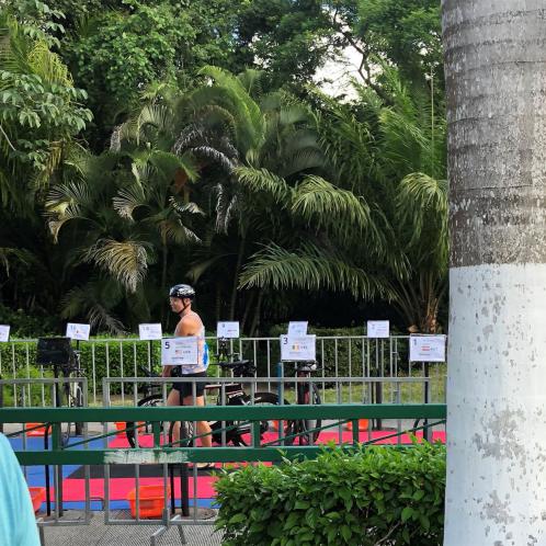 Um kurz vor 7:00 Uhr ist die Nacht vorbei. Da es relativ früh dunkel wird, steht man auch entsprechend früh auf. Nach dem Frühstück geht es mit dem Rad los. Einmal die Wettkampfstrecke abfahren, sprich einmal um die Insel. Inzwischen sind einige Athleten unterwegs. Es gibt einen tollen Radweg, der fast komplett parallel zur Straße geht. Es gibt kaum Verkehr, der Wind ist okay, die Wettkampfstrecke ohne Überraschungen. Unterwegs gibt es sogar Schilder mit dem Hinweis Athleten im Training. Eine Runde sind circa 63 Kilometer, fast alles mit Radweg. Nur das Stück durch die Stadt ist etwas blöd, der Rest jedoch perfekt. Im Anschluss an das Rad fahren stehen noch 30 Minuten lockere Grundlage Laufen auf dem Plan. Danach liegen wir etwas im Schatten am Pool. Inzwischen sind noch einige Athleten im Club angekommen. Zum Abendessen gibt es heute mal Buffet, danach noch etwas chillen und dann ab ins Bett.