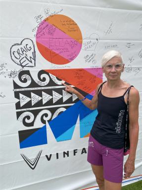 Es sind ganz viele Helfer mit Luftpumpen unterwegs. Man darf keine eigene Pumpe mitbringen/verwenden. Eine Dame ist auch gleich mit einer Luftpumpe gekommen. Leider hat die Pumpe nicht funktioniert. Die Dame war jedoch sehr nett und hat sich gleich auf die Suche einer anderen Pumpe gemacht. Während ich mein Rad aufpumpe hält die Dame mein Rad und leuchtet mir, damit ich den Druck sehen kann. Nach dem ich alles noch einmal überprüft habe beschließe ich aus der Wechselzone zu gehen.