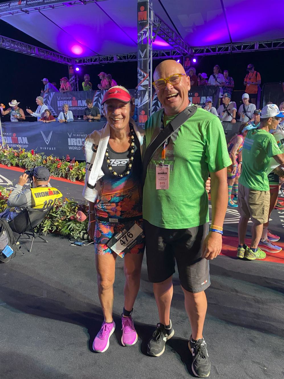 Man hört die Stimme „You are an Ironman“ und das Highlight dieses Wettkampfes ist, dass Werner im Ziel auf mich wartet und mir die Finisher Medaille und das Handtuch überreicht.